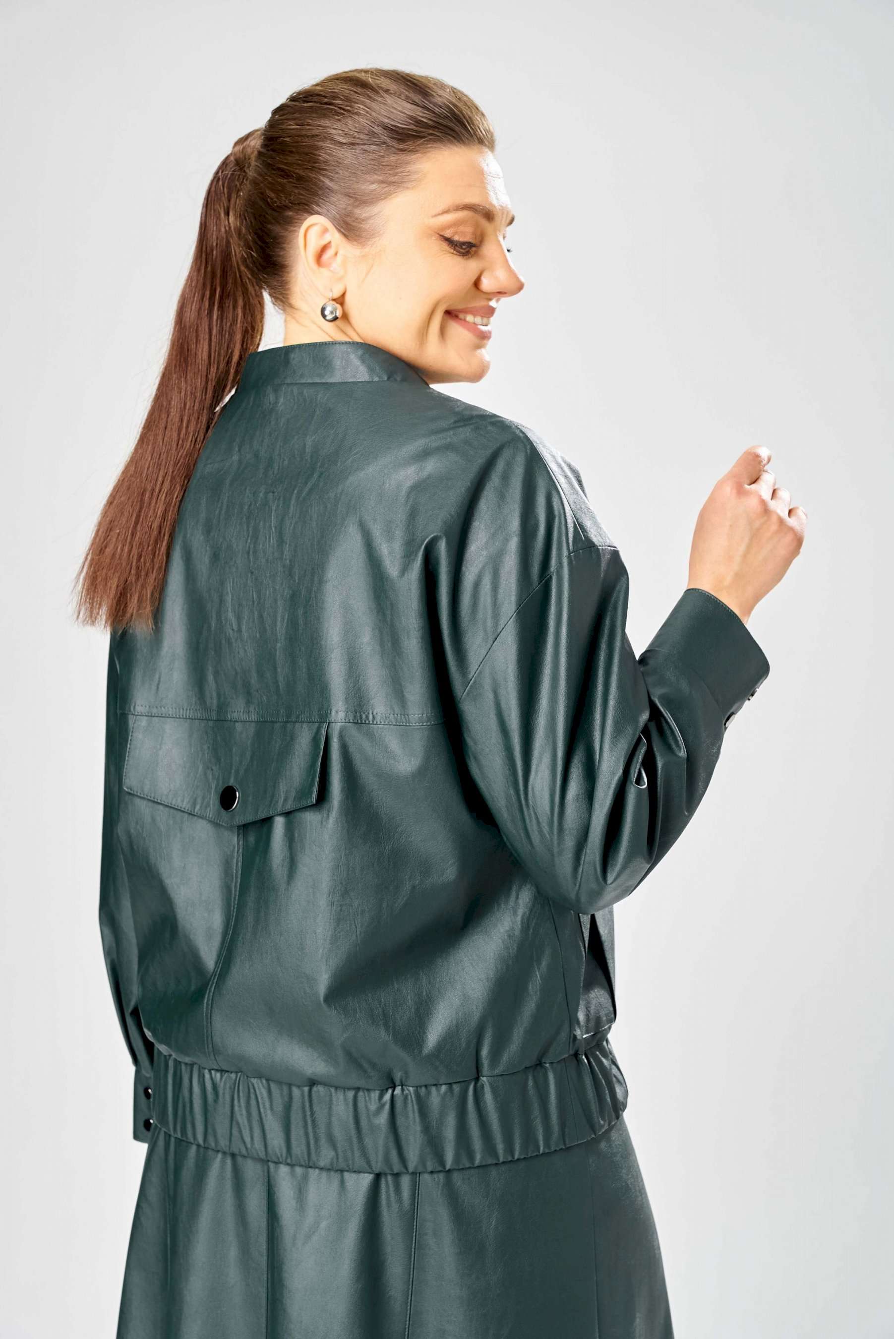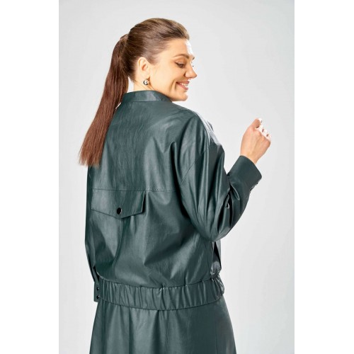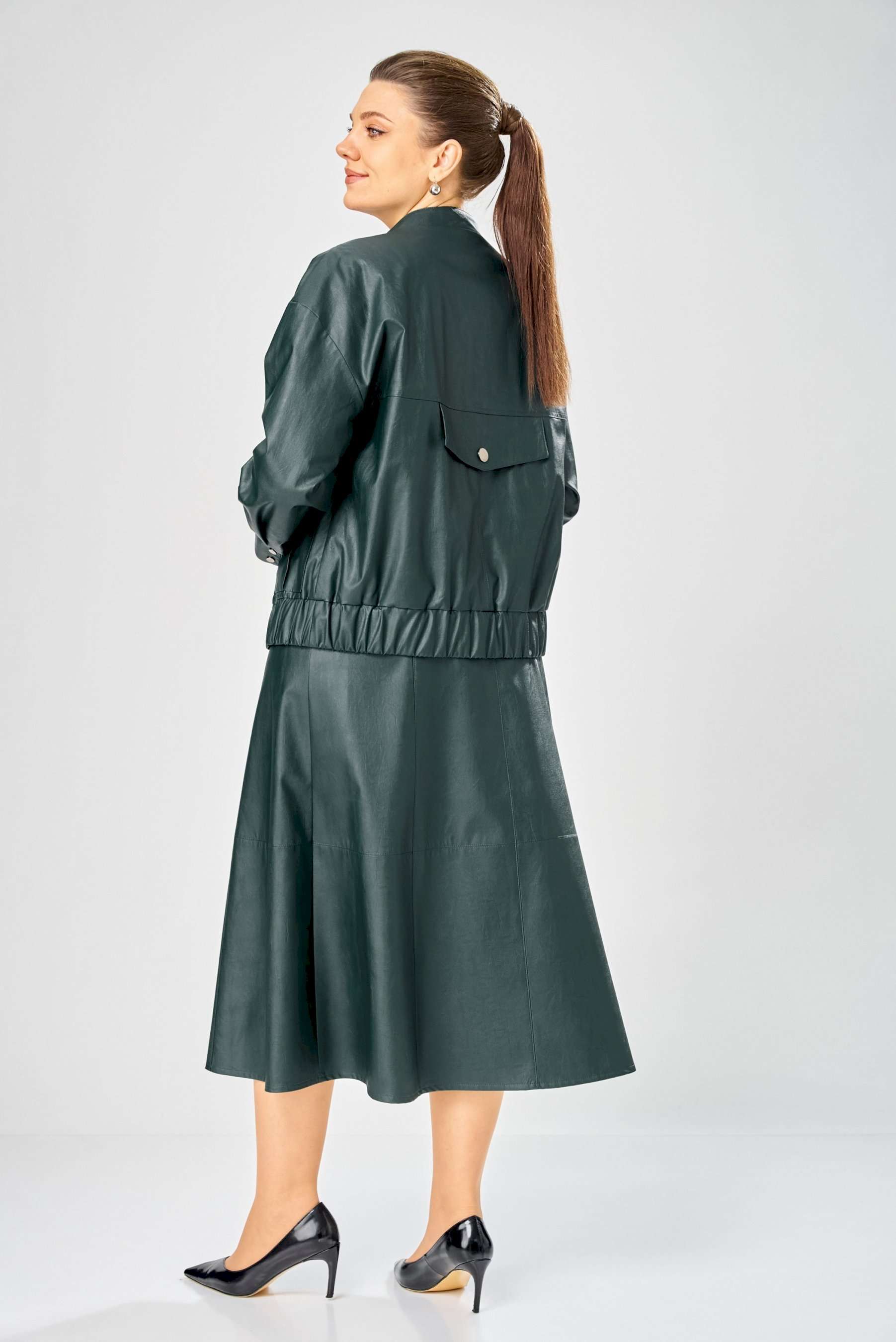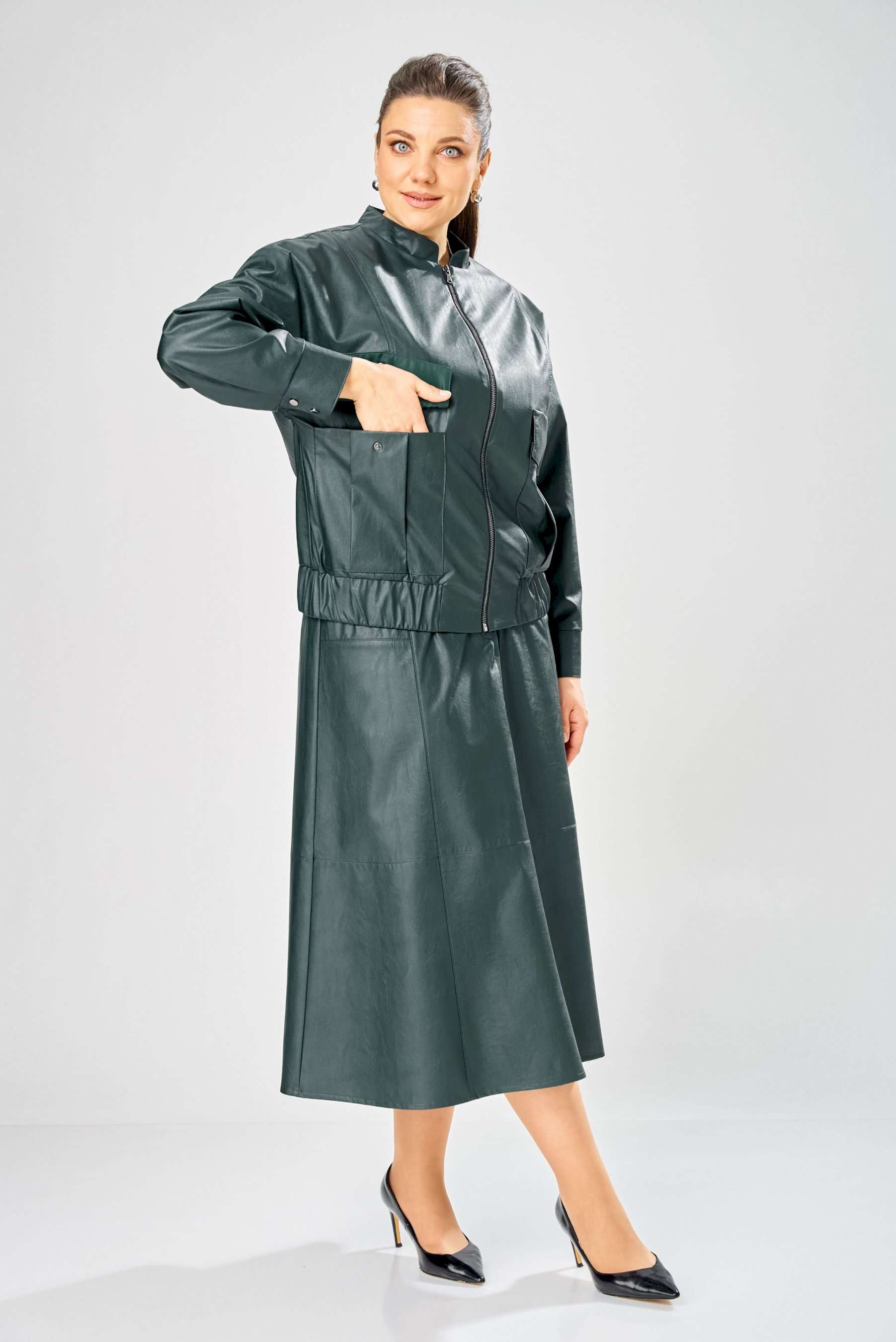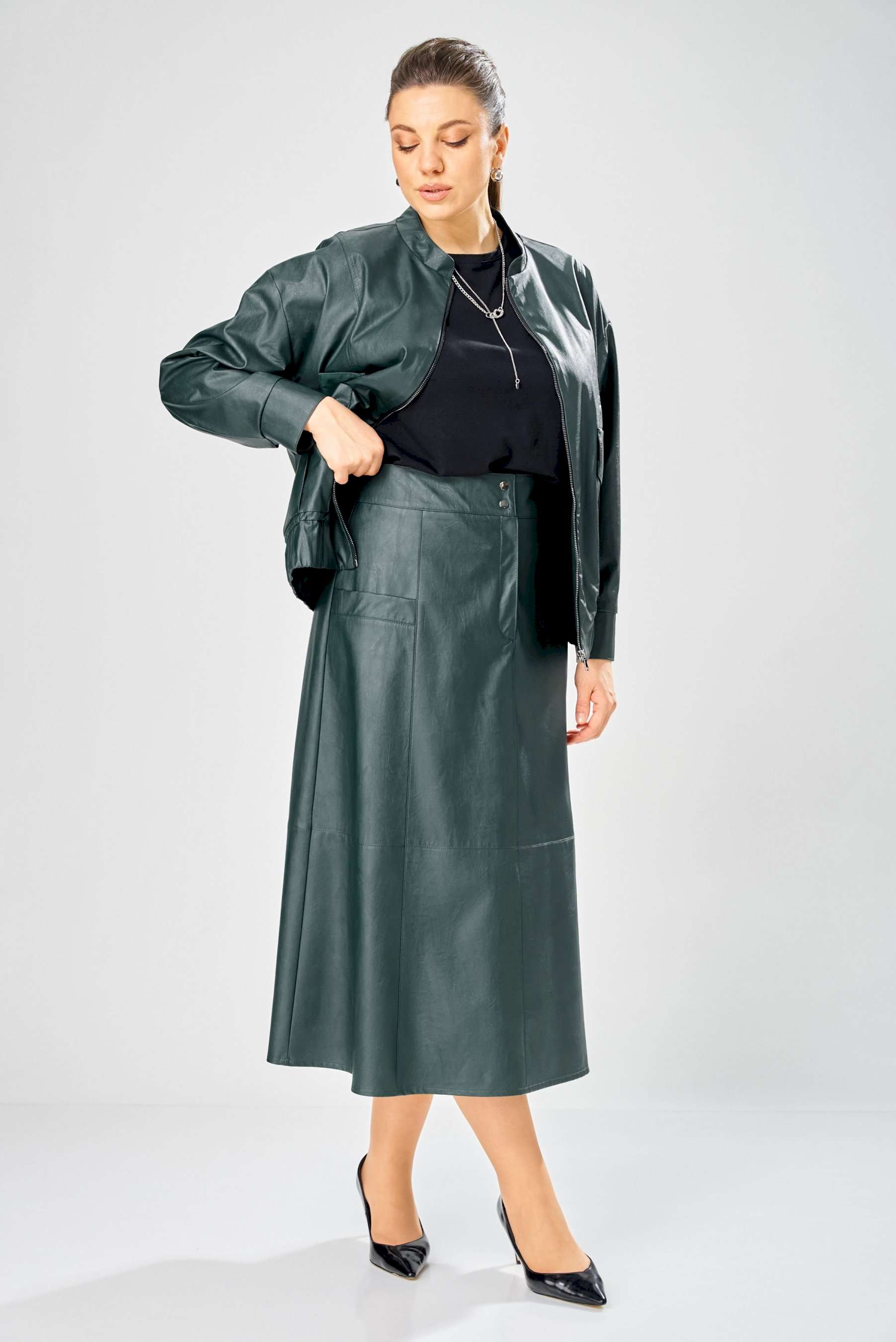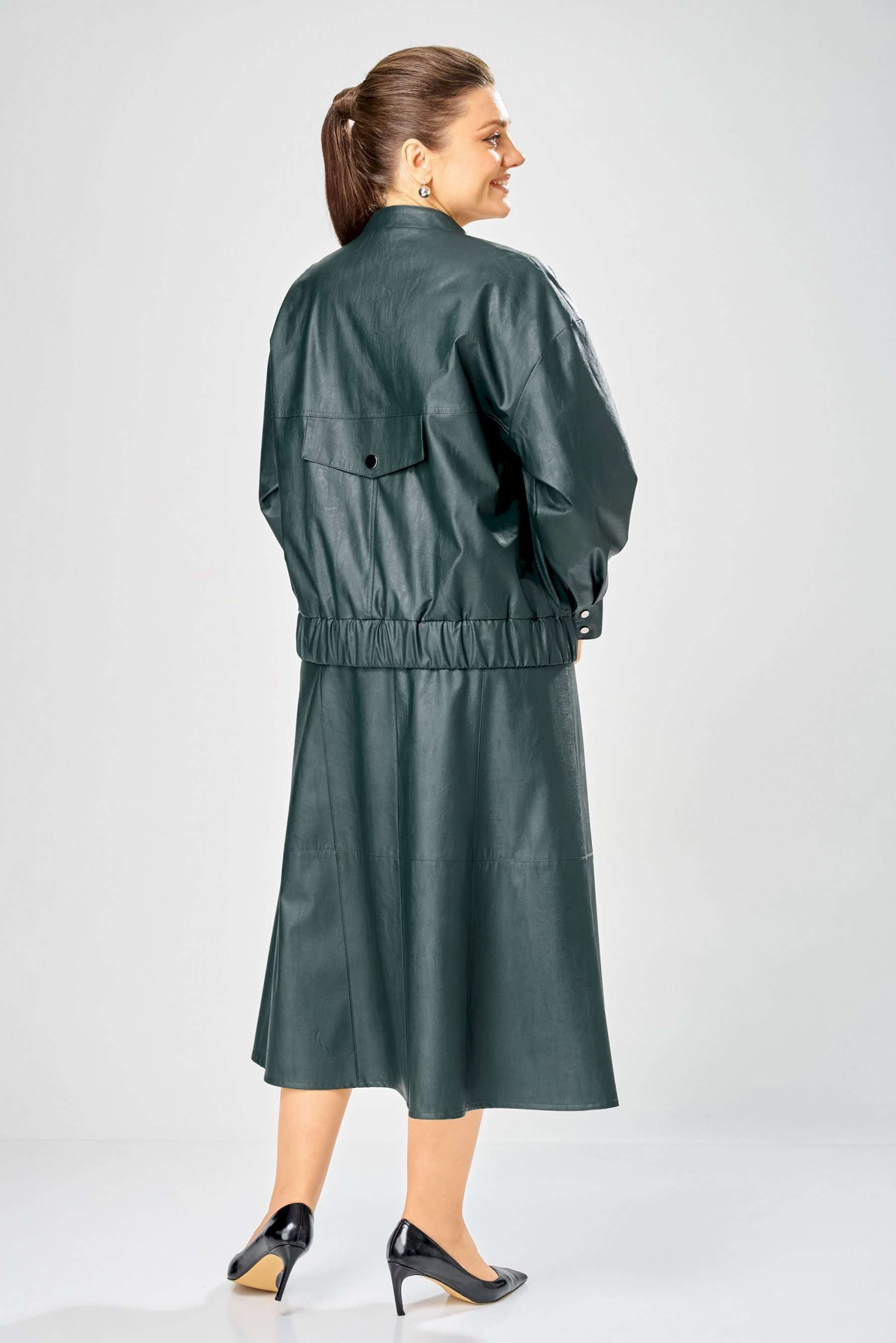 Стильный женский комплект, выполнен из эко-кожи. Куртка свободного силуэта, застегивается на молнию, по переду накладные карманы с клапаном и декоративной кнопкой. Головина оформлена воротником стойка. По спинке отрезная кокетка с клапаном. Рукава со спущенной поймой, по низу притачной манжет с застежкой на кнопки. По низу куртки, притачная планка с резинкой. Куртка на подкладке. Юбка «А» образного силуэта, по переду и спинке рельефные швы, по переду от рельефа до бокового шва, карманы с листочкой, застежка на молнию в центральном шве переда. Верх юбки на поясе с застежкой на кнопки. Юбка на подкладке. Длина куртки – 62 см Длина рукава – 50 см Длина юбки – 87 см