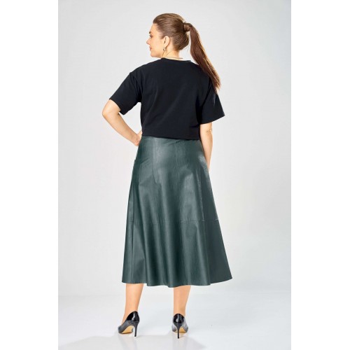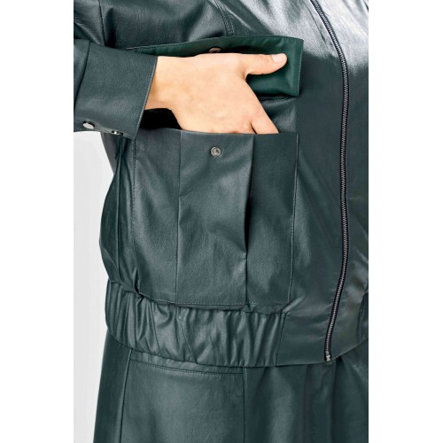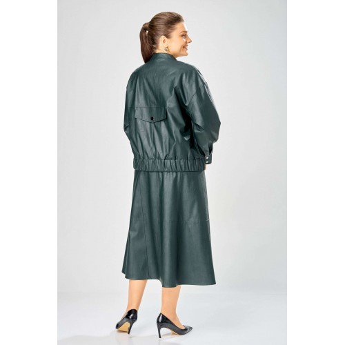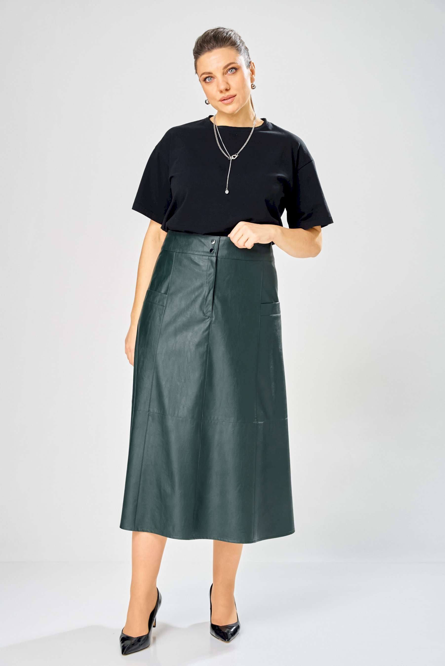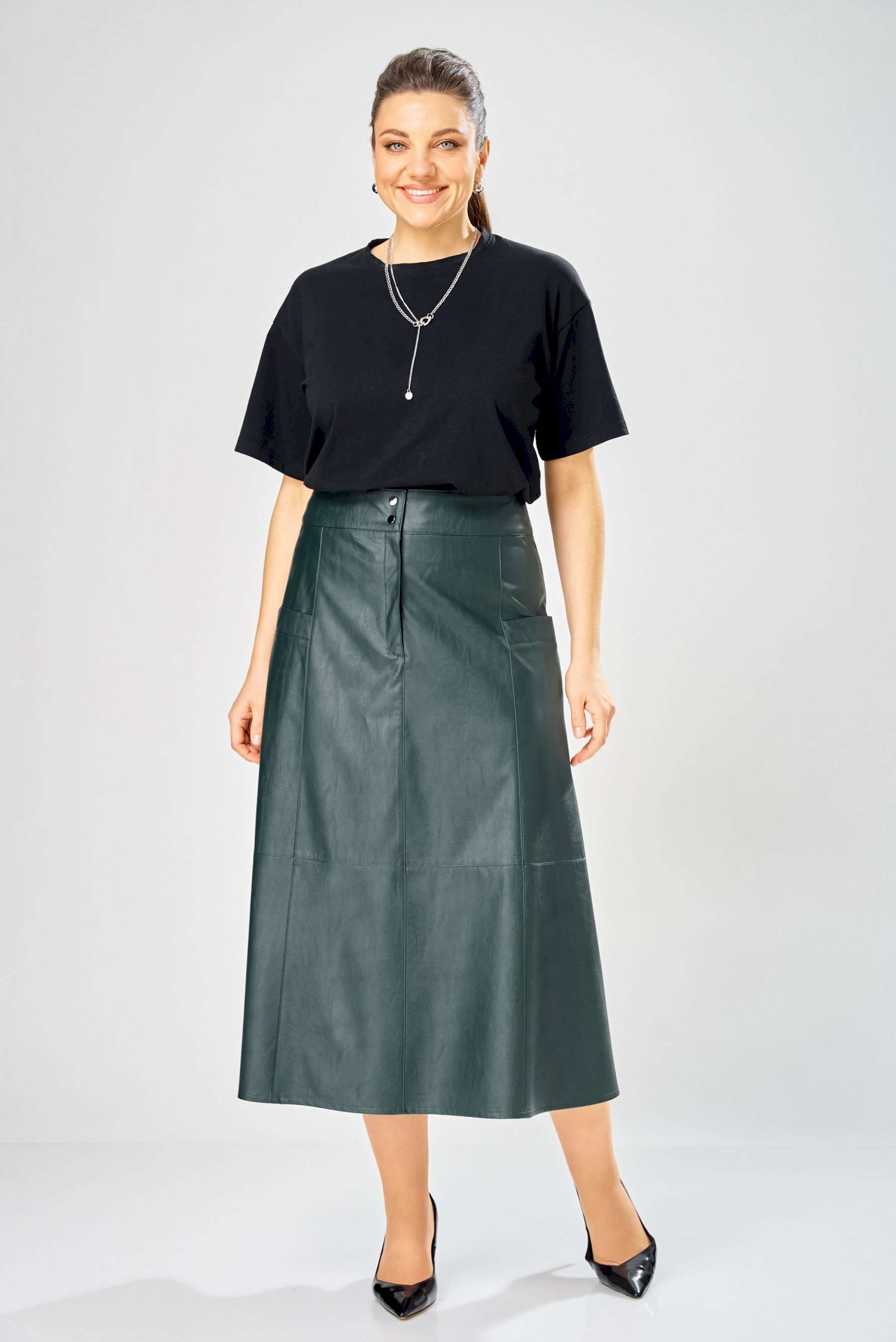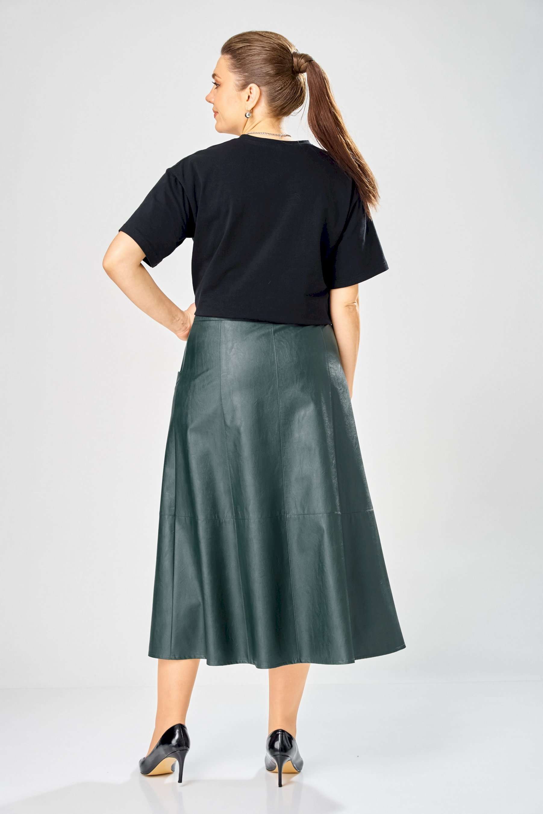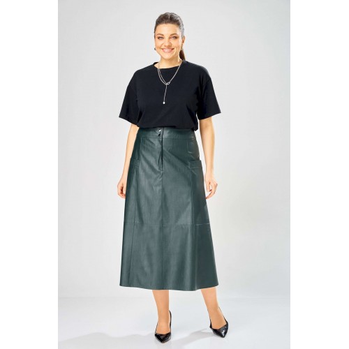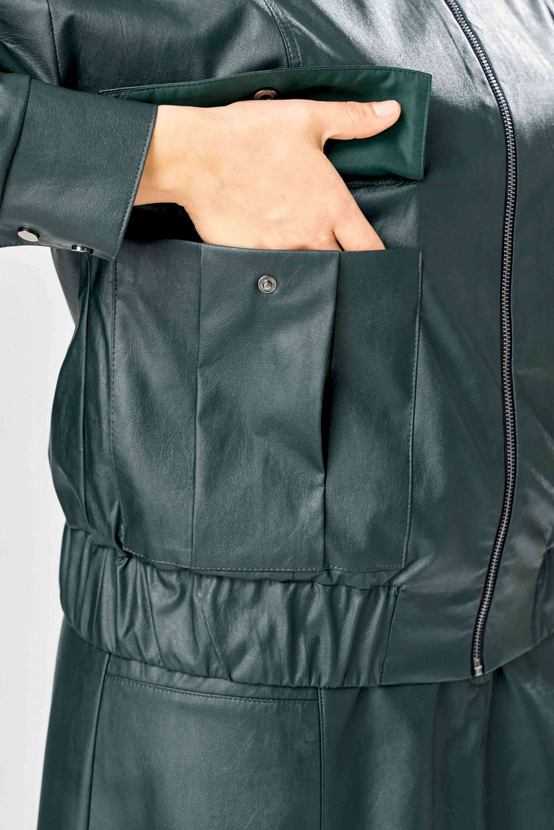 Стильный женский комплект, выполнен из эко-кожи. Куртка свободного силуэта, застегивается на молнию, по переду накладные карманы с клапаном и декоративной кнопкой. Головина оформлена воротником стойка. По спинке отрезная кокетка с клапаном. Рукава со спущенной поймой, по низу притачной манжет с застежкой на кнопки. По низу куртки, притачная планка с резинкой. Куртка на подкладке. Юбка «А» образного силуэта, по переду и спинке рельефные швы, по переду от рельефа до бокового шва, карманы с листочкой, застежка на молнию в центральном шве переда. Верх юбки на поясе с застежкой на кнопки. Юбка на подкладке. Длина куртки – 62 см Длина рукава – 50 см Длина юбки – 87 см