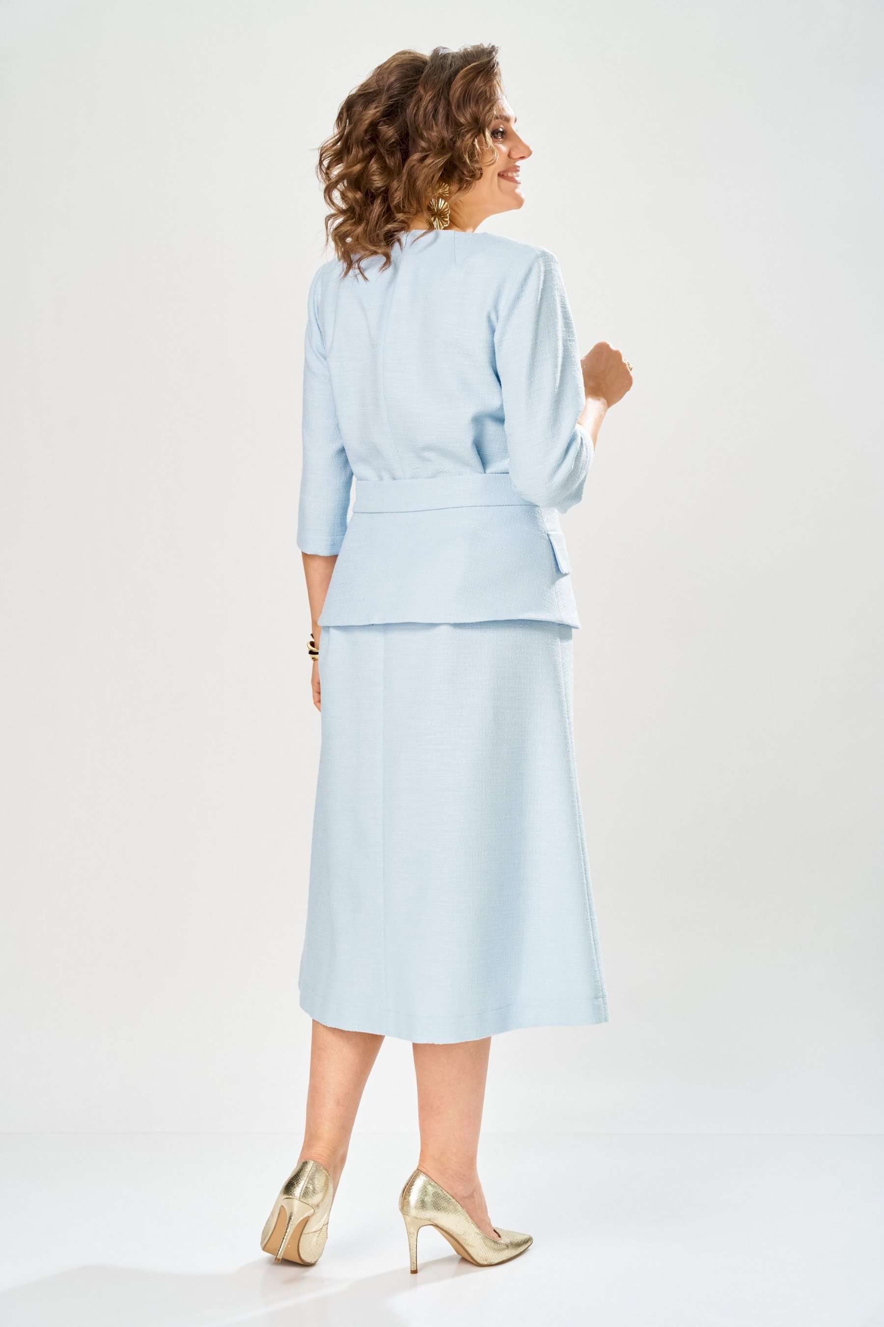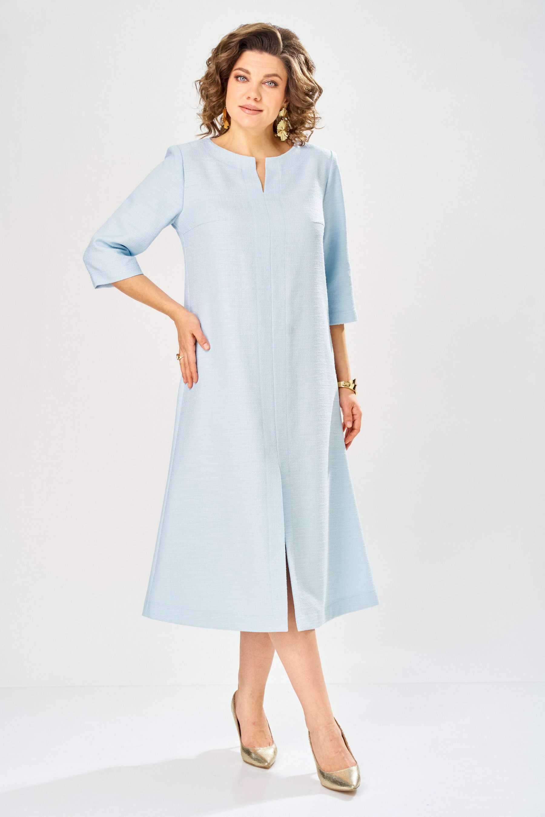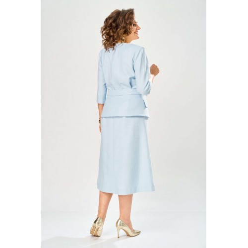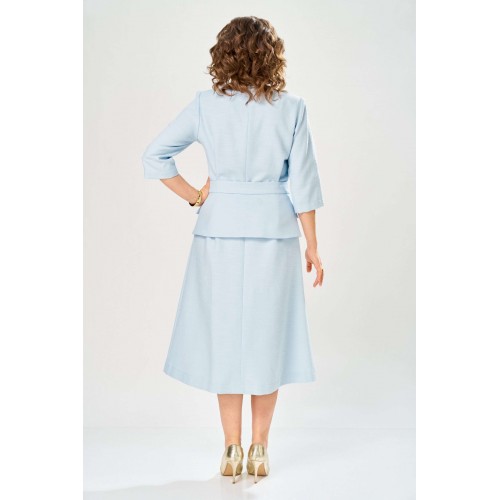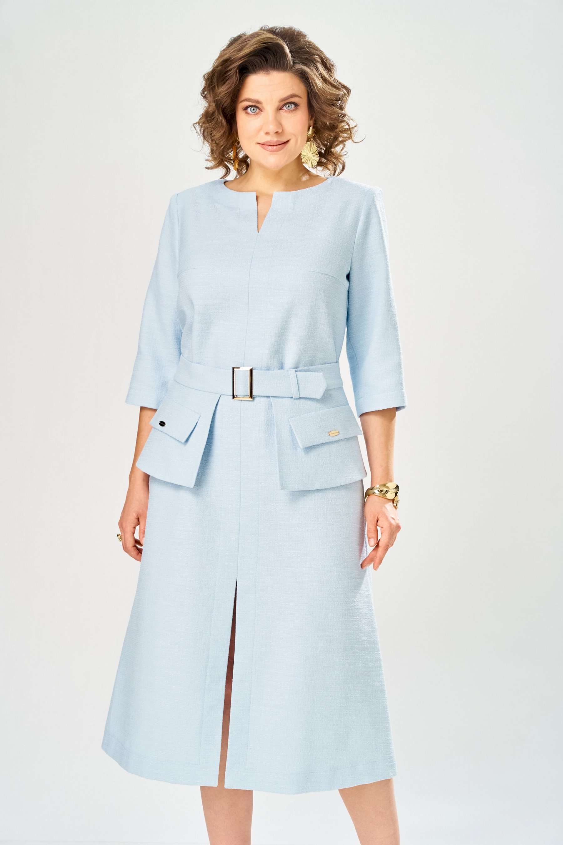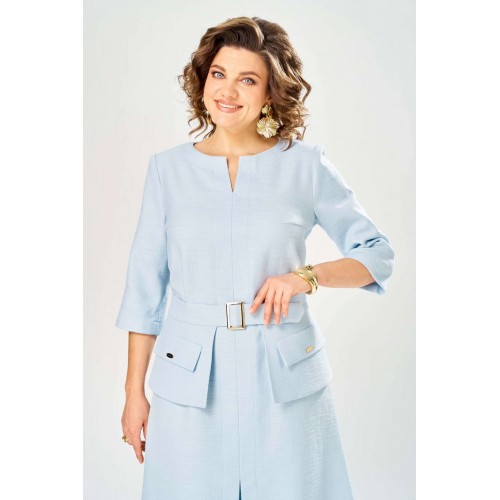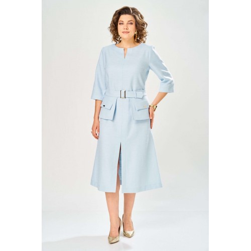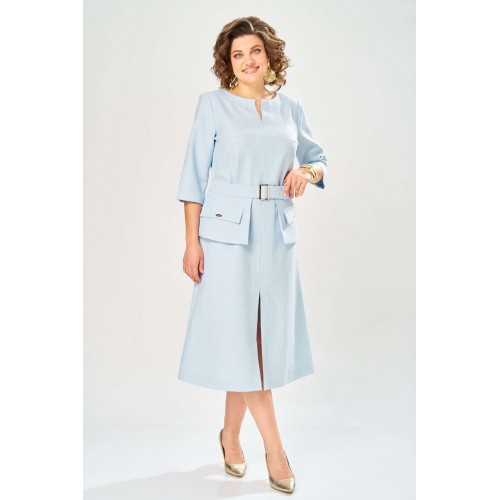 Элегантное женское платье, выполнено из ткани «Шанель» с большим содержанием хлопка. Платье полуприлегающего силуэта, с центральным швом по переду. Горловина круглая с разрезом по центральному шву. Застежка на тесьму молния в центральном шве спинки, рукава втачные, длина 3/4. Украшением платья служит сьемная баска на поясе, с пряжкой в цвете золота и декоративными клапанами. Платье без подкладки. Длина платья – 121 см Длина рукава – 45 см