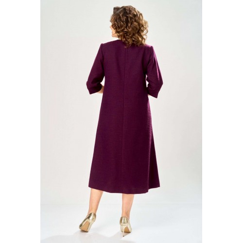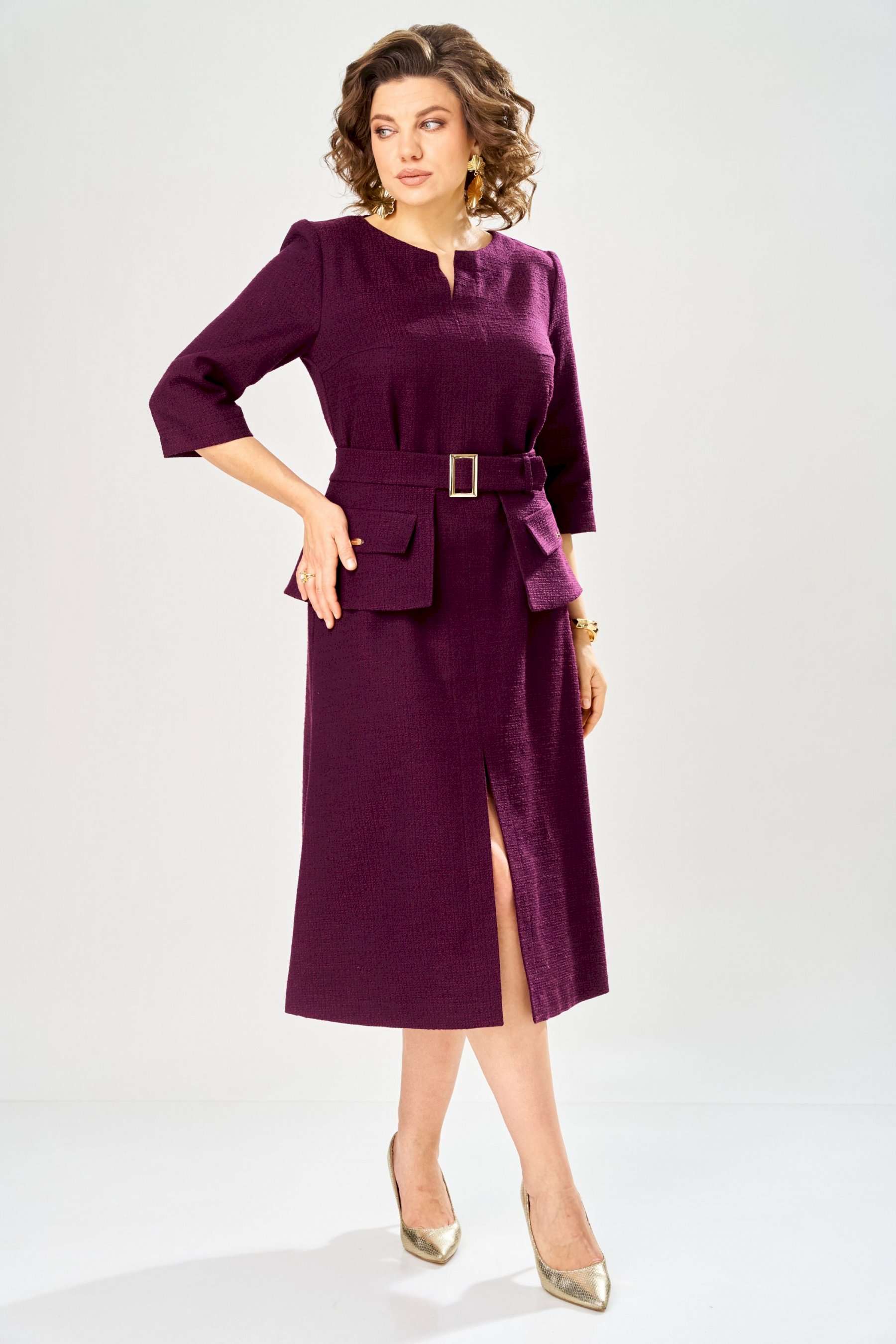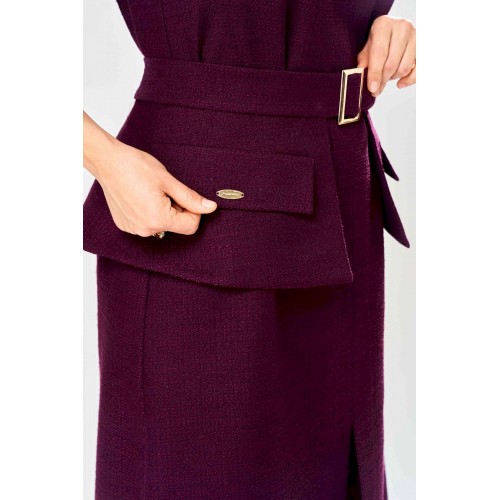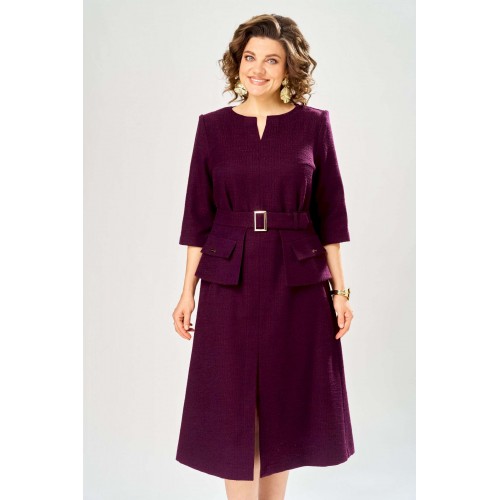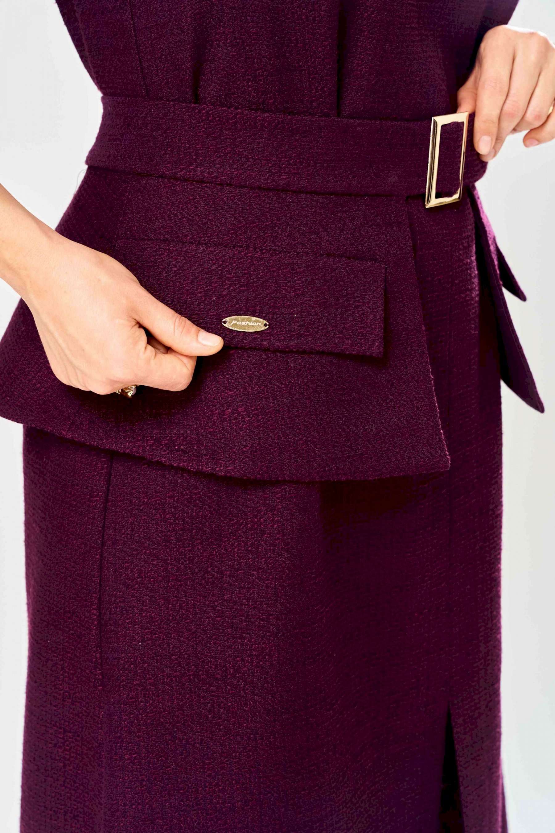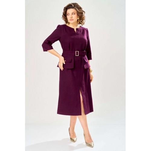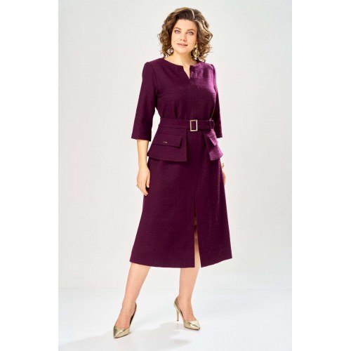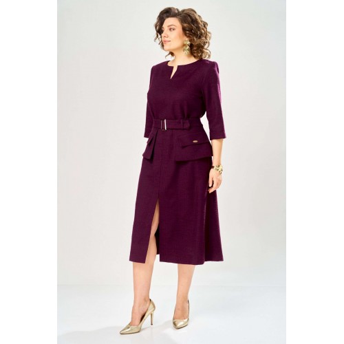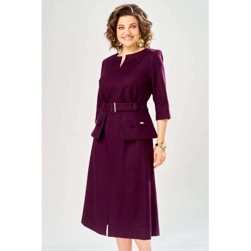 Элегантное женское платье, выполнено из ткани «Шанель» с большим содержанием хлопка. Платье полуприлегающего силуэта, с центральным швом по переду. Горловина круглая с разрезом по центральному шву. Застежка на тесьму молния в центральном шве спинки, рукава втачные, длина 3/4. Украшением платья служит сьемная баска на поясе, с пряжкой в цвете золота и декоративными клапанами. Платье без подкладки. Длина платья – 121 см Длина рукава – 45 см