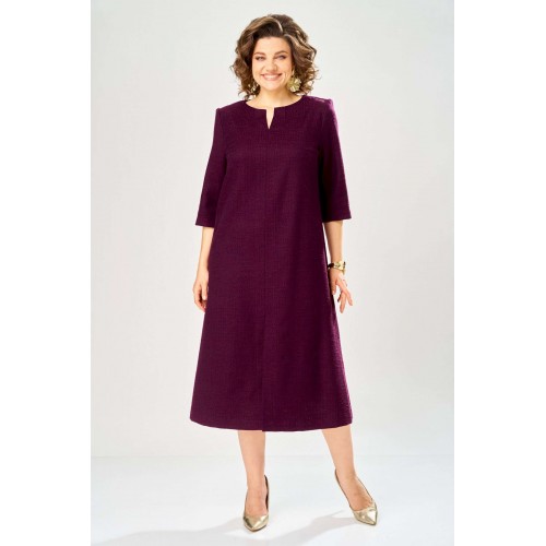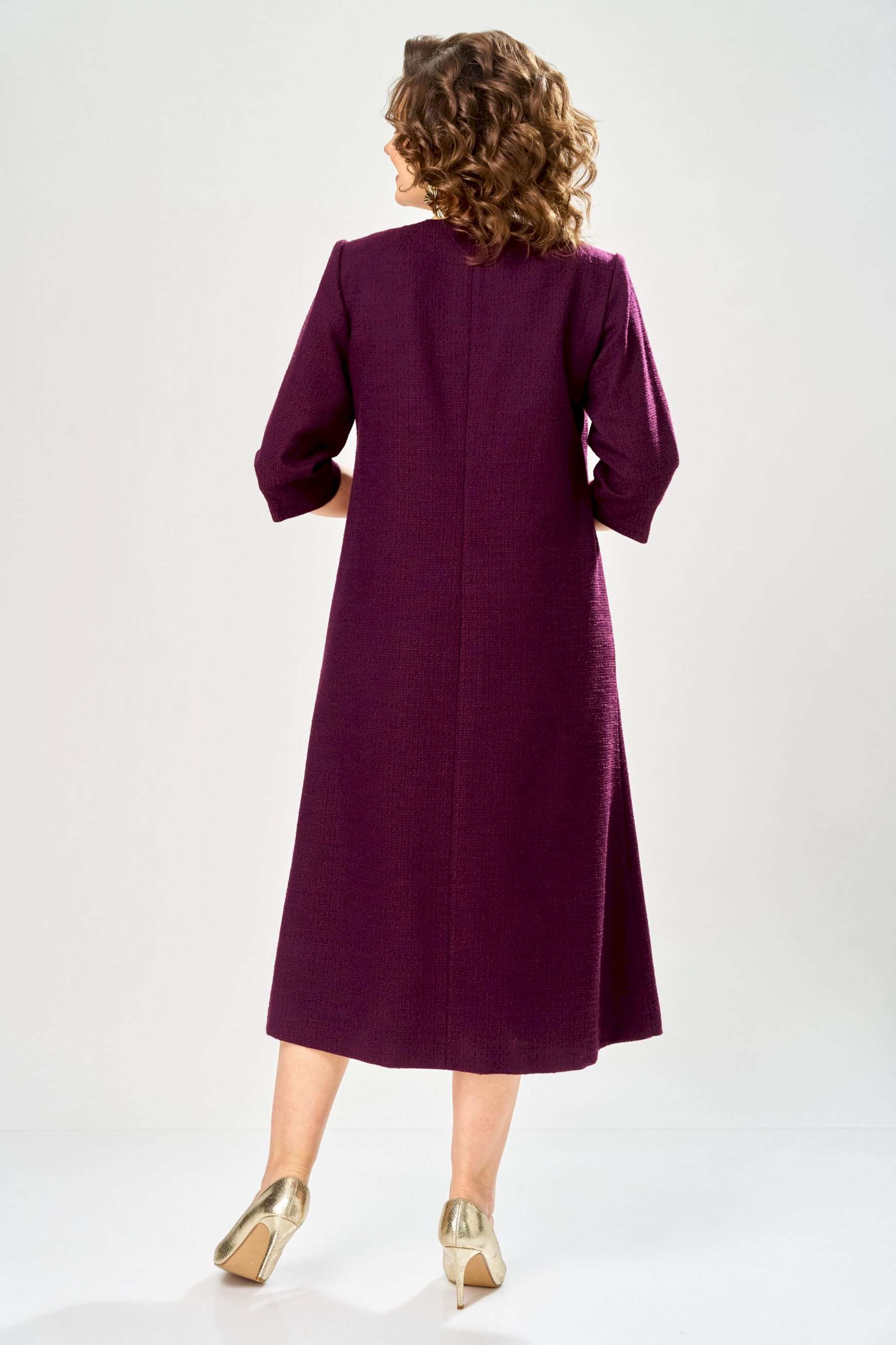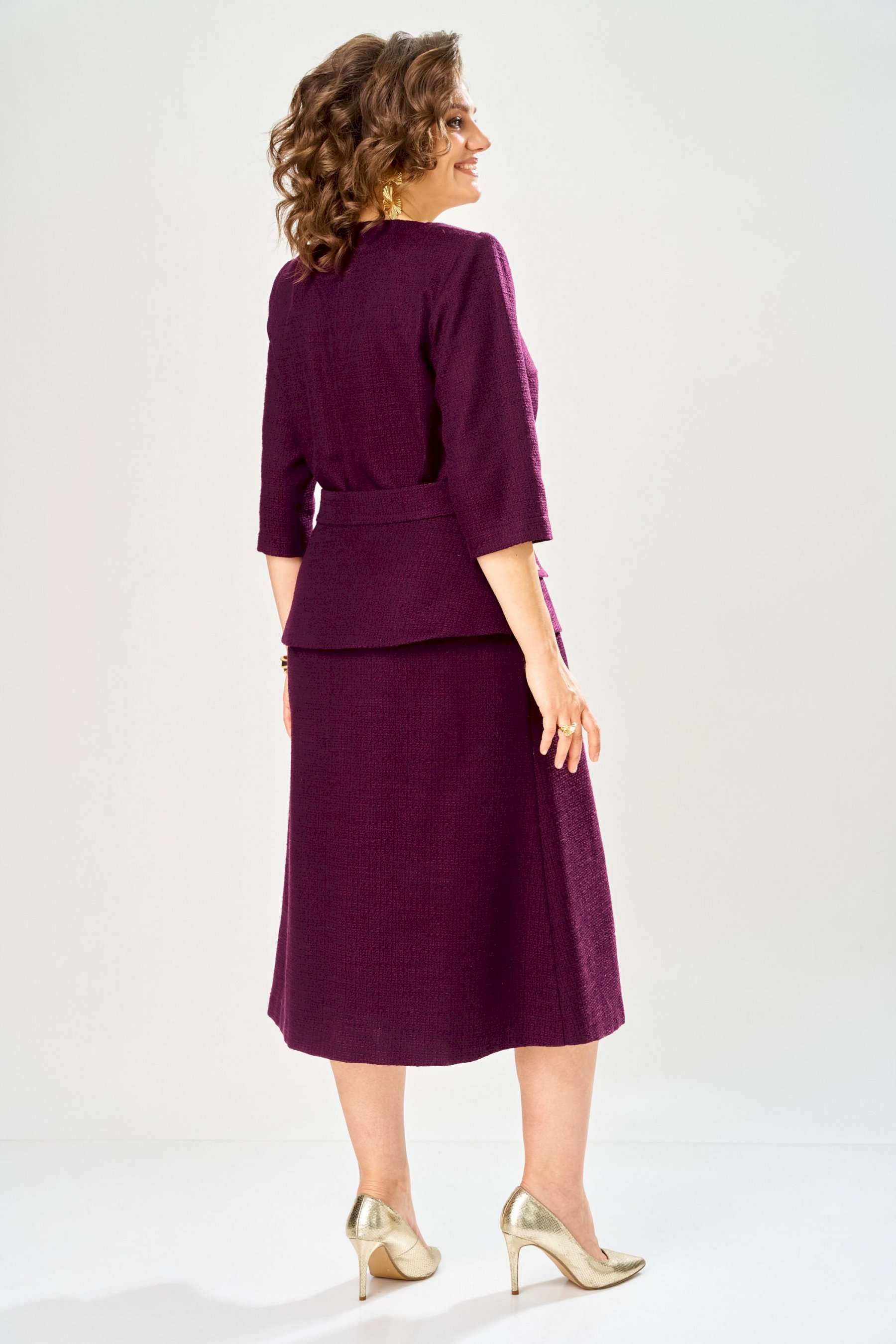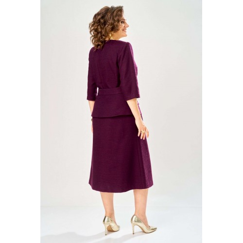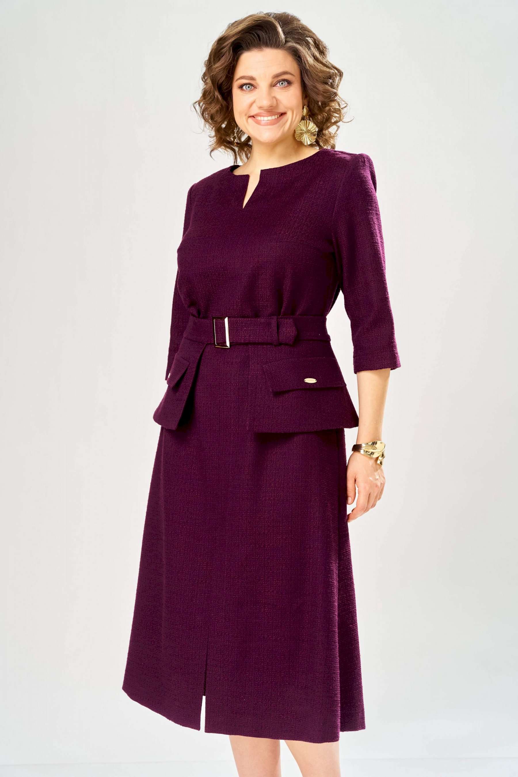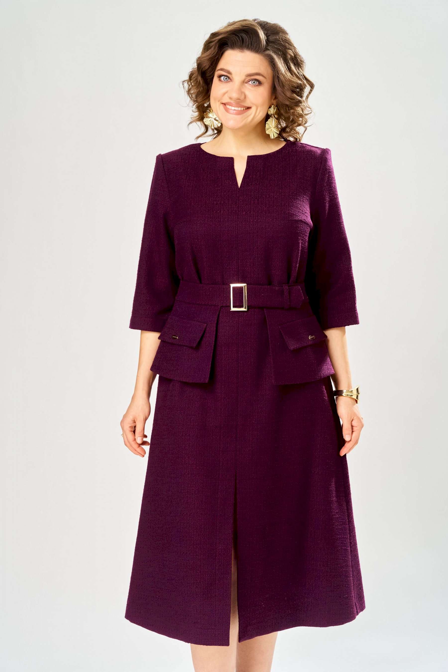 Элегантное женское платье, выполнено из ткани «Шанель» с большим содержанием хлопка. Платье полуприлегающего силуэта, с центральным швом по переду. Горловина круглая с разрезом по центральному шву. Застежка на тесьму молния в центральном шве спинки, рукава втачные, длина 3/4. Украшением платья служит сьемная баска на поясе, с пряжкой в цвете золота и декоративными клапанами. Платье без подкладки. Длина платья – 121 см Длина рукава – 45 см
