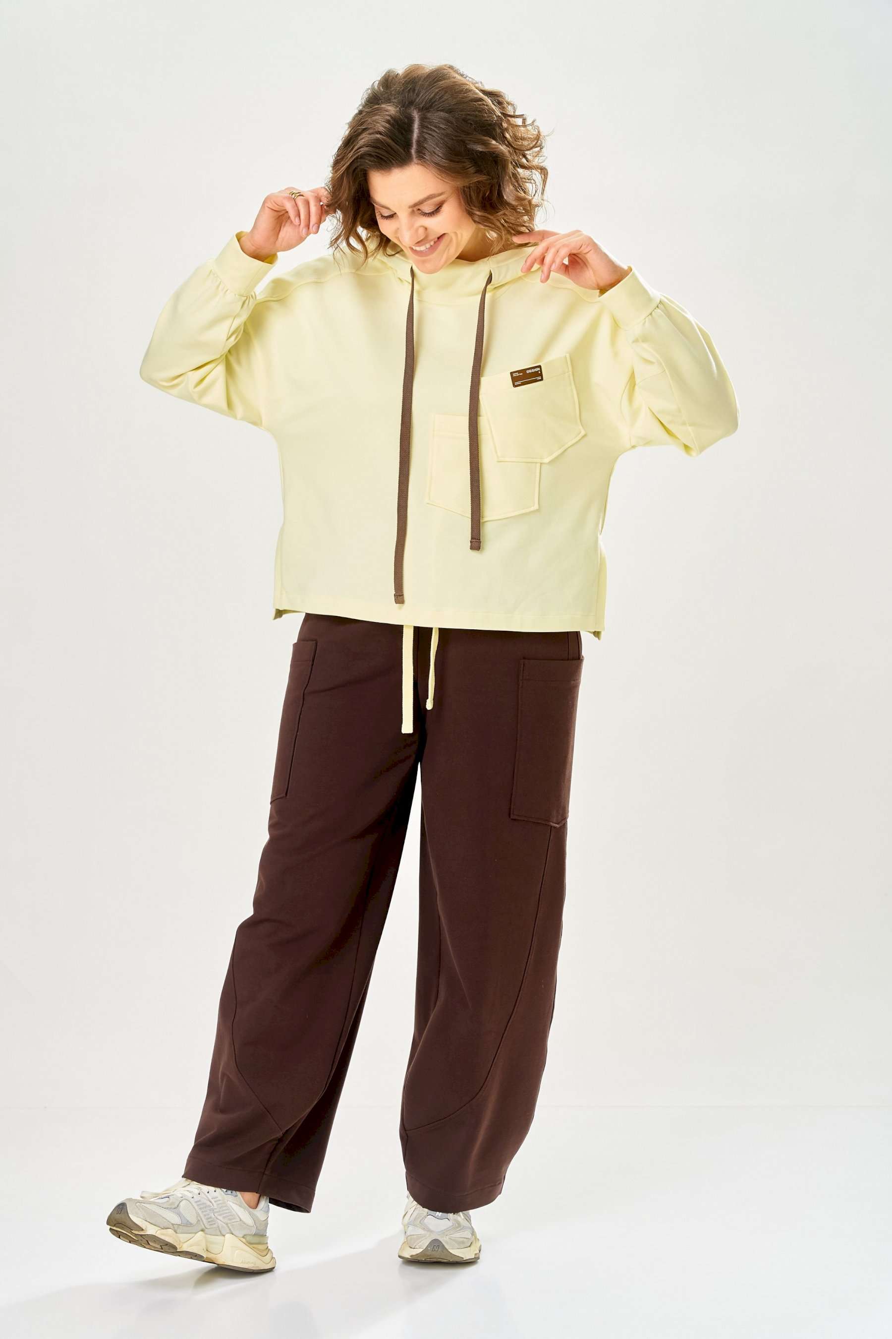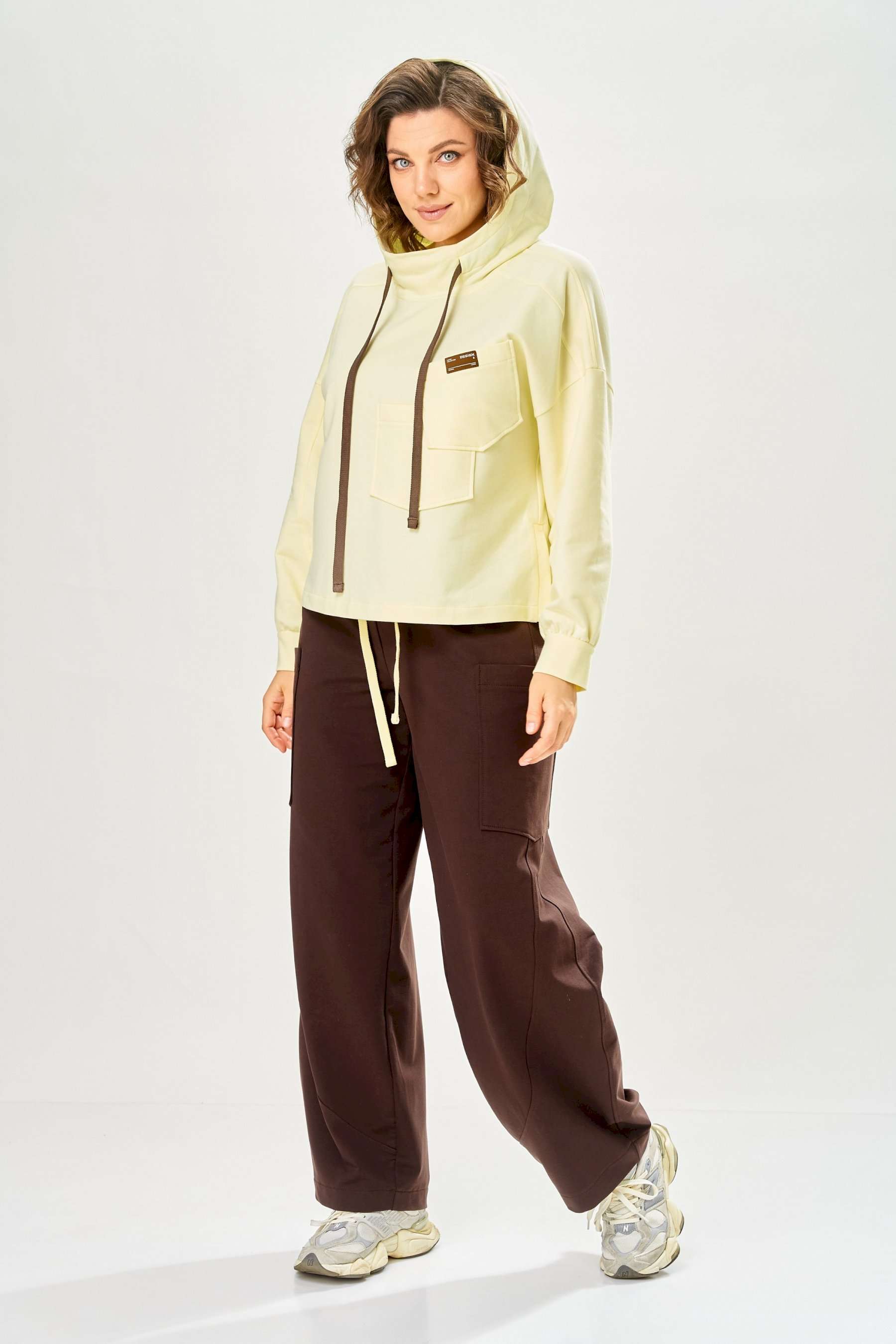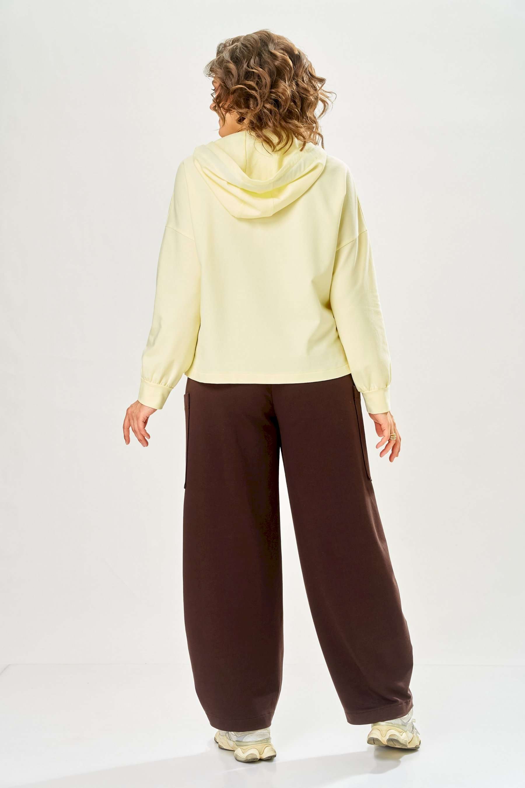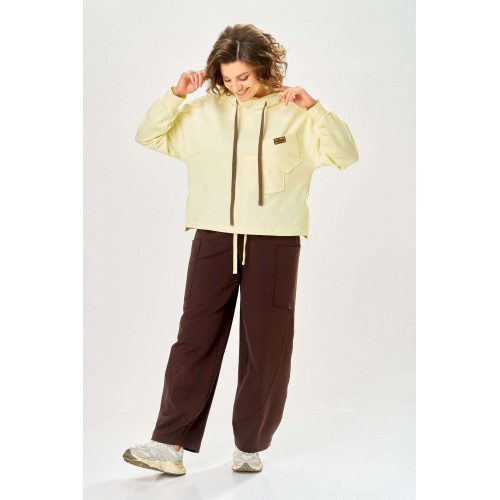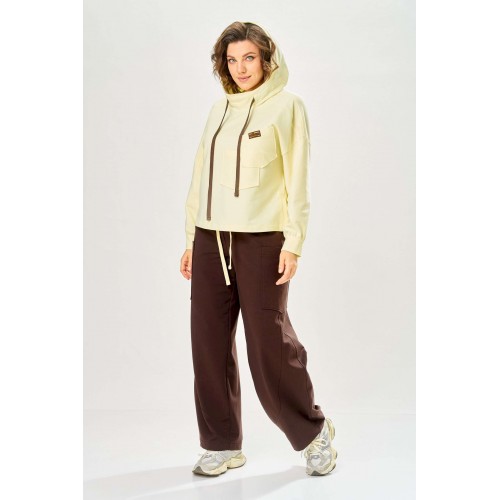 Стильный женский костюм, выполнен из футера. Состоит из свитшота и брюк. Свитшот свободного силуэта со спущенной линией плеча. Горловина оформлена капюшоном, по переду два накладных кармана. В боковых швах разрезы. Рукава с манжетом и сборкой по низу. На кармане декоративная нашивка. Брюки свободного силуэта, заужены к низу. В боковых швах карманы с подрезным бочком, на уровне бедер накладные карманы. Верх брюк оформлен поясом на резинке. В пояс вставлен шнур. Длина свитшота – 58 см Длина рукава – 44 см Ширина плеча – 25 см Длина брюк по боковому срезу – 108 см Длина брюк по шаговому шву – 78 см