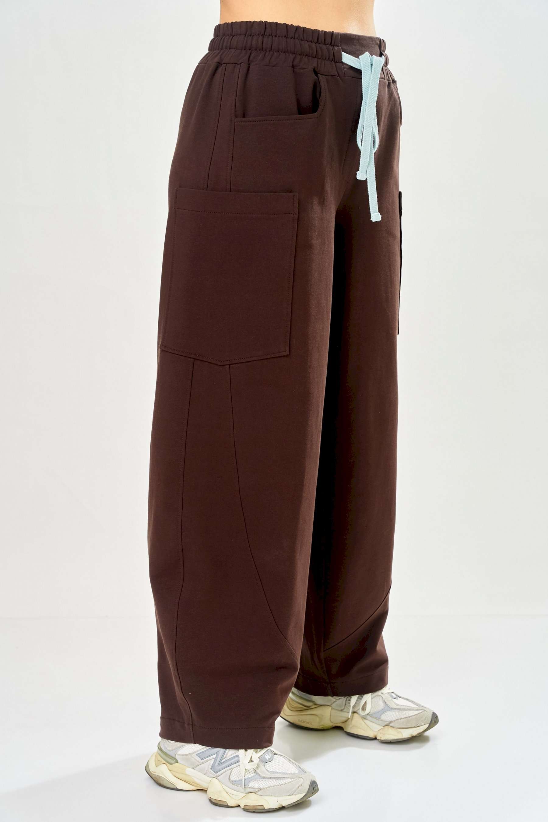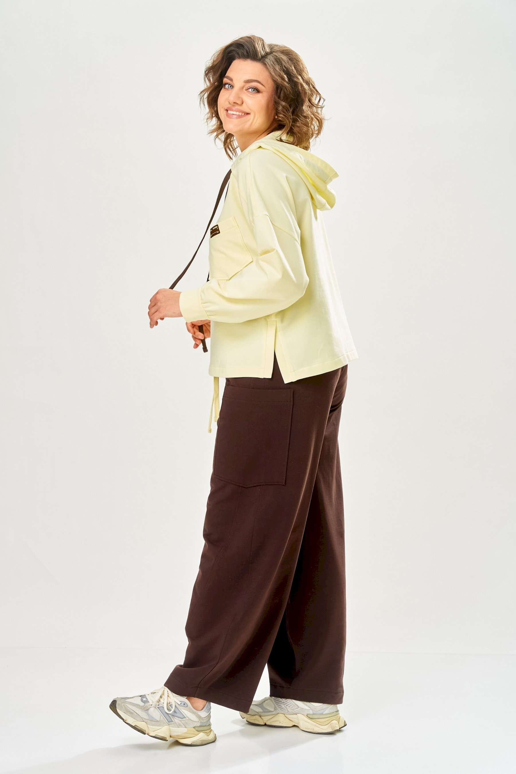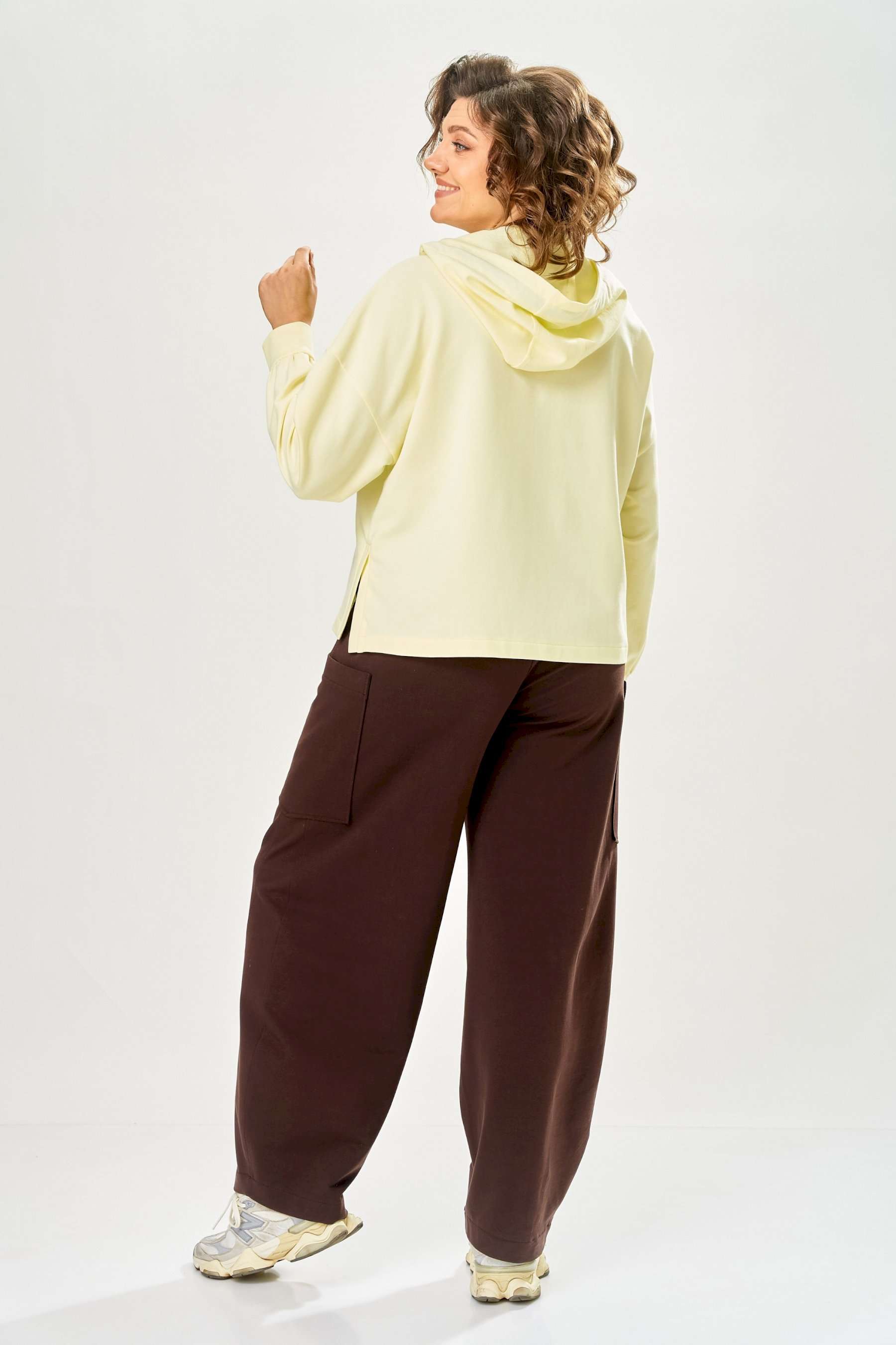 Стильный женский костюм, выполнен из футера. Состоит из свитшота и брюк. Свитшот свободного силуэта со спущенной линией плеча. Горловина оформлена капюшоном, по переду два накладных кармана. В боковых швах разрезы. Рукава с манжетом и сборкой по низу. На кармане декоративная нашивка. Брюки свободного силуэта, заужены к низу. В боковых швах карманы с подрезным бочком, на уровне бедер накладные карманы. Верх брюк оформлен поясом на резинке. В пояс вставлен шнур. Длина свитшота – 58 см Длина рукава – 44 см Ширина плеча – 25 см Длина брюк по боковому срезу – 108 см Длина брюк по шаговому шву – 78 см