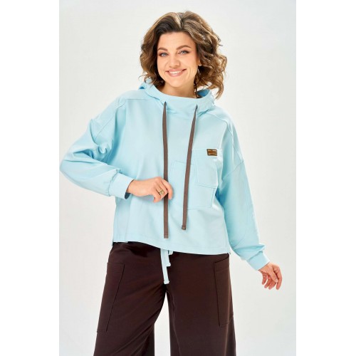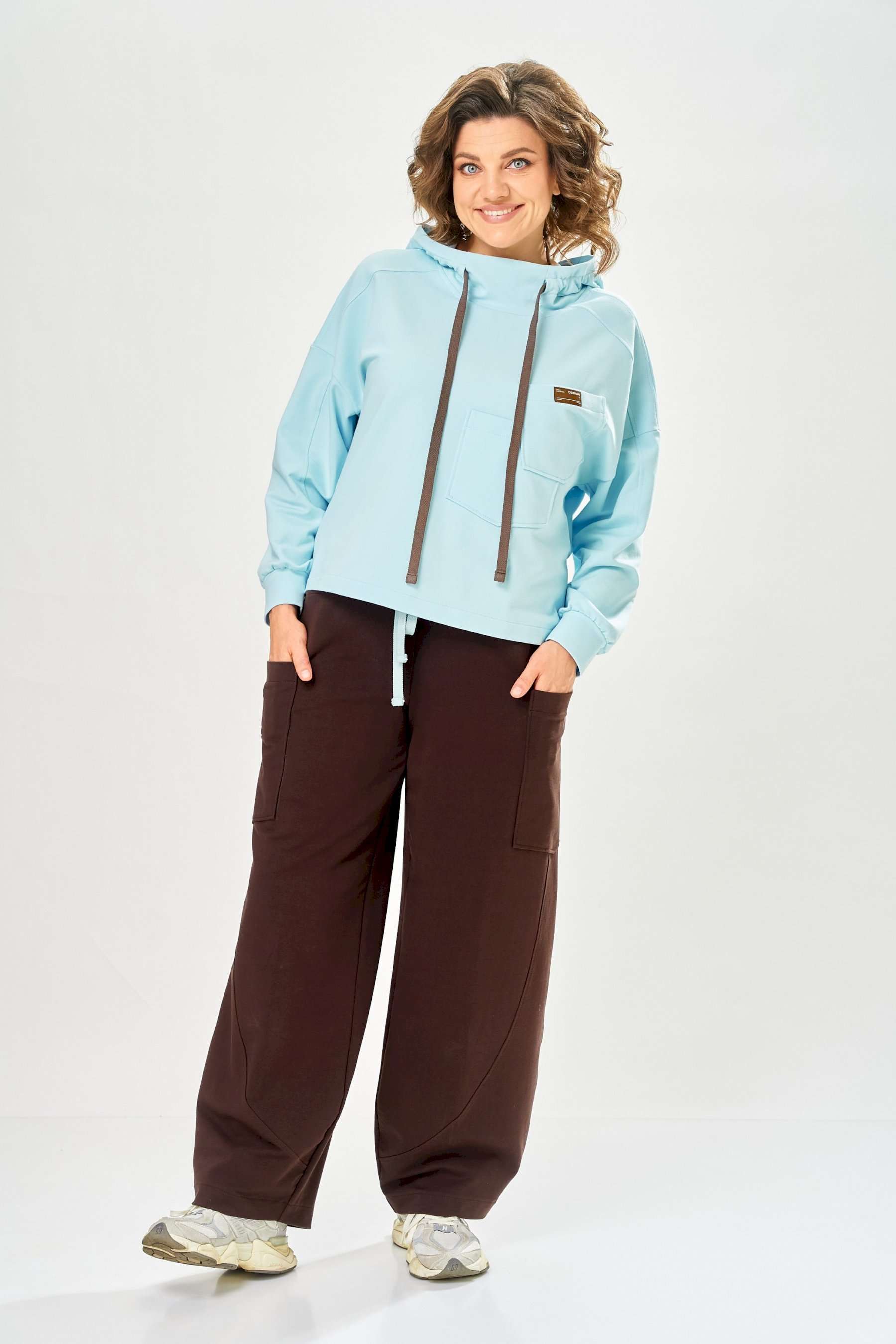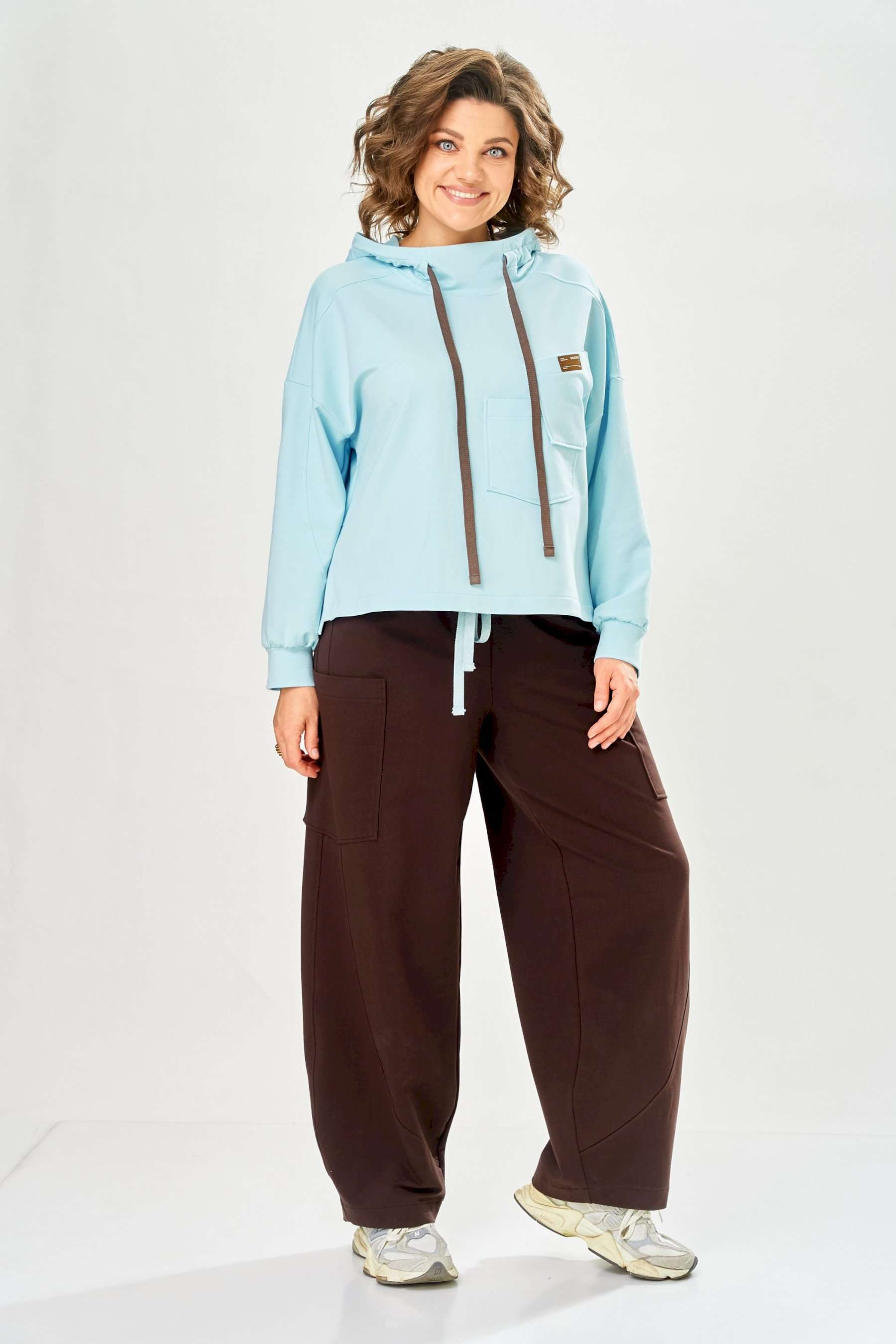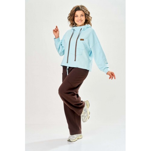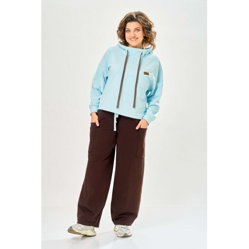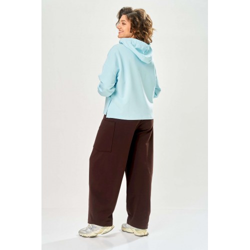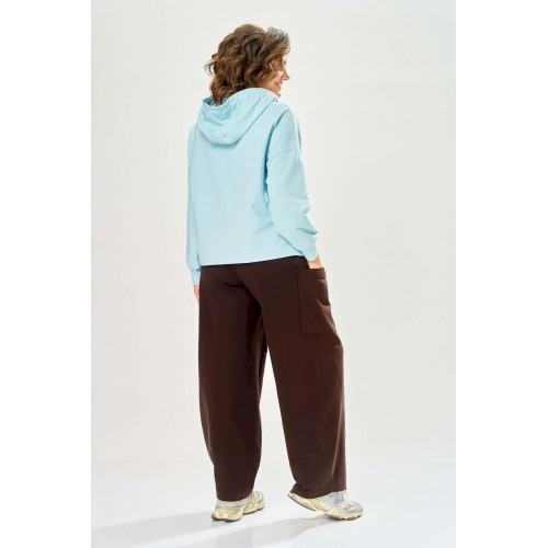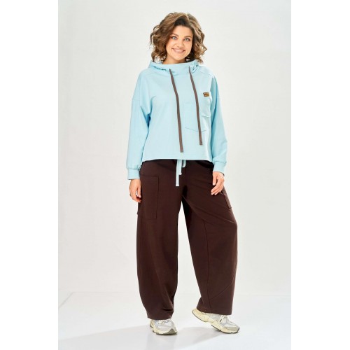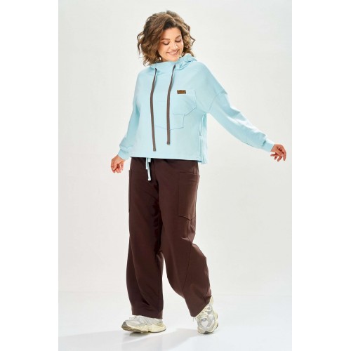 Стильный женский костюм, выполнен из футера. Состоит из свитшота и брюк. Свитшот свободного силуэта со спущенной линией плеча. Горловина оформлена капюшоном, по переду два накладных кармана. В боковых швах разрезы. Рукава с манжетом и сборкой по низу. На кармане декоративная нашивка. Брюки свободного силуэта, заужены к низу. В боковых швах карманы с подрезным бочком, на уровне бедер накладные карманы. Верх брюк оформлен поясом на резинке. В пояс вставлен шнур. Длина свитшота – 58 см Длина рукава – 44 см Ширина плеча – 25 см Длина брюк по боковому срезу – 108 см Длина брюк по шаговому шву – 78 см