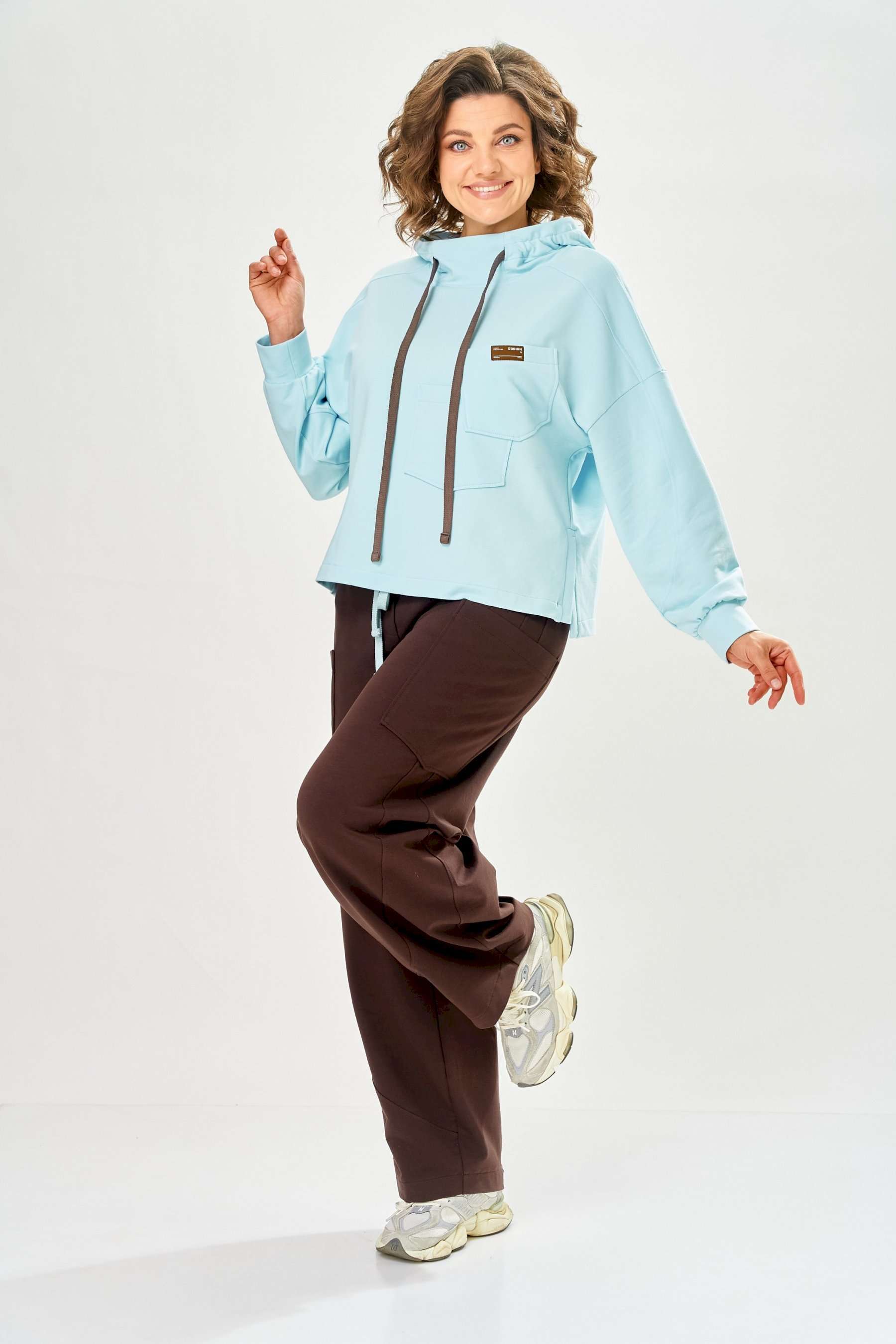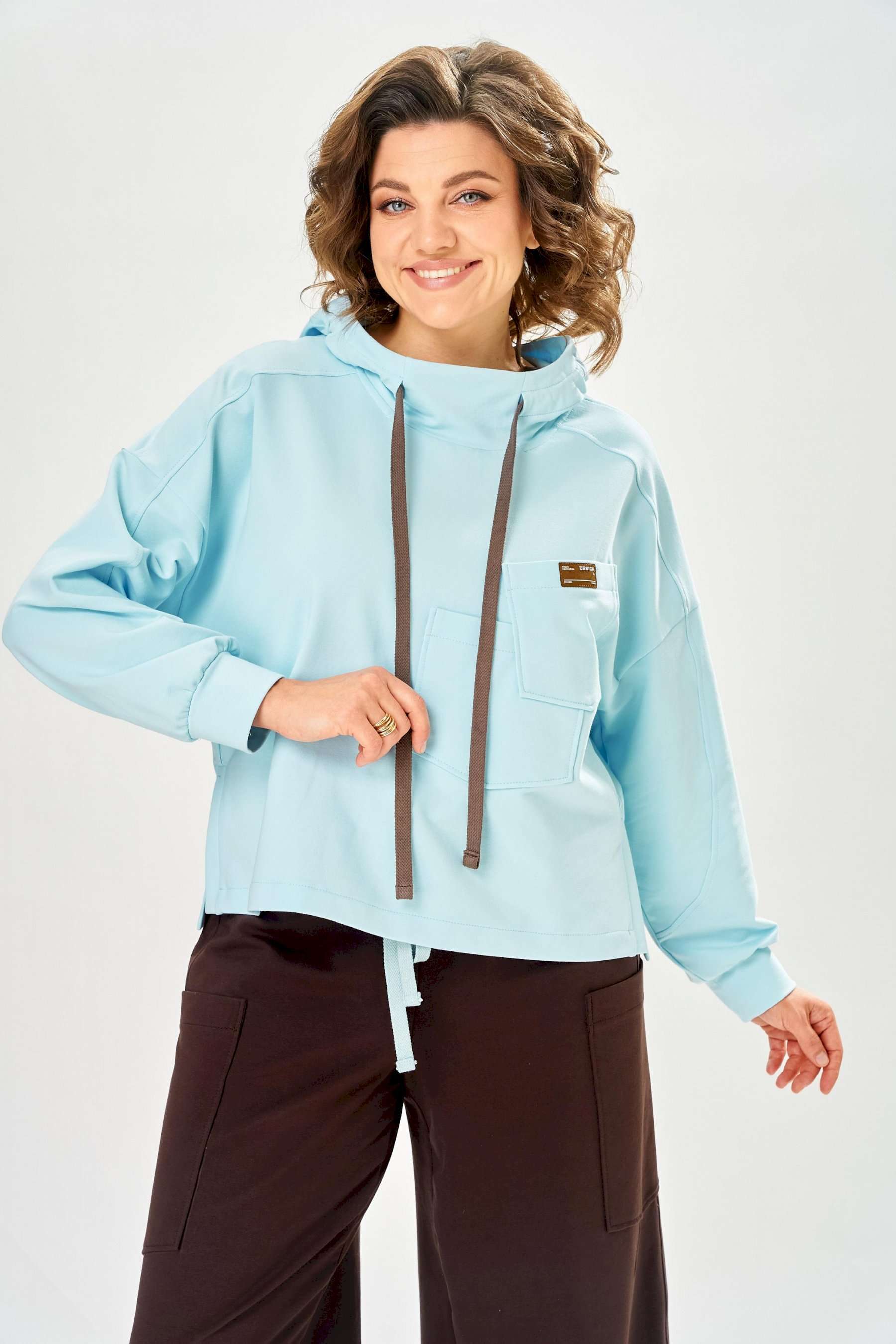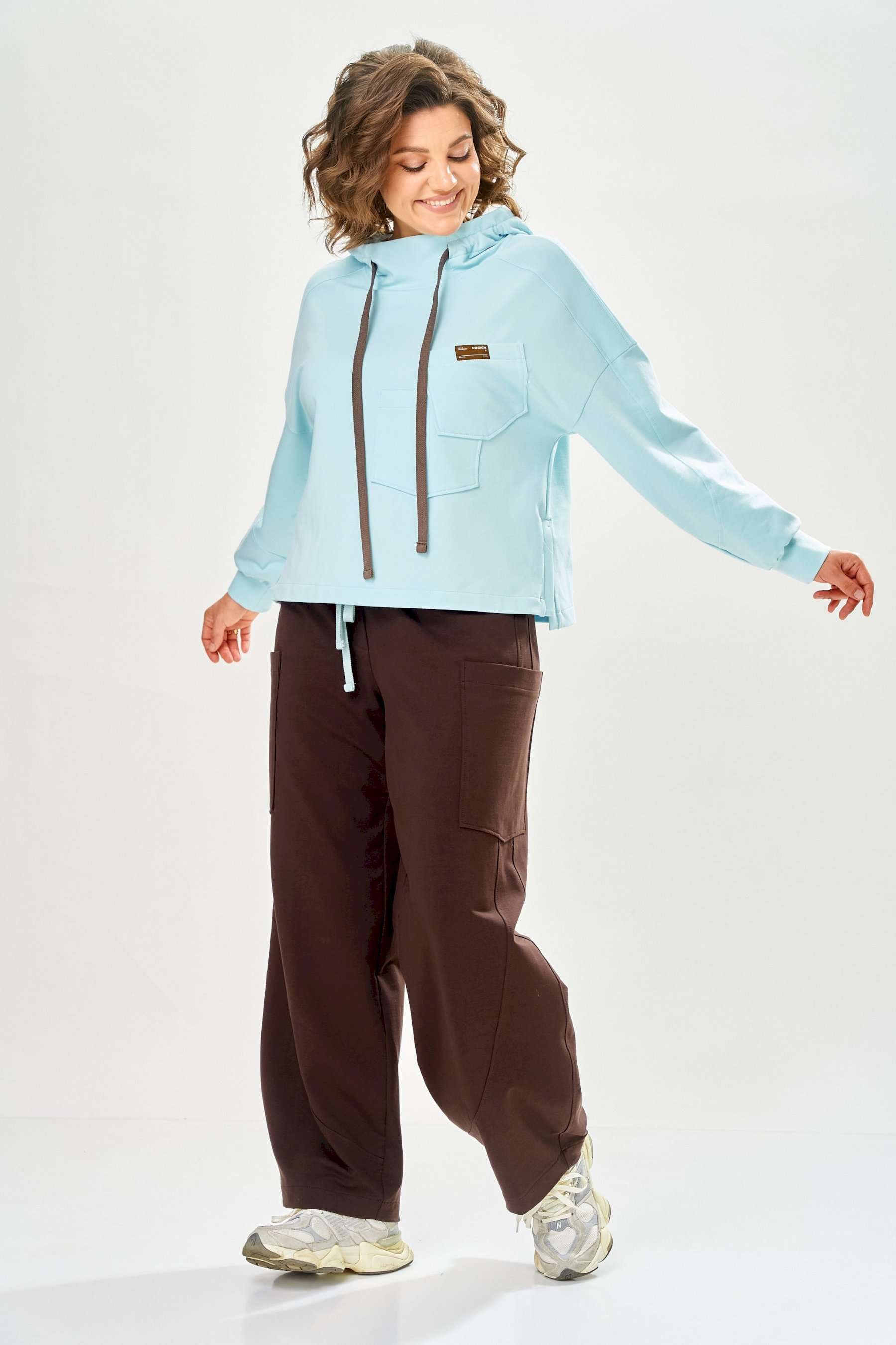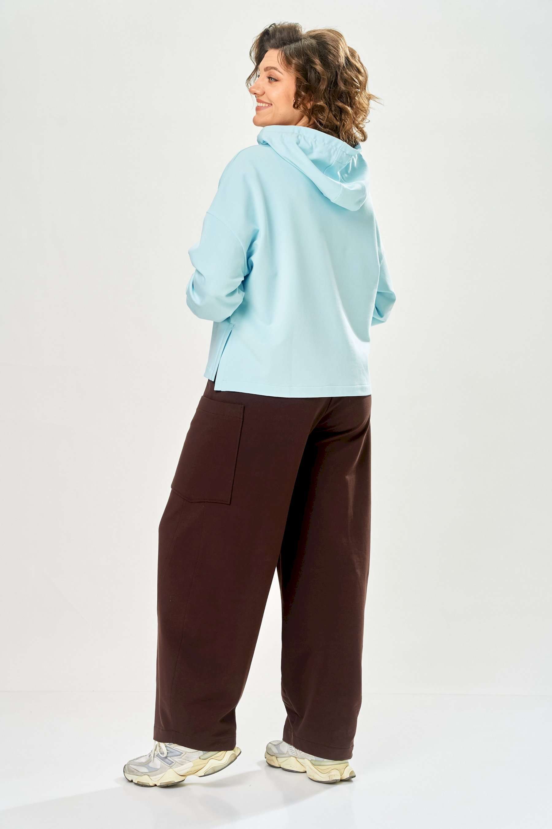 Стильный женский костюм, выполнен из футера. Состоит из свитшота и брюк. Свитшот свободного силуэта со спущенной линией плеча. Горловина оформлена капюшоном, по переду два накладных кармана. В боковых швах разрезы. Рукава с манжетом и сборкой по низу. На кармане декоративная нашивка. Брюки свободного силуэта, заужены к низу. В боковых швах карманы с подрезным бочком, на уровне бедер накладные карманы. Верх брюк оформлен поясом на резинке. В пояс вставлен шнур. Длина свитшота – 58 см Длина рукава – 44 см Ширина плеча – 25 см Длина брюк по боковому срезу – 108 см Длина брюк по шаговому шву – 78 см