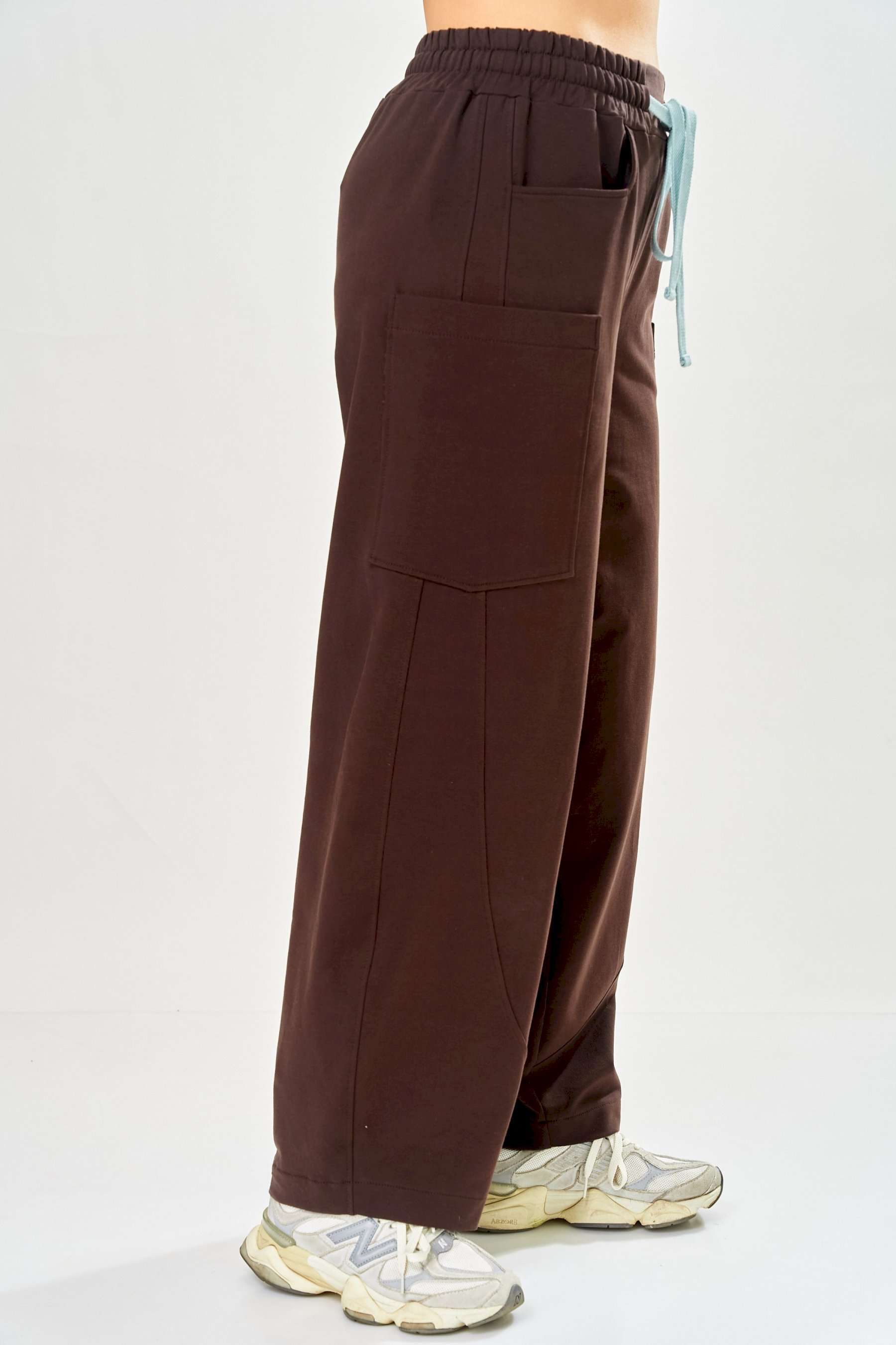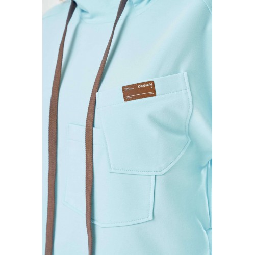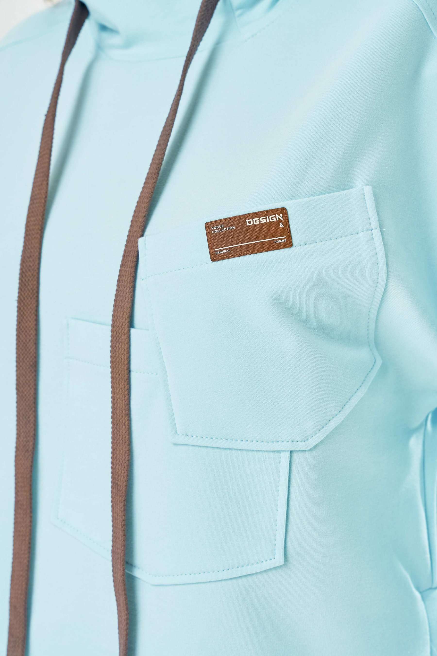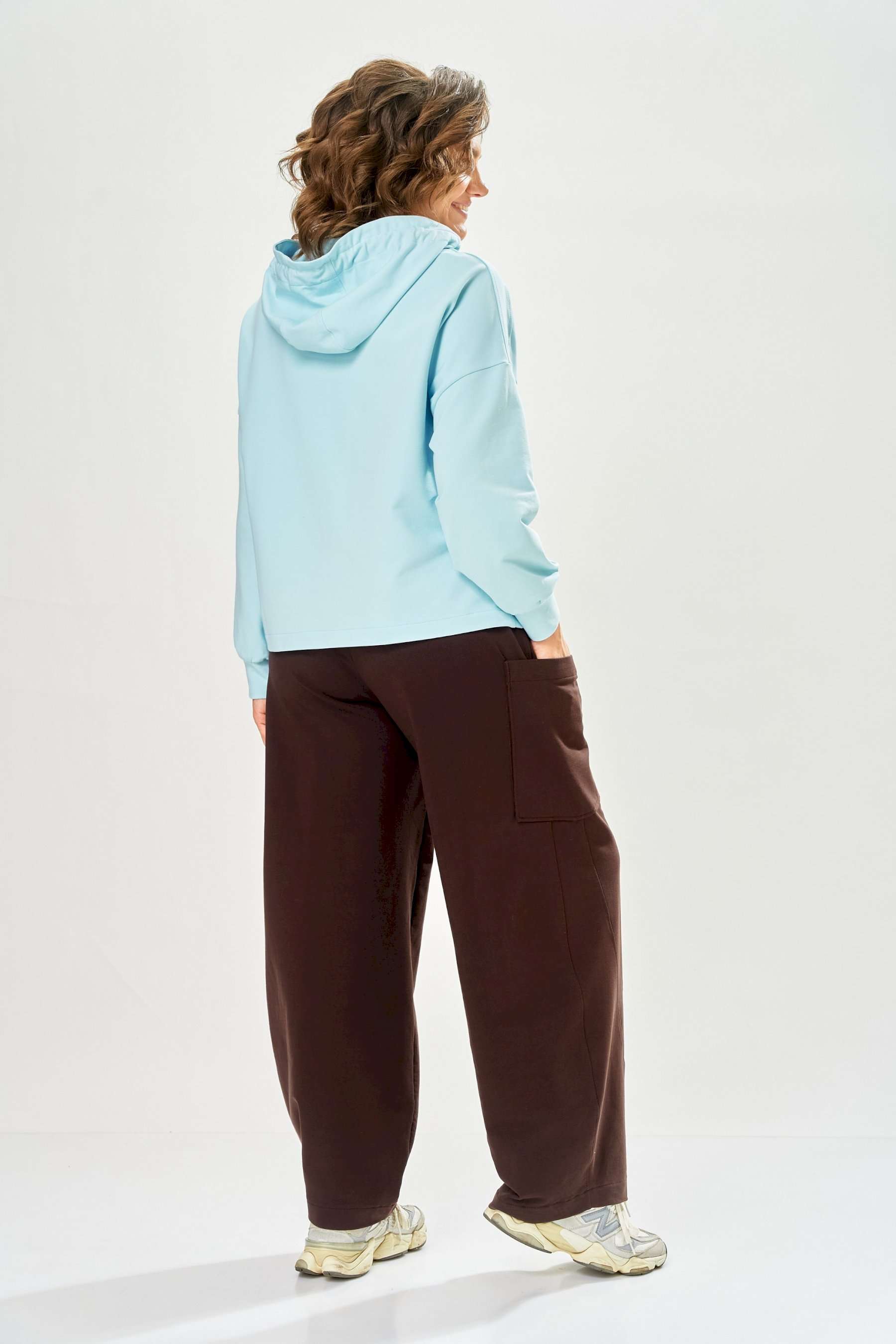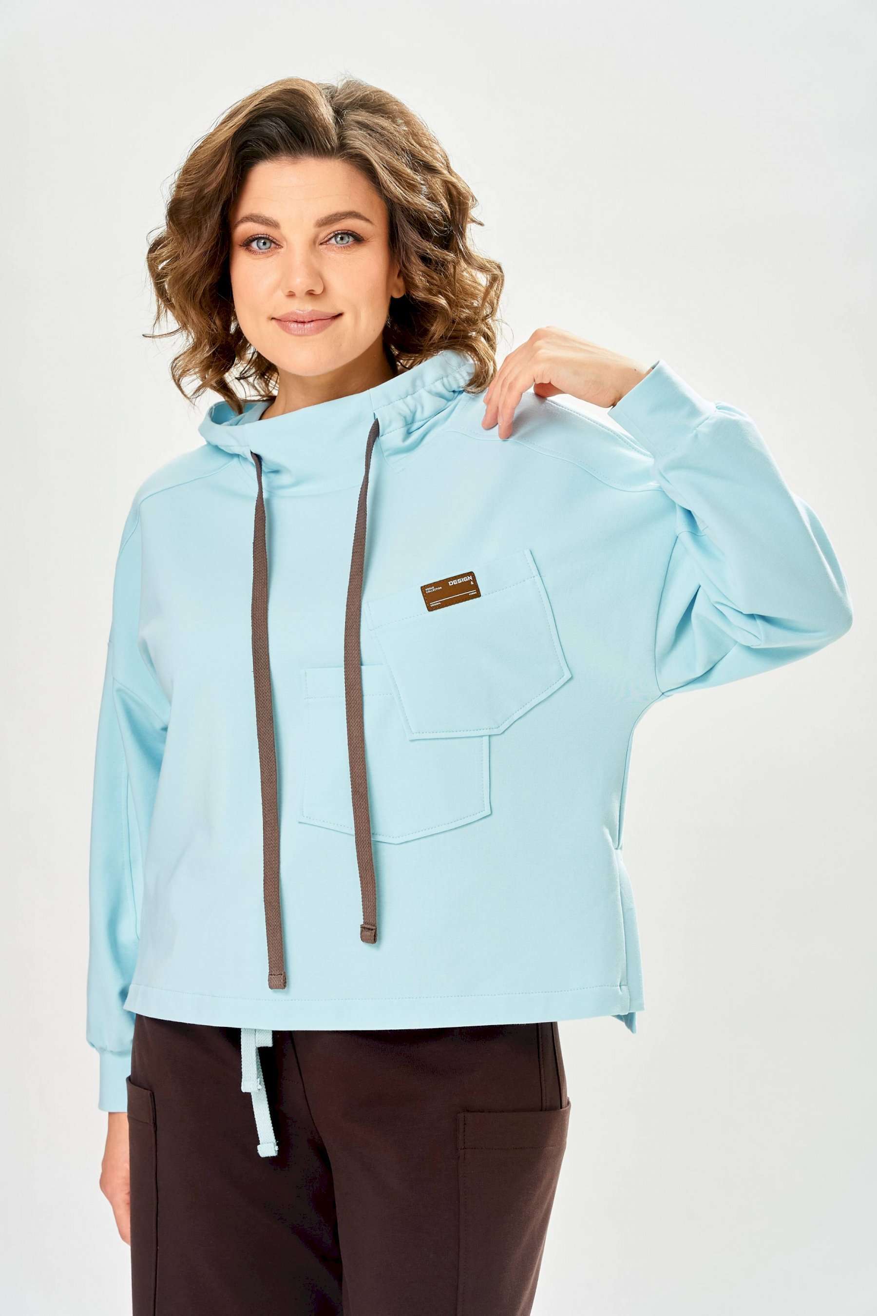 Стильный женский костюм, выполнен из футера. Состоит из свитшота и брюк. Свитшот свободного силуэта со спущенной линией плеча. Горловина оформлена капюшоном, по переду два накладных кармана. В боковых швах разрезы. Рукава с манжетом и сборкой по низу. На кармане декоративная нашивка. Брюки свободного силуэта, заужены к низу. В боковых швах карманы с подрезным бочком, на уровне бедер накладные карманы. Верх брюк оформлен поясом на резинке. В пояс вставлен шнур. Длина свитшота – 58 см Длина рукава – 44 см Ширина плеча – 25 см Длина брюк по боковому срезу – 108 см Длина брюк по шаговому шву – 78 см