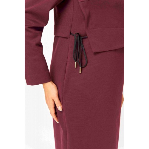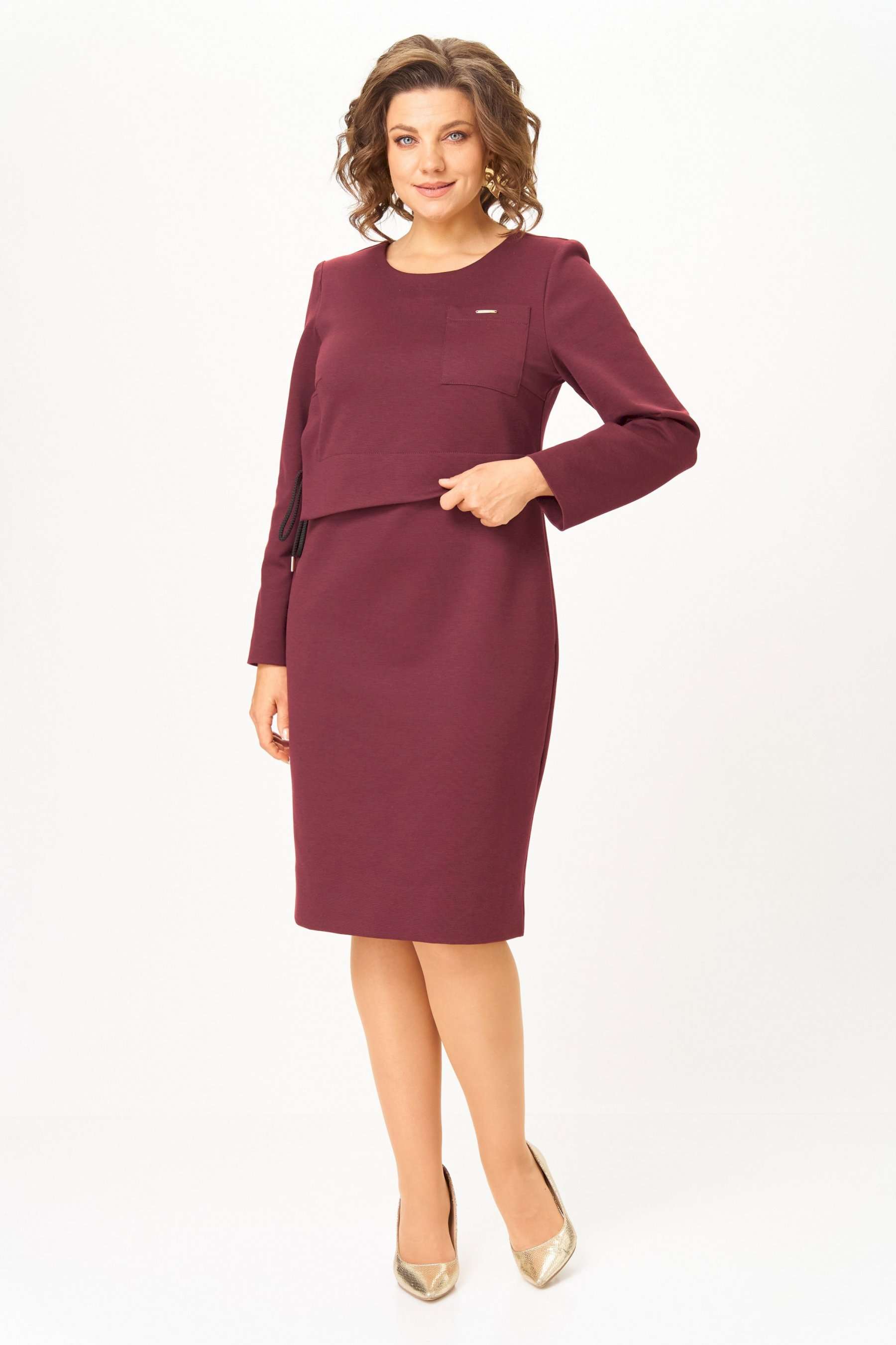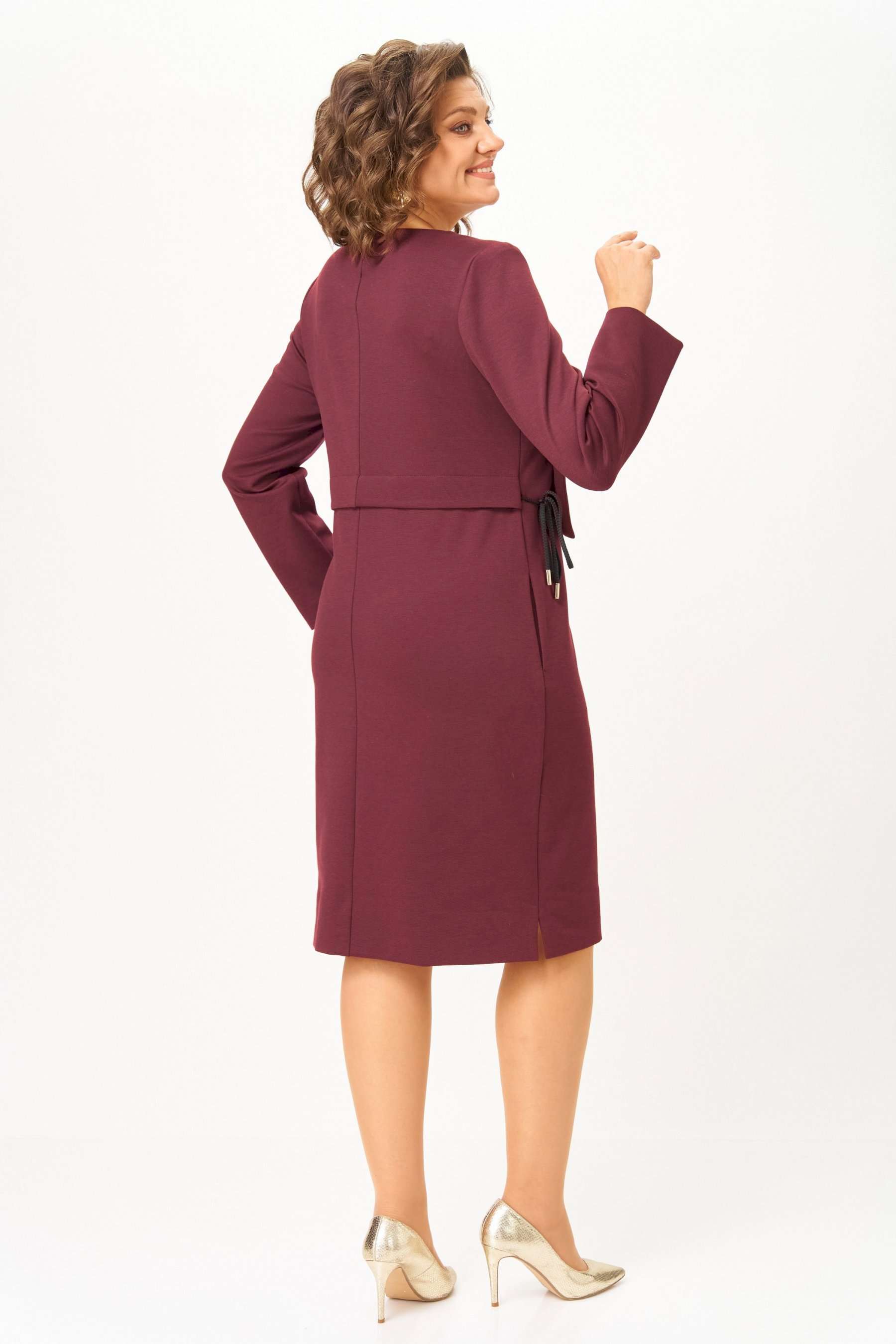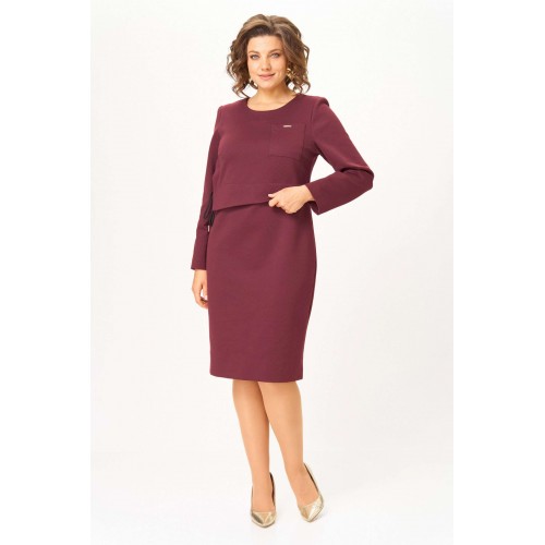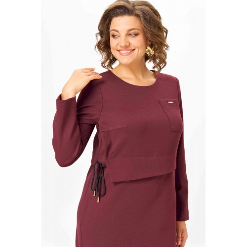 Элегантное женское платье, выполнено из трикотажного полотна. Платье полуприлигающего силуэта. По переду и спинке фигурный подрез на уровне талии. По левой стороне переда на уровне груди накладной карман с пришивной брошкой, горловина круглая, талия собрана на кулису. Рукава втачные. Брошка на груди может отличаться! Длина платья по спинке – 102 см Длина рукава – 61 см