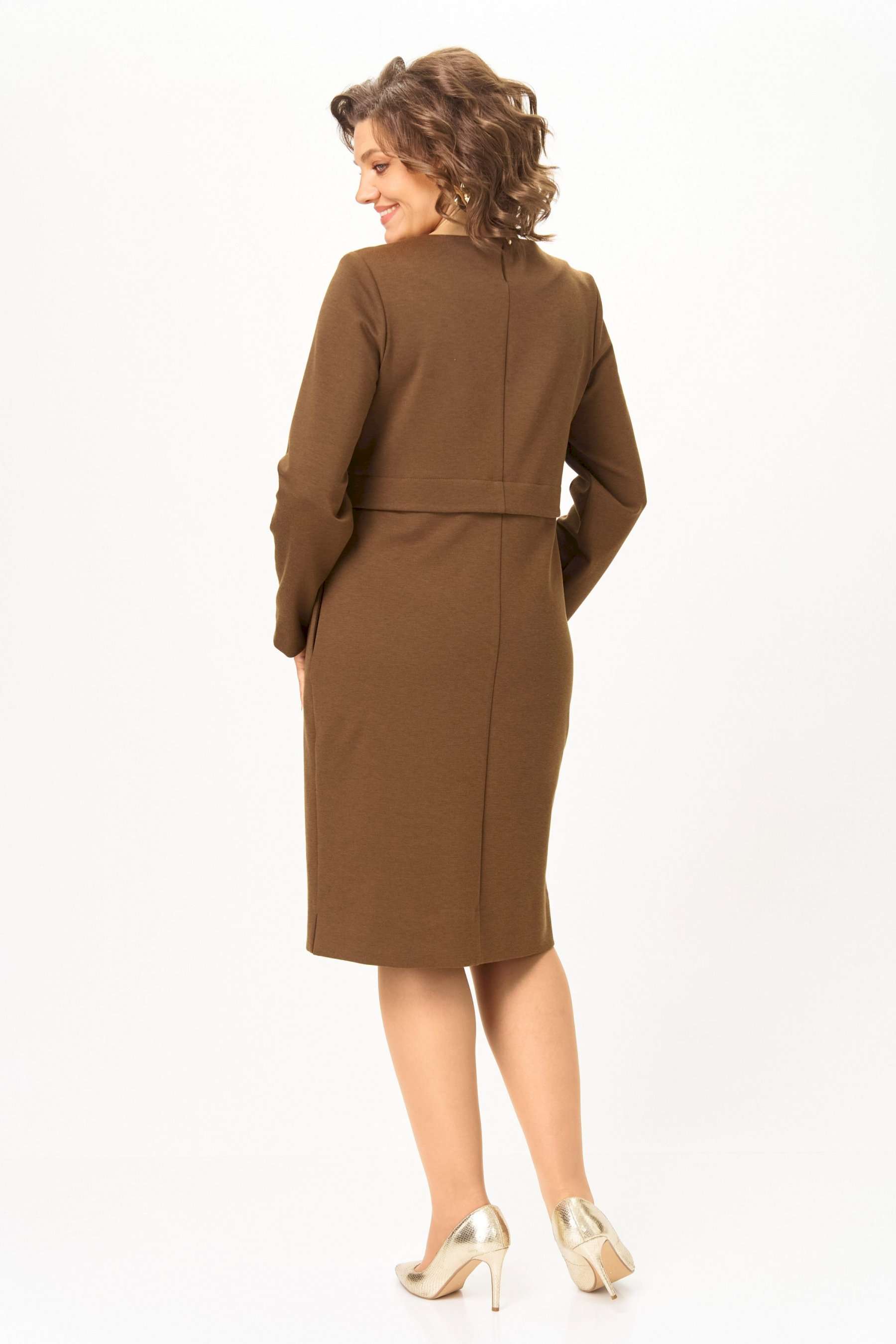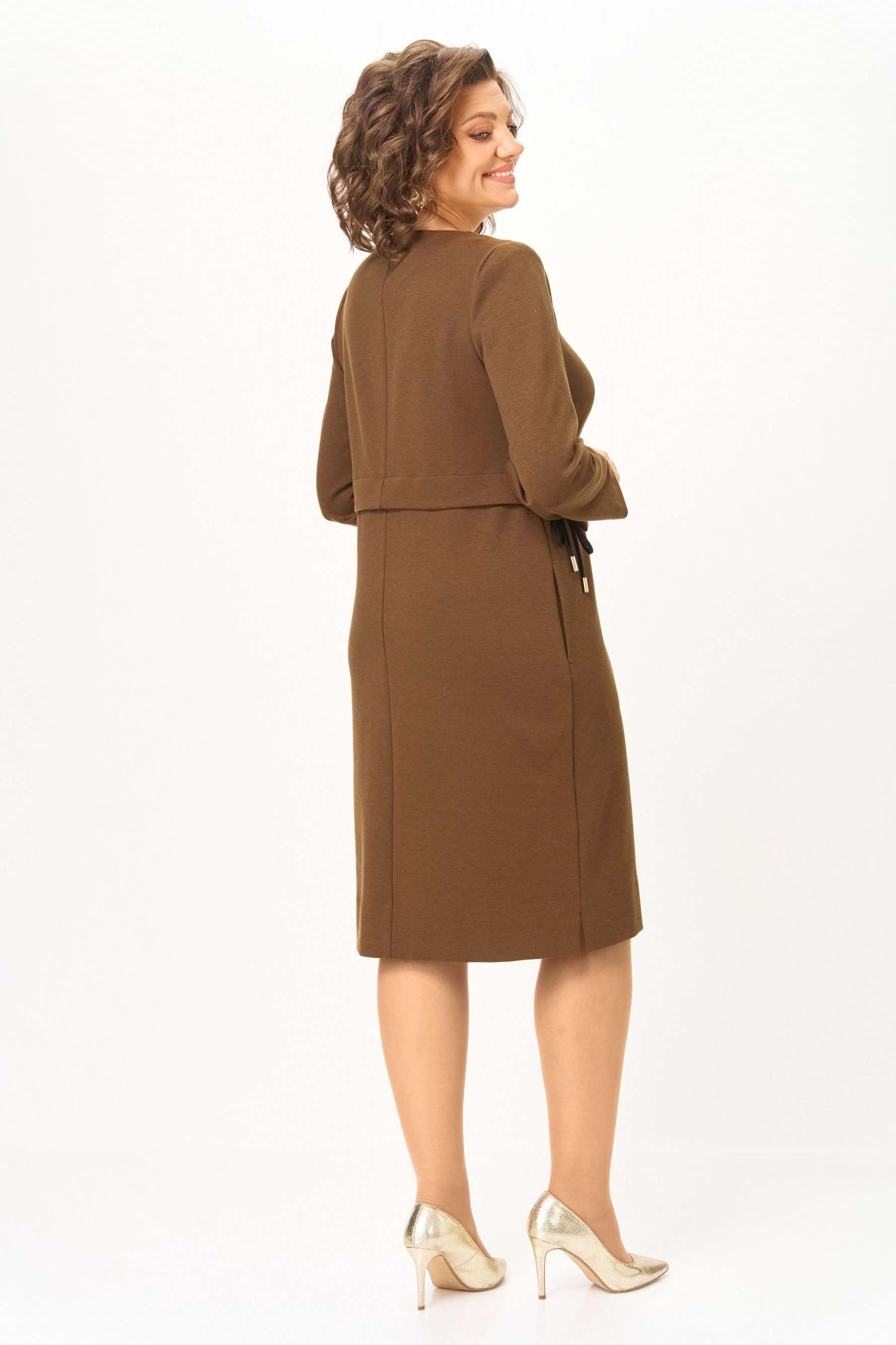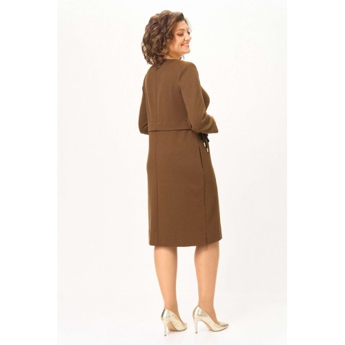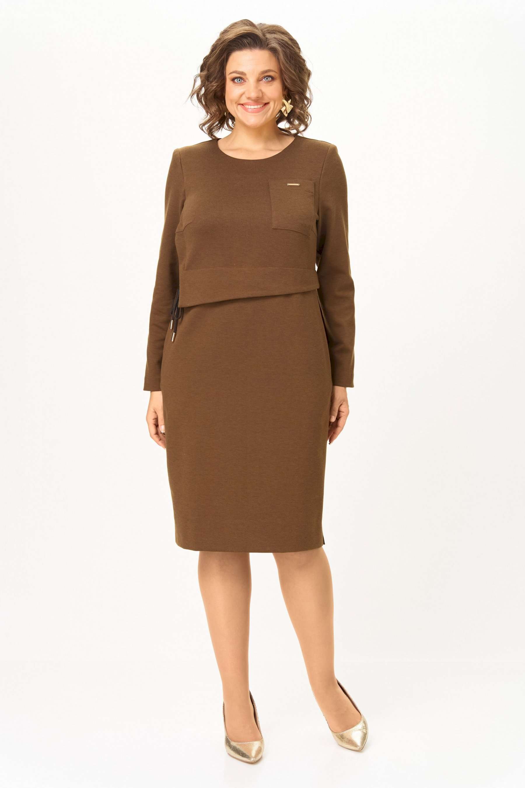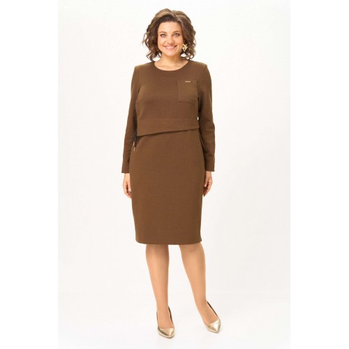 Элегантное женское платье, выполнено из трикотажного полотна. Платье полуприлигающего силуэта. По переду и спинке фигурный подрез на уровне талии. По левой стороне переда на уровне груди накладной карман с пришивной брошкой, горловина круглая, талия собрана на кулису. Рукава втачные. Брошка на груди может отличаться! Длина платья по спинке – 102 см Длина рукава – 61 см