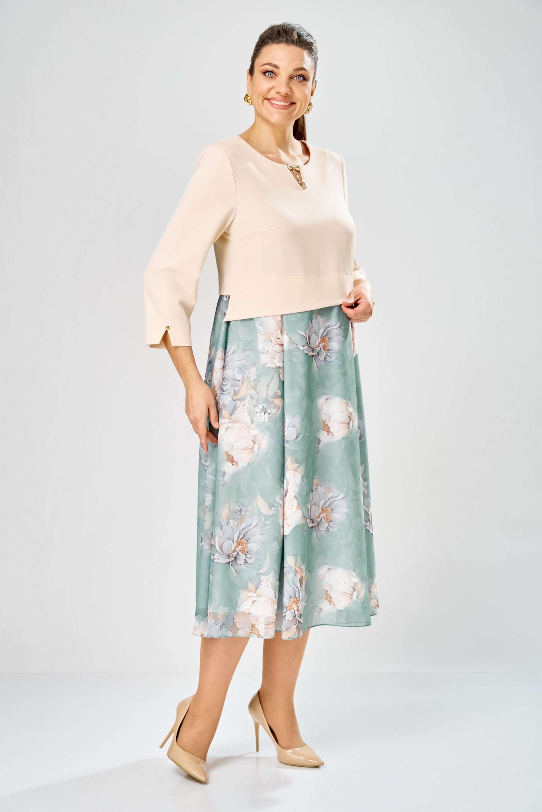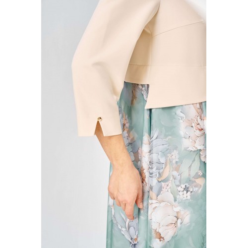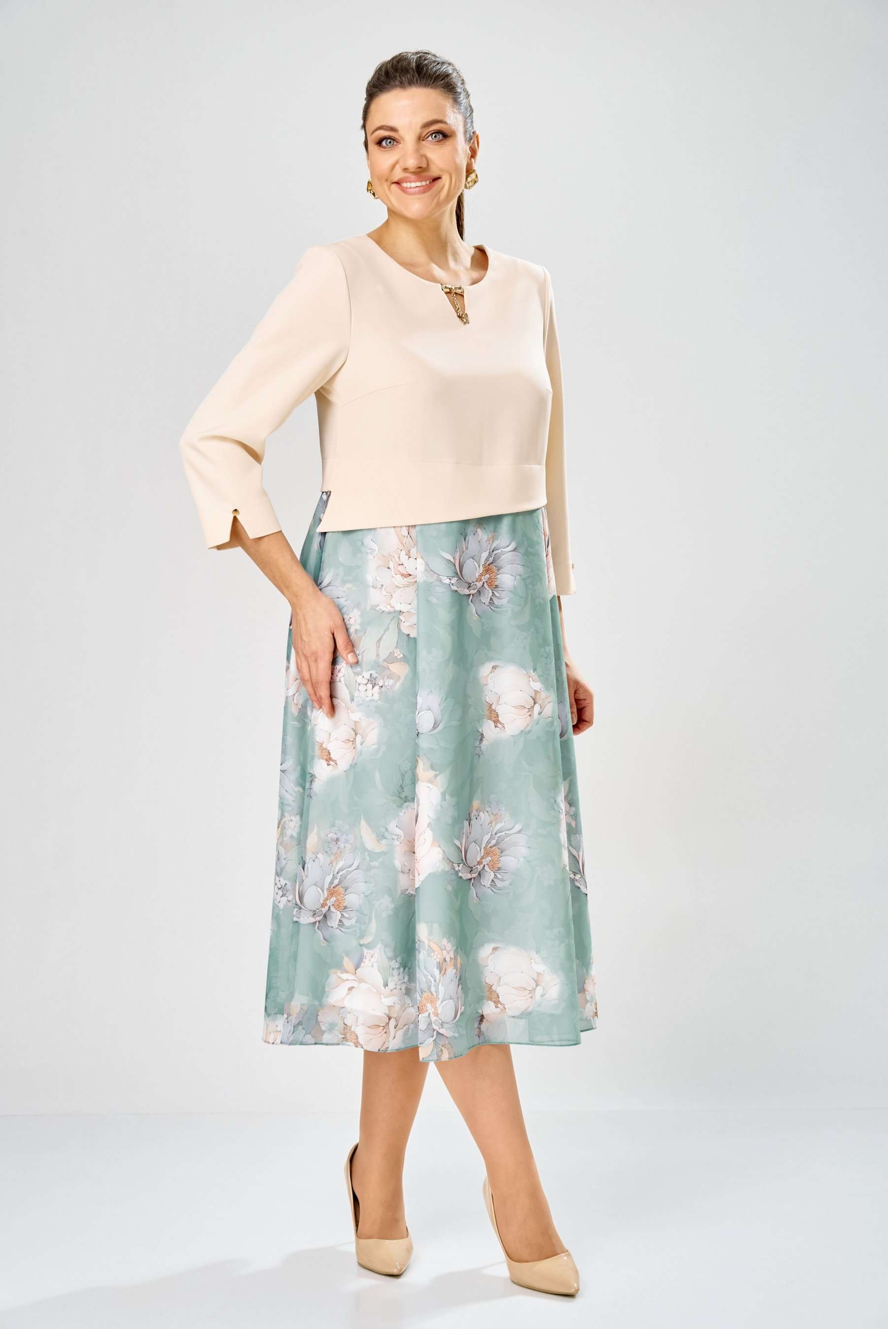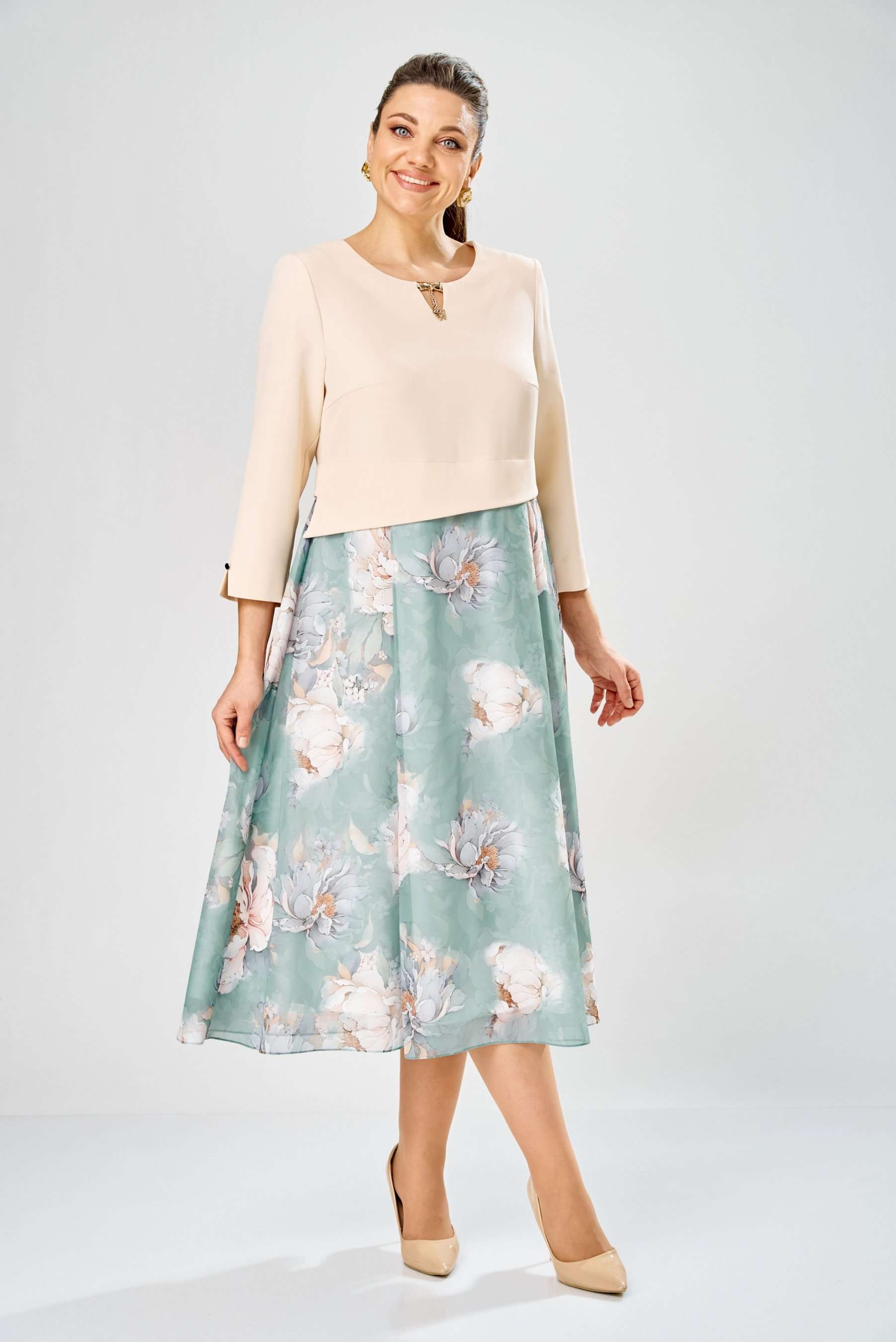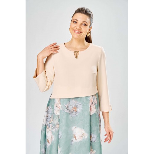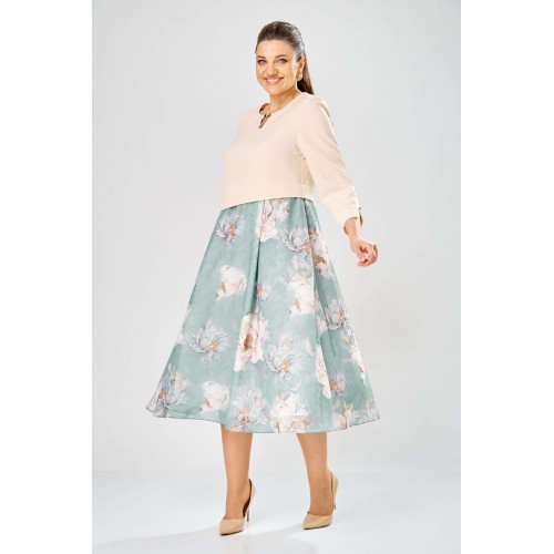 Элегантное женское платье, выполнено из двух видов ткани. Лиф из плательной ткани, горловина круглая с декоративным элементом по центру, по низу лифа ответная складка, по переду низ асимметричный, рукава втачные, по низу декоративный элемент с пуговицей. Юбка платья из шифона, расширенная со складками, на подкладке. Длина платья – 113 см Длина рукава – 50 см