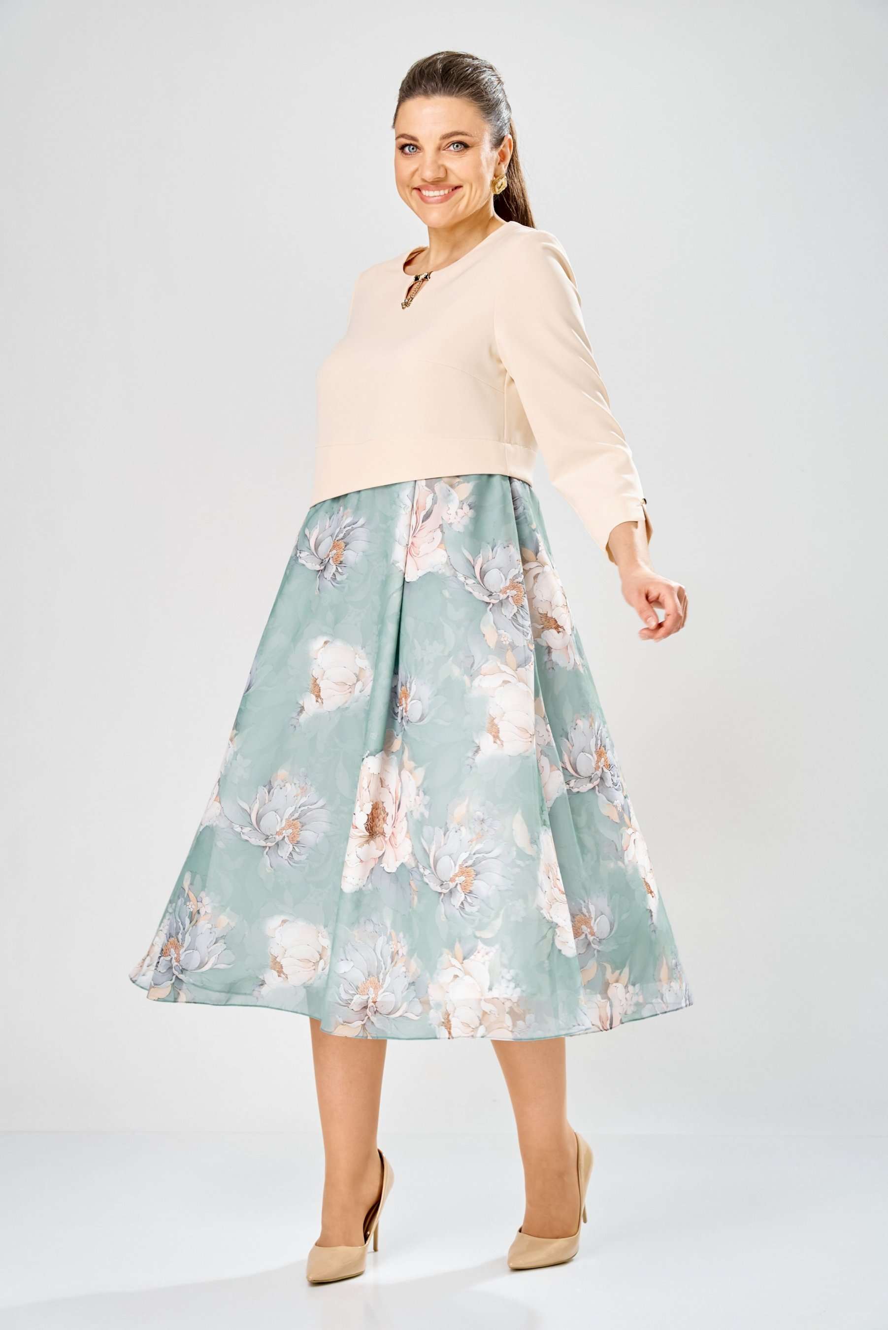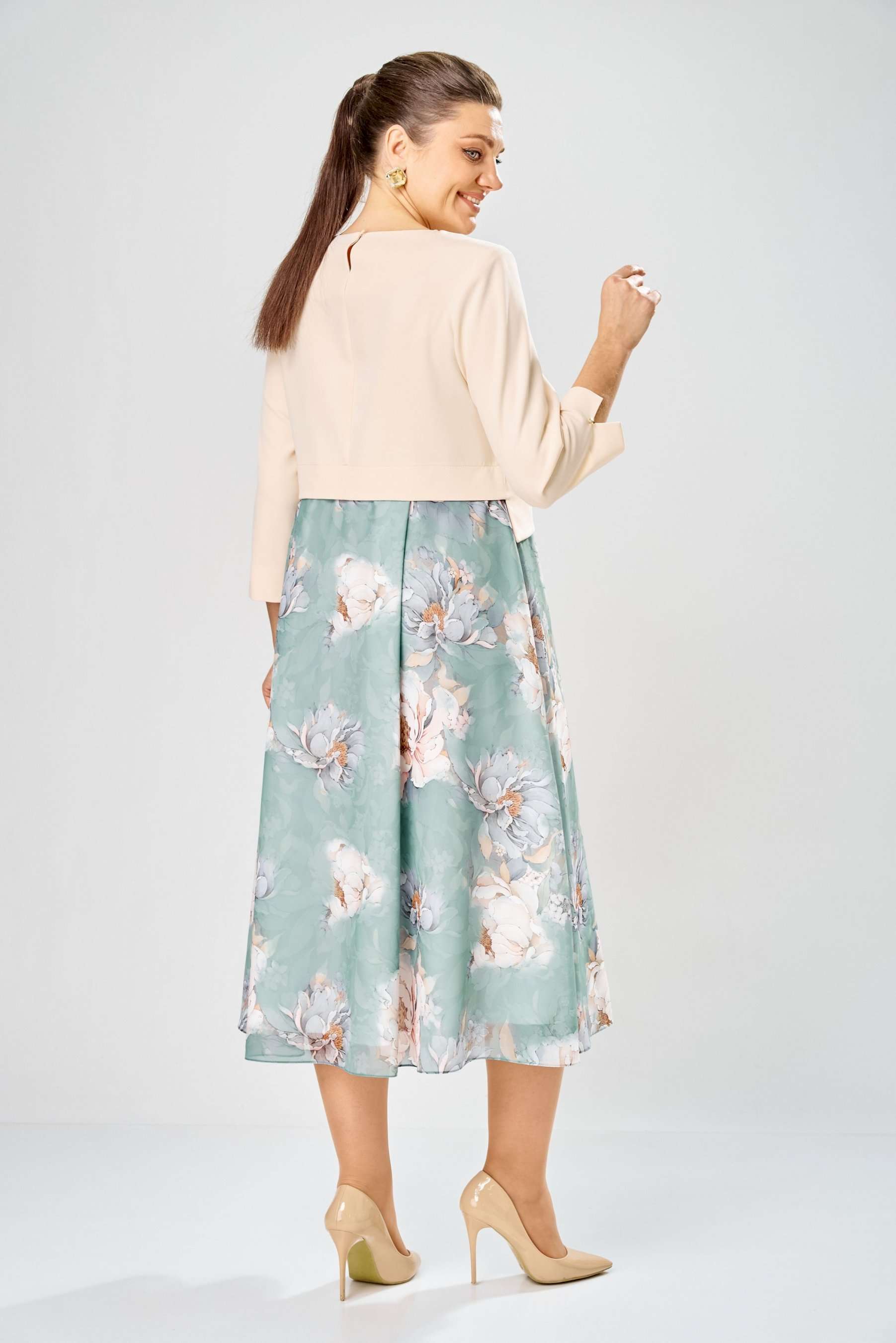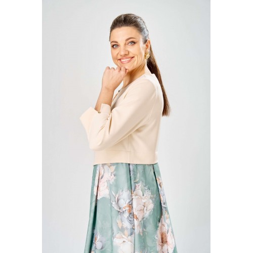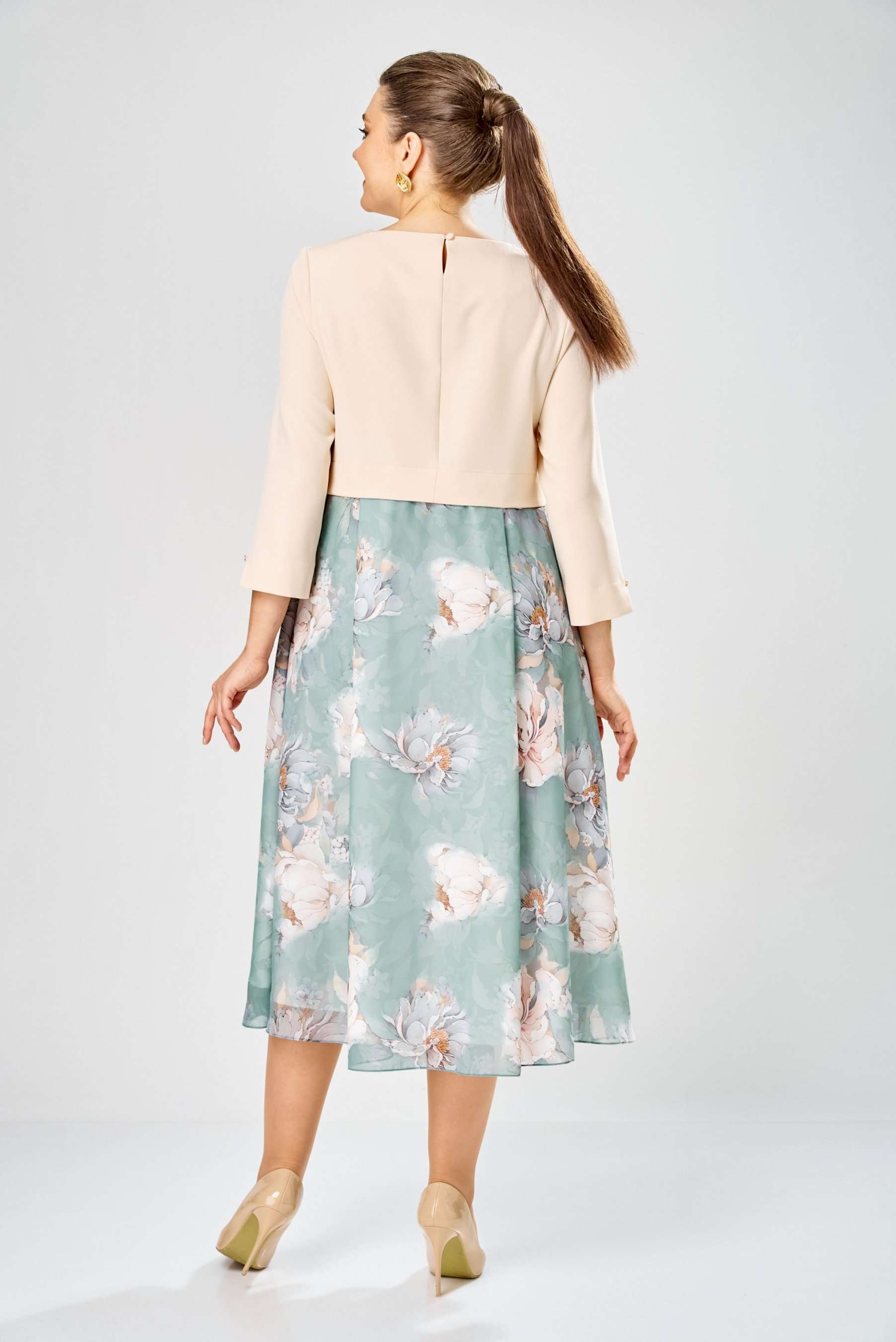 Элегантное женское платье, выполнено из двух видов ткани. Лиф из плательной ткани, горловина круглая с декоративным элементом по центру, по низу лифа ответная складка, по переду низ асимметричный, рукава втачные, по низу декоративный элемент с пуговицей. Юбка платья из шифона, расширенная со складками, на подкладке. Длина платья – 113 см Длина рукава – 50 см