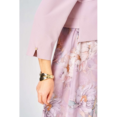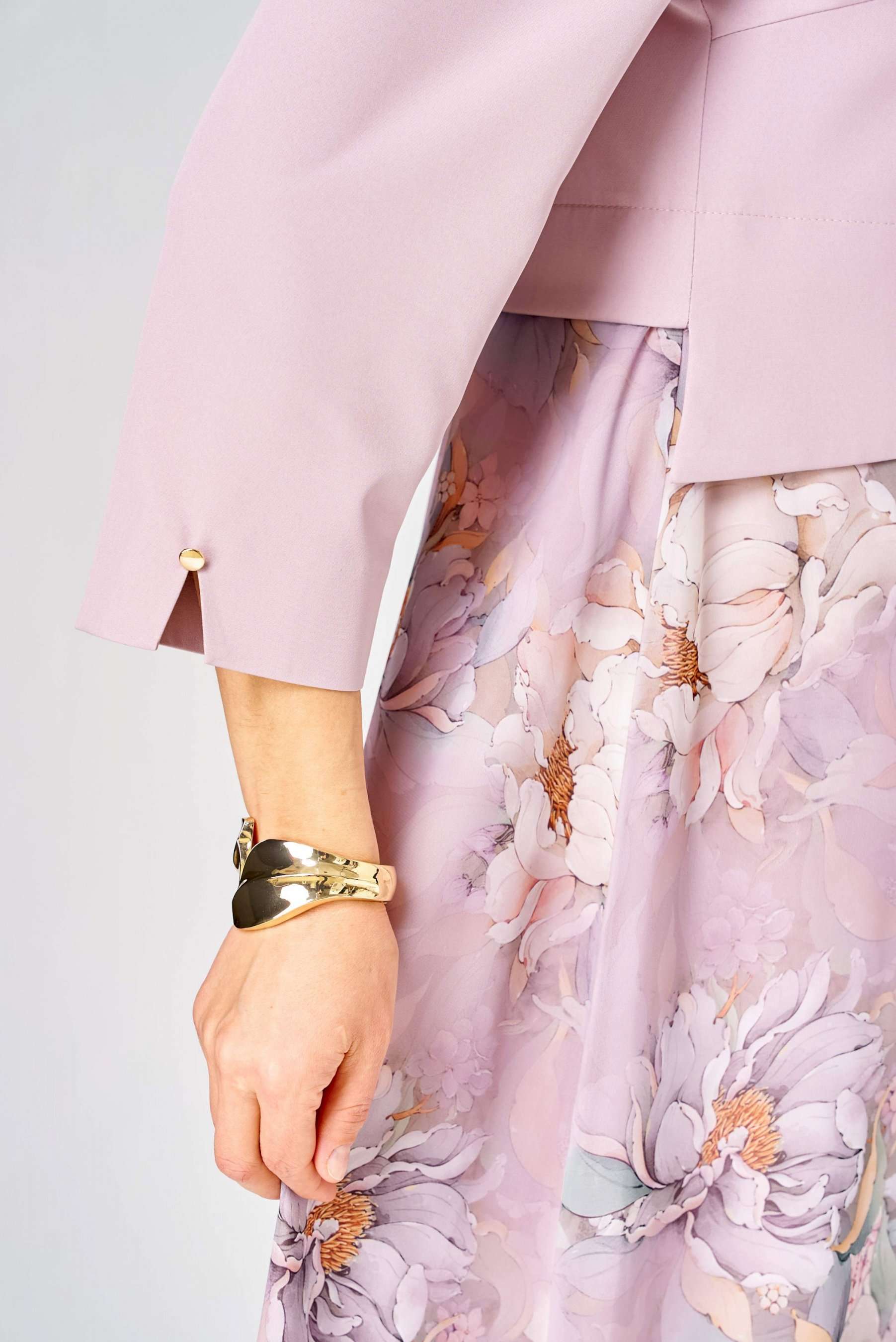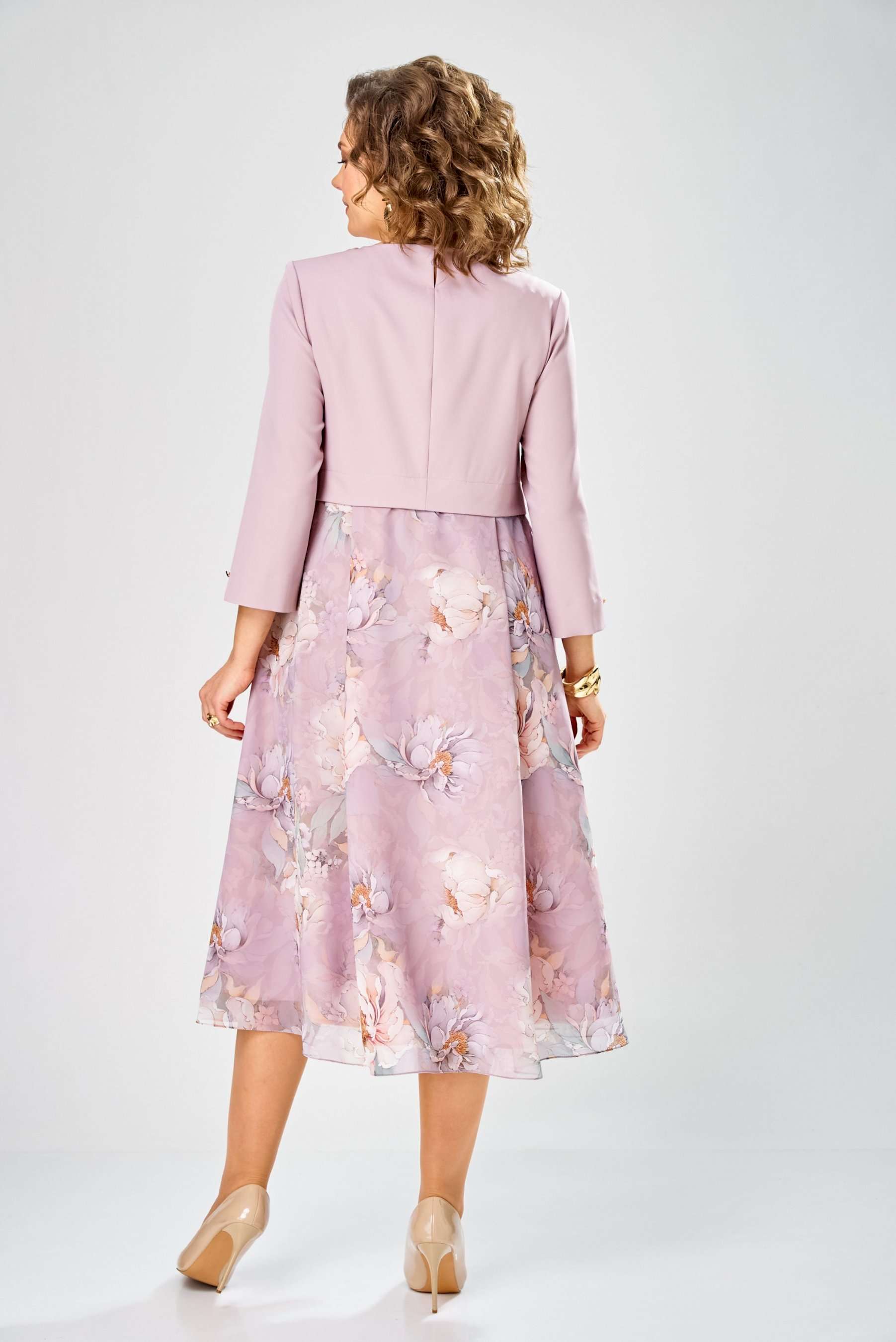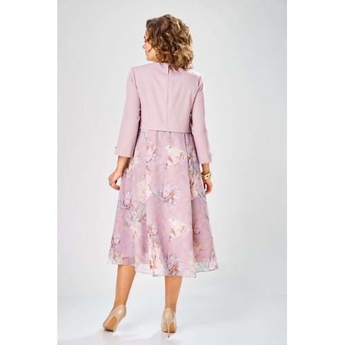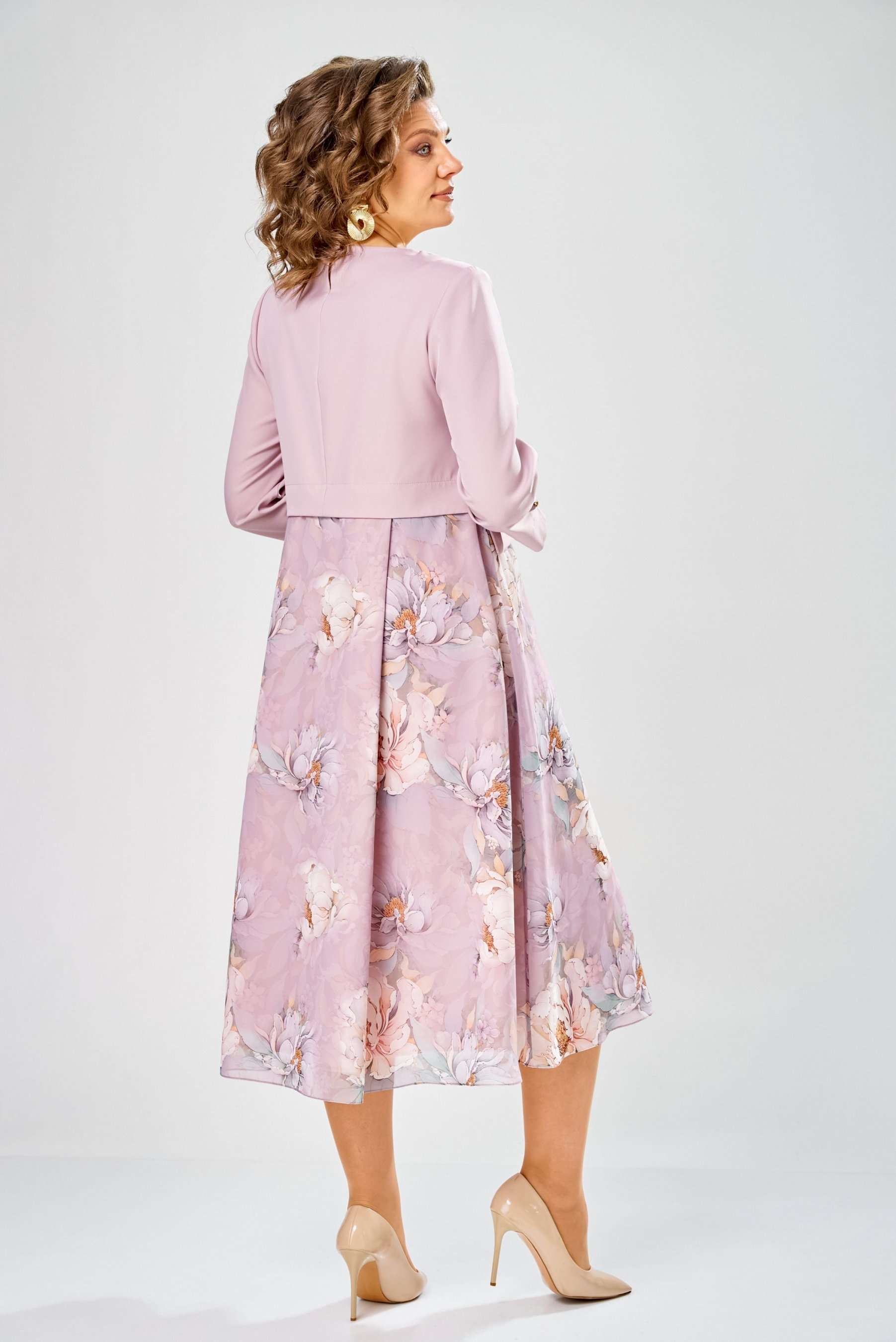 Элегантное женское платье, выполнено из двух видов ткани. Лиф из плательной ткани, горловина круглая с декоративным элементом по центру, по низу лифа ответная складка, по переду низ асимметричный, рукава втачные, по низу декоративный элемент с пуговицей. Юбка платья из шифона, расширенная со складками, на подкладке. Длина платья – 113 см Длина рукава – 50 см