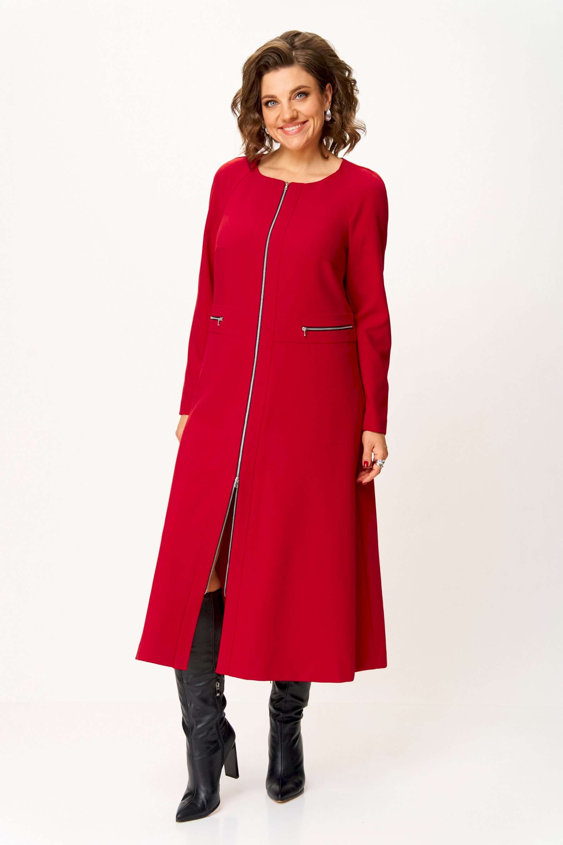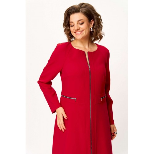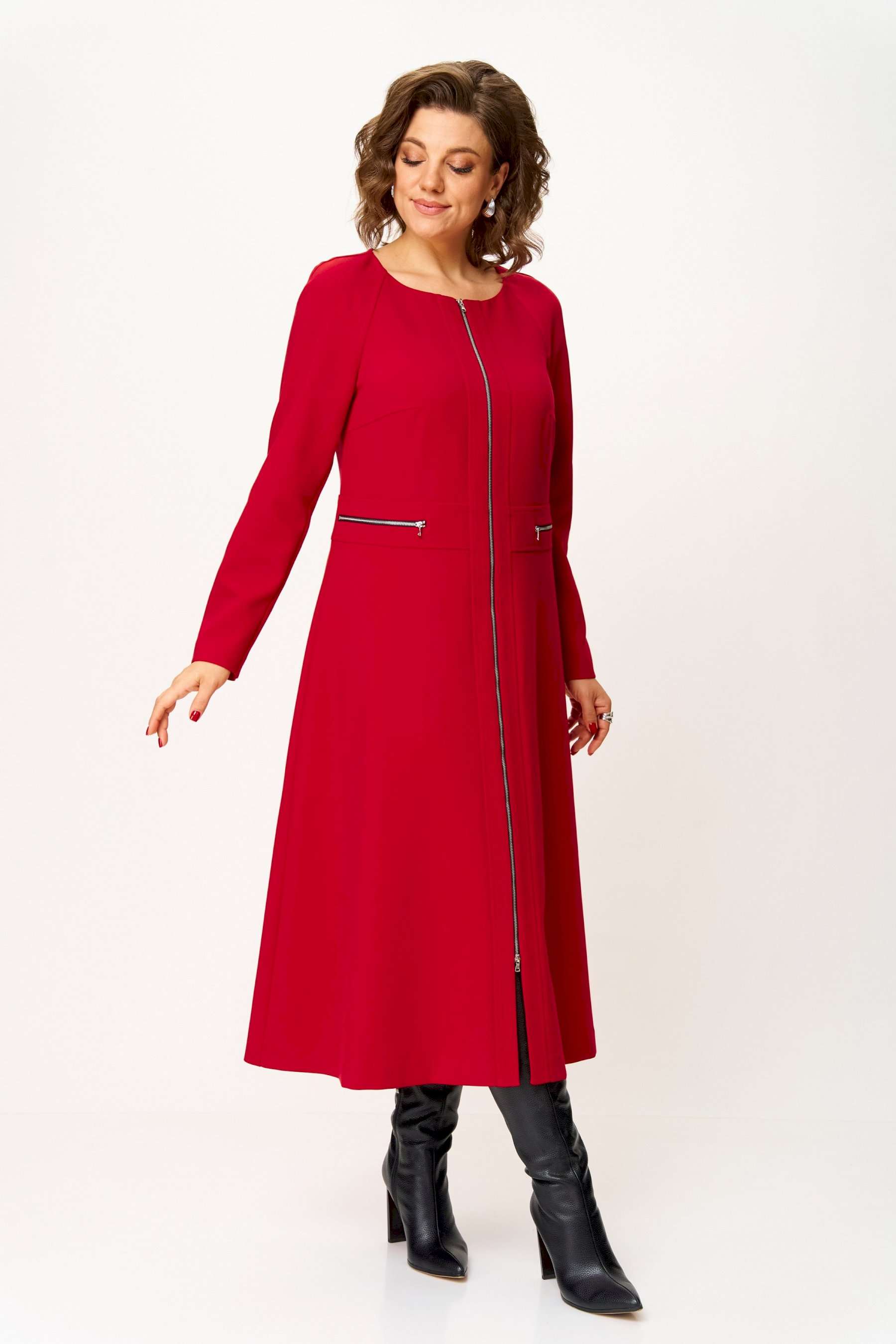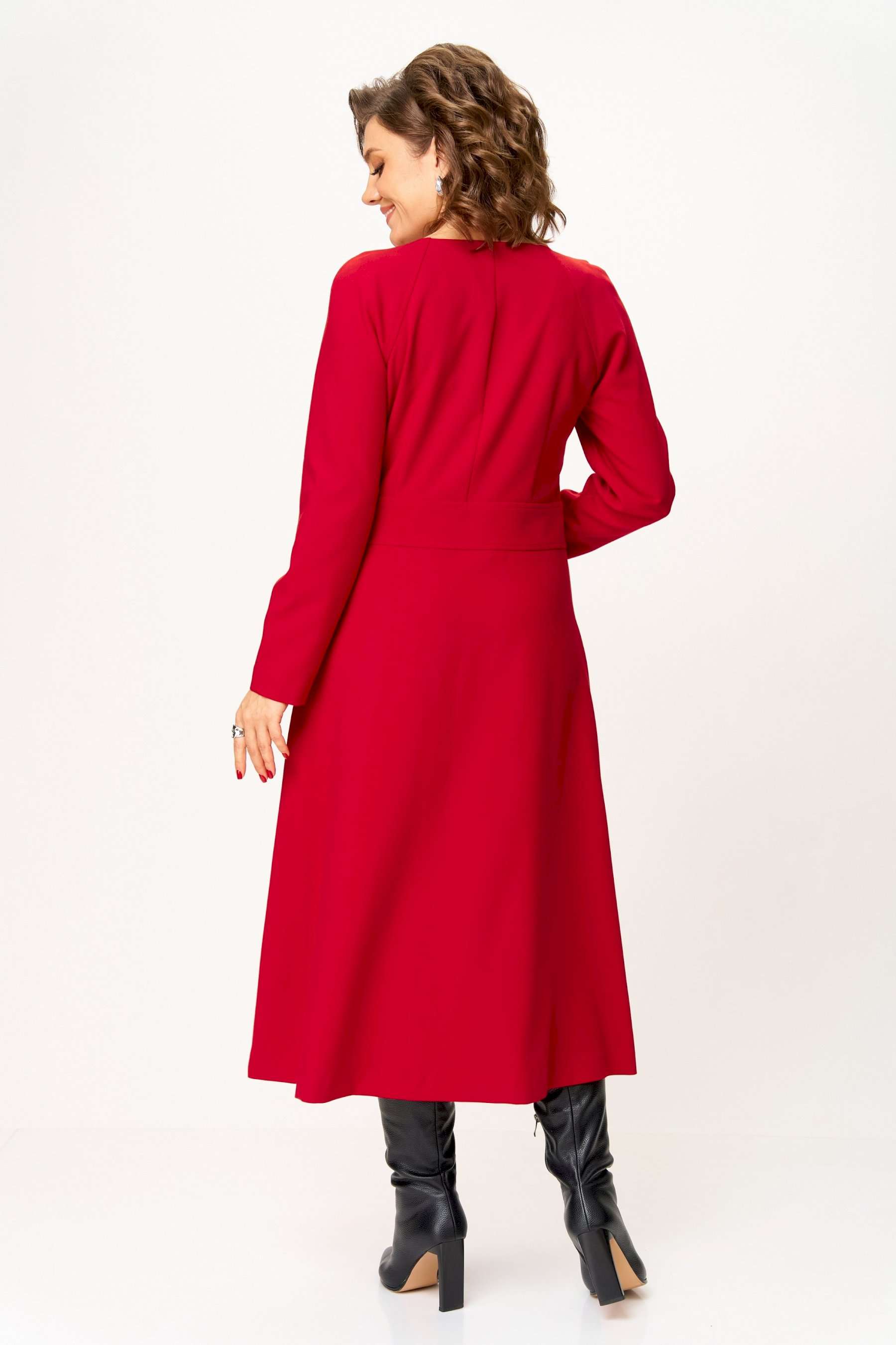 Стильное женское платье полуприлегающего силуэта. Платье в актуальной длине миди, из плательной ткани. Платье с центральной застежкой на тесьму молния, отрезное по линии талии с широким втачным поясом на поясе обработаны декоративные молнии. Горловина круглая. Рукава реглан с плечевой вытачкой. Платье без подкладки. Длина платья – 120 см Длина рукава от горловины – 71 см