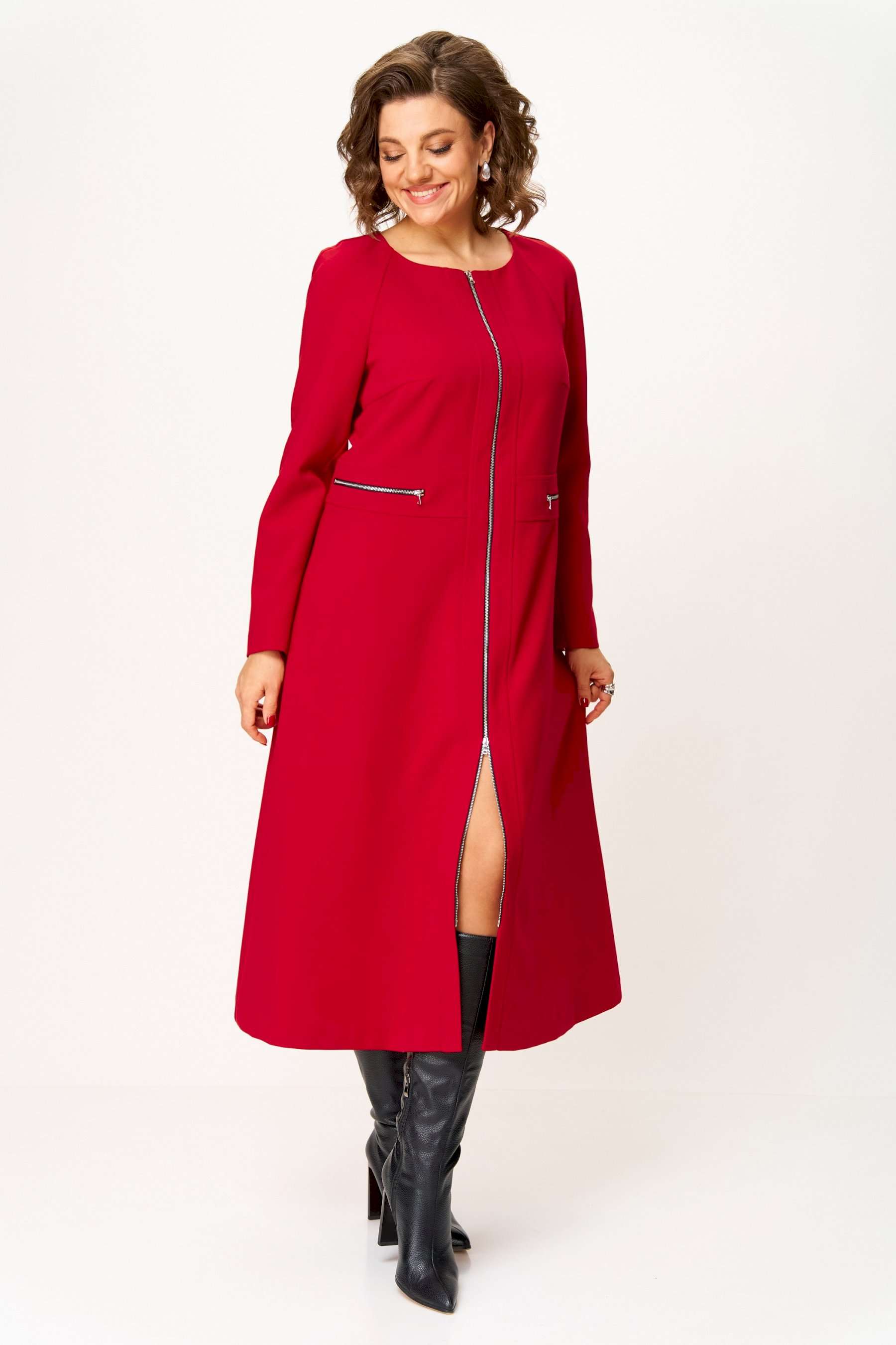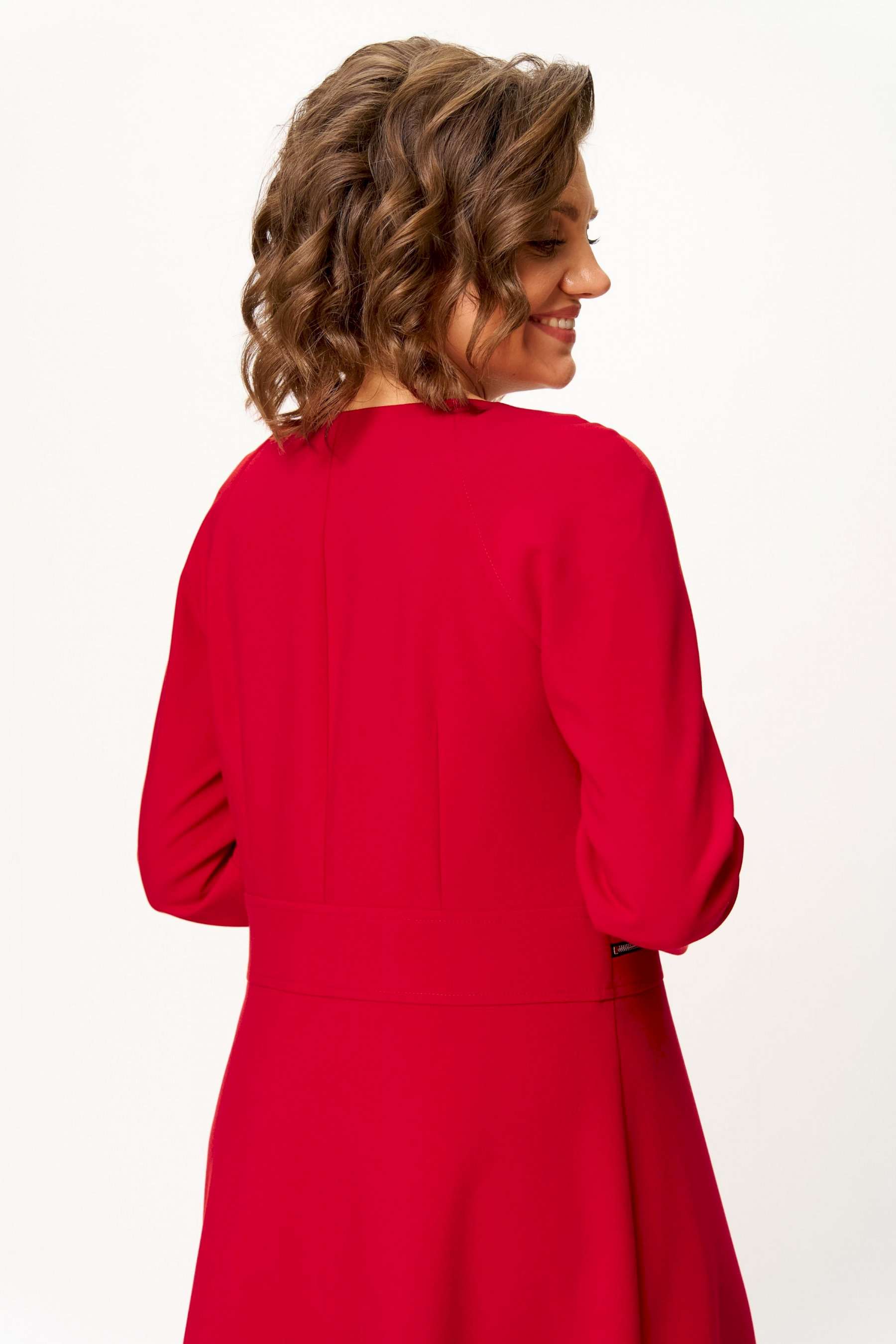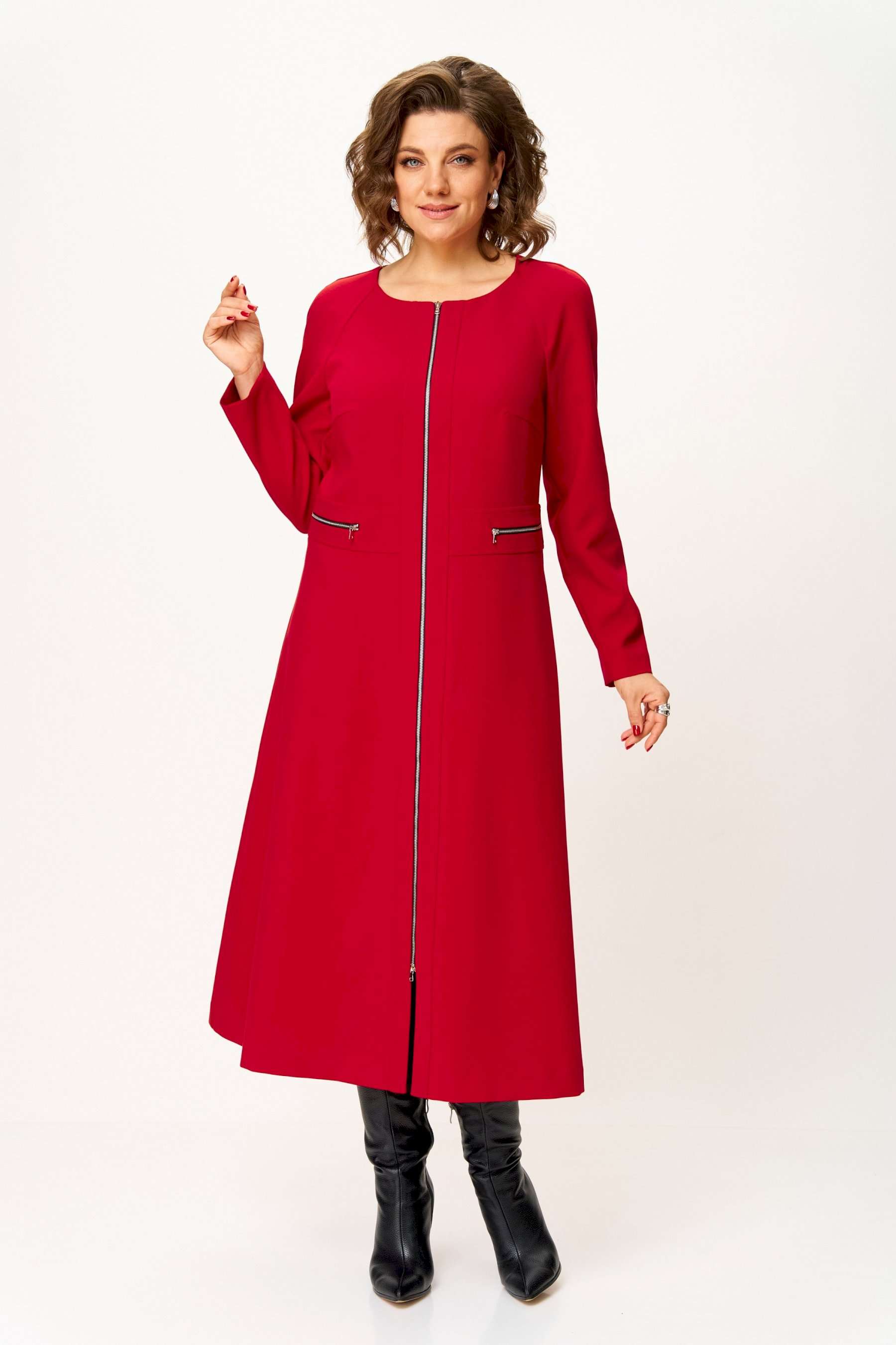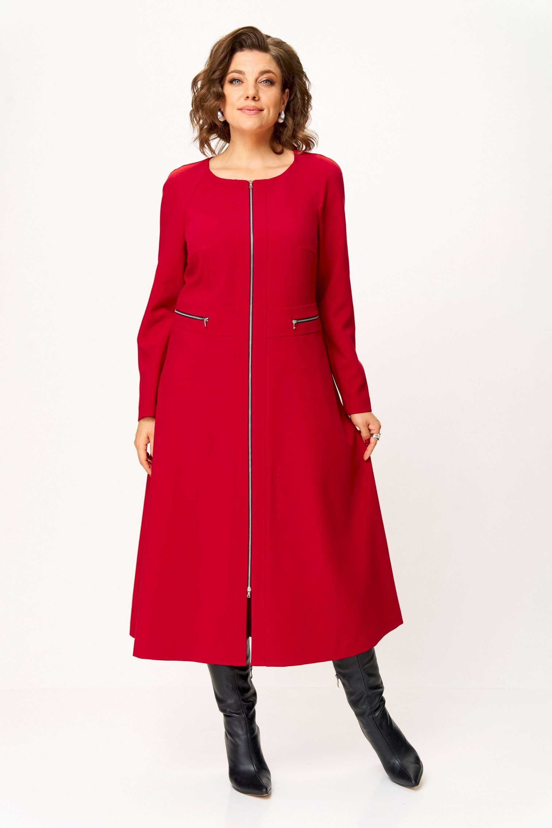Стильное женское платье полуприлегающего силуэта. Платье в актуальной длине миди, из плательной ткани. Платье с центральной застежкой на тесьму молния, отрезное по линии талии с широким втачным поясом на поясе обработаны декоративные молнии. Горловина круглая. Рукава реглан с плечевой вытачкой. Платье без подкладки. Длина платья – 120 см Длина рукава от горловины – 71 см
