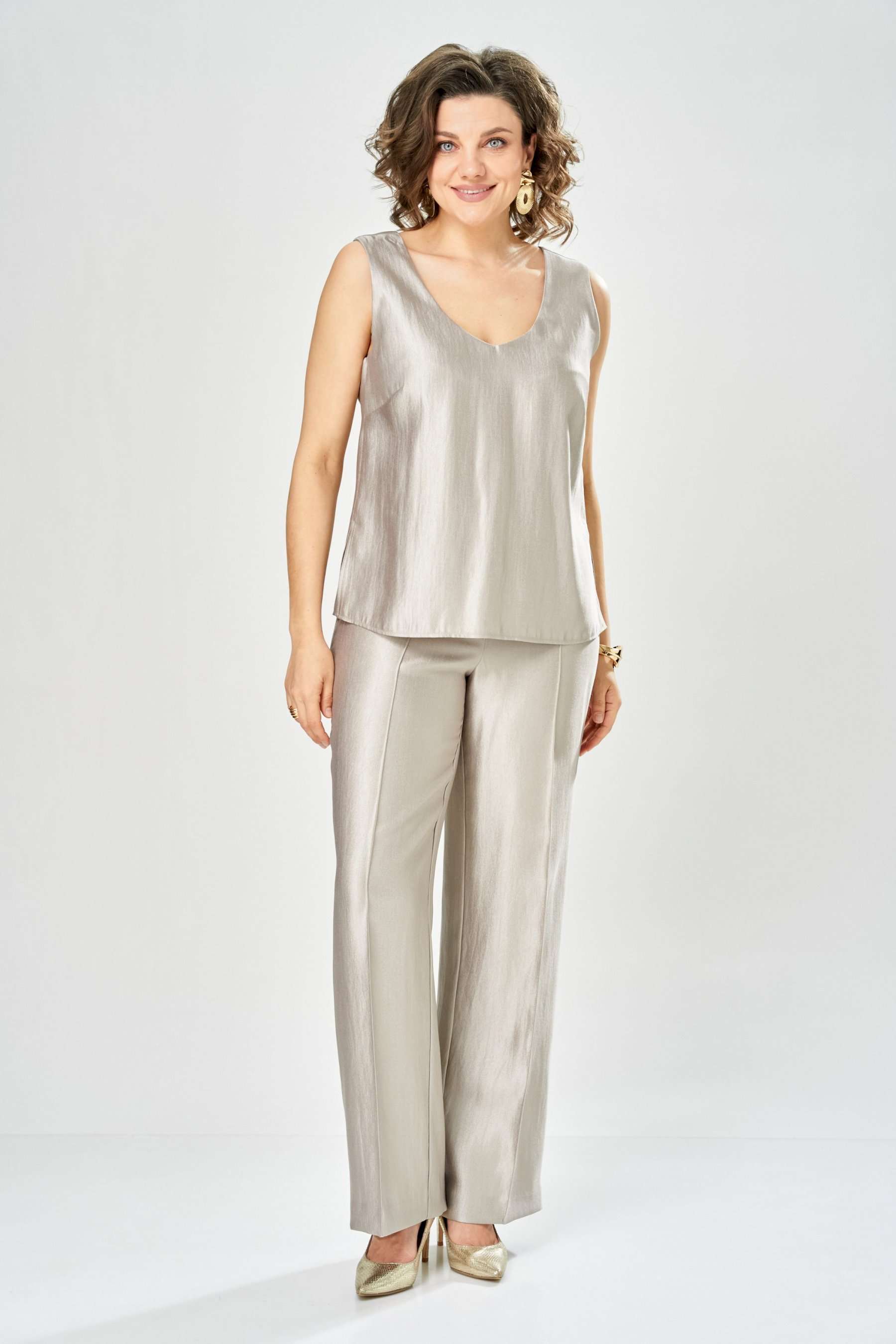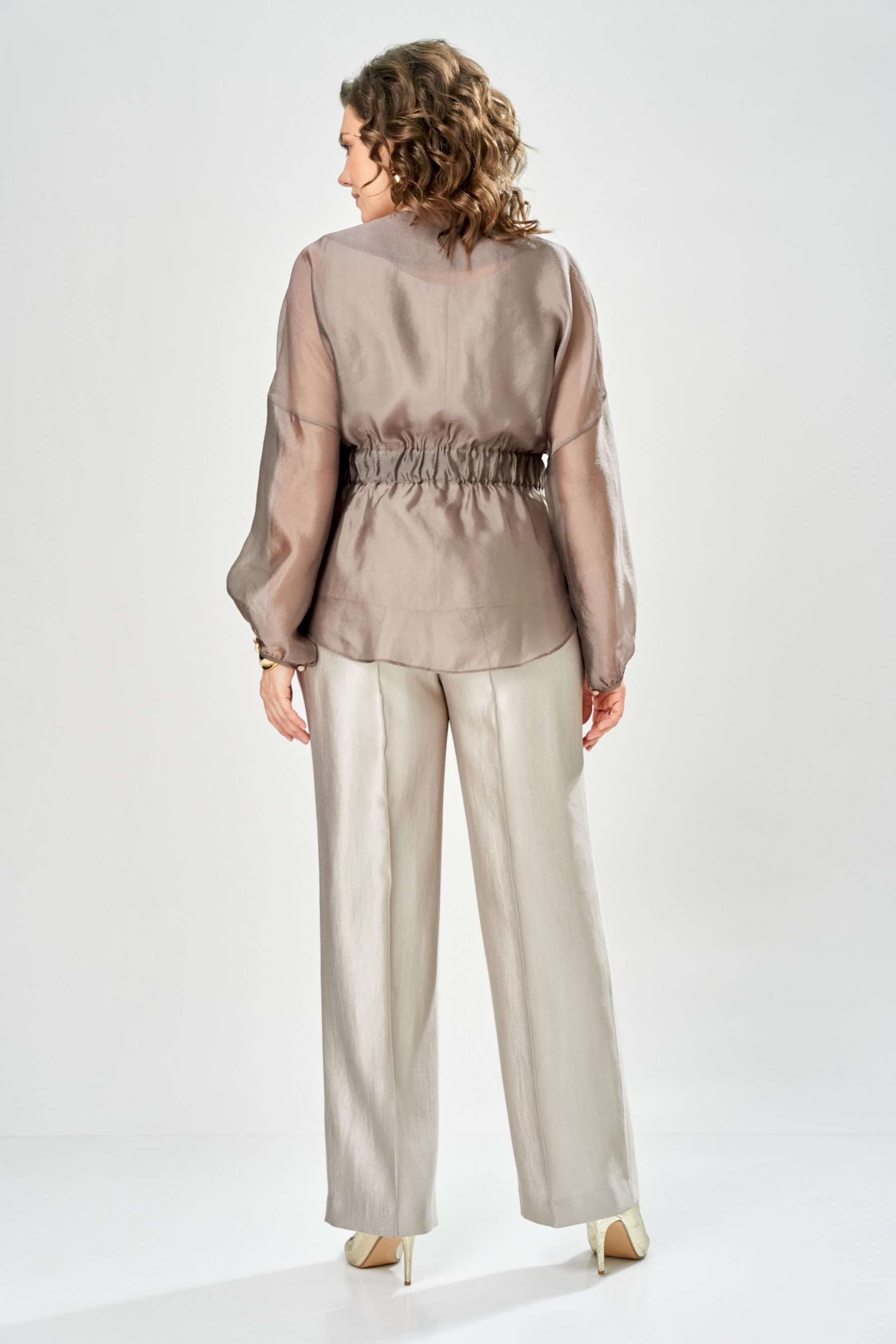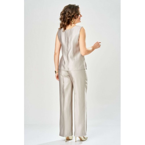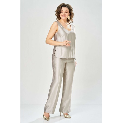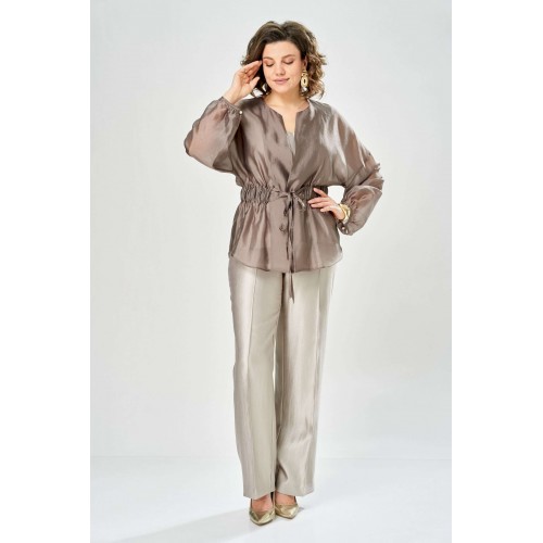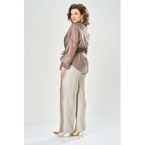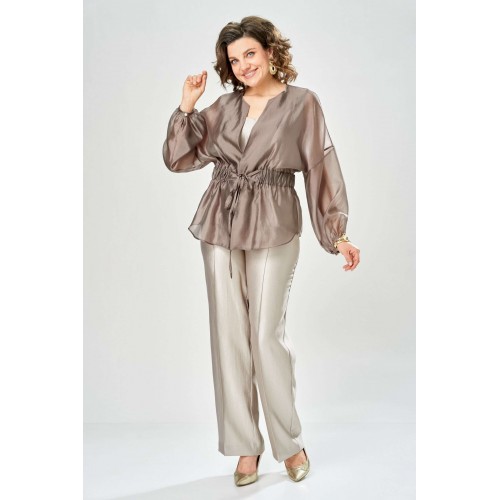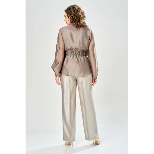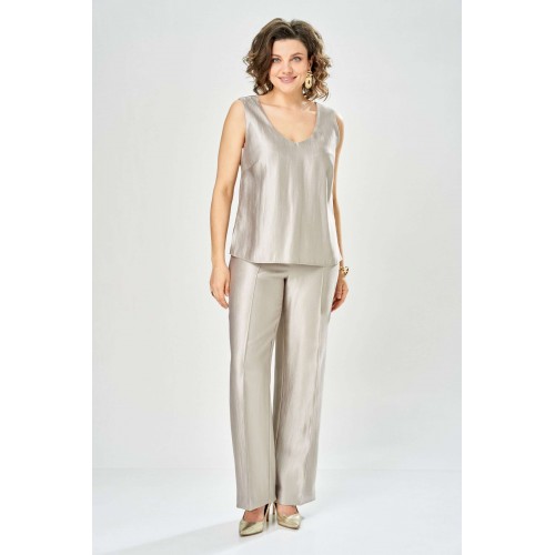 Комплект женский. Элегантный женский комплект состоит из трёх предметов, топа, блузы и брюк. Выполнен из двух видов ткани. Топ прилегающего силуэта из плательной ткани с небольшим блеском. Топ на широких бретелях. Горловина и пройма обработаны обтачкой. Брюки из той же ткани что и топ. Брюки прямого силуэта, с застроченными стрелками по переду и спинке. Застежка на молнию по линии банта, верх брюк на облачке. Блузон выполнен из полупрозрачной легкой ткани, свободного силуэта, без застежки, горловина круглая, линия плеча спущенная, рукава широкие со сборкой по низу. Блуза по линии талии собрана на резинку по центру переда фиксируется на завязки. Длина блузы – 74 см Длина рукава блузы – 38,5 см Ширина плеча блузы – 33,5 см Длина брюк по боковому срезу– 109 см Длина брюк по шаговому шву – 82 см Длина топа по среднему шву – 57 см Ширина бретели – 7 см