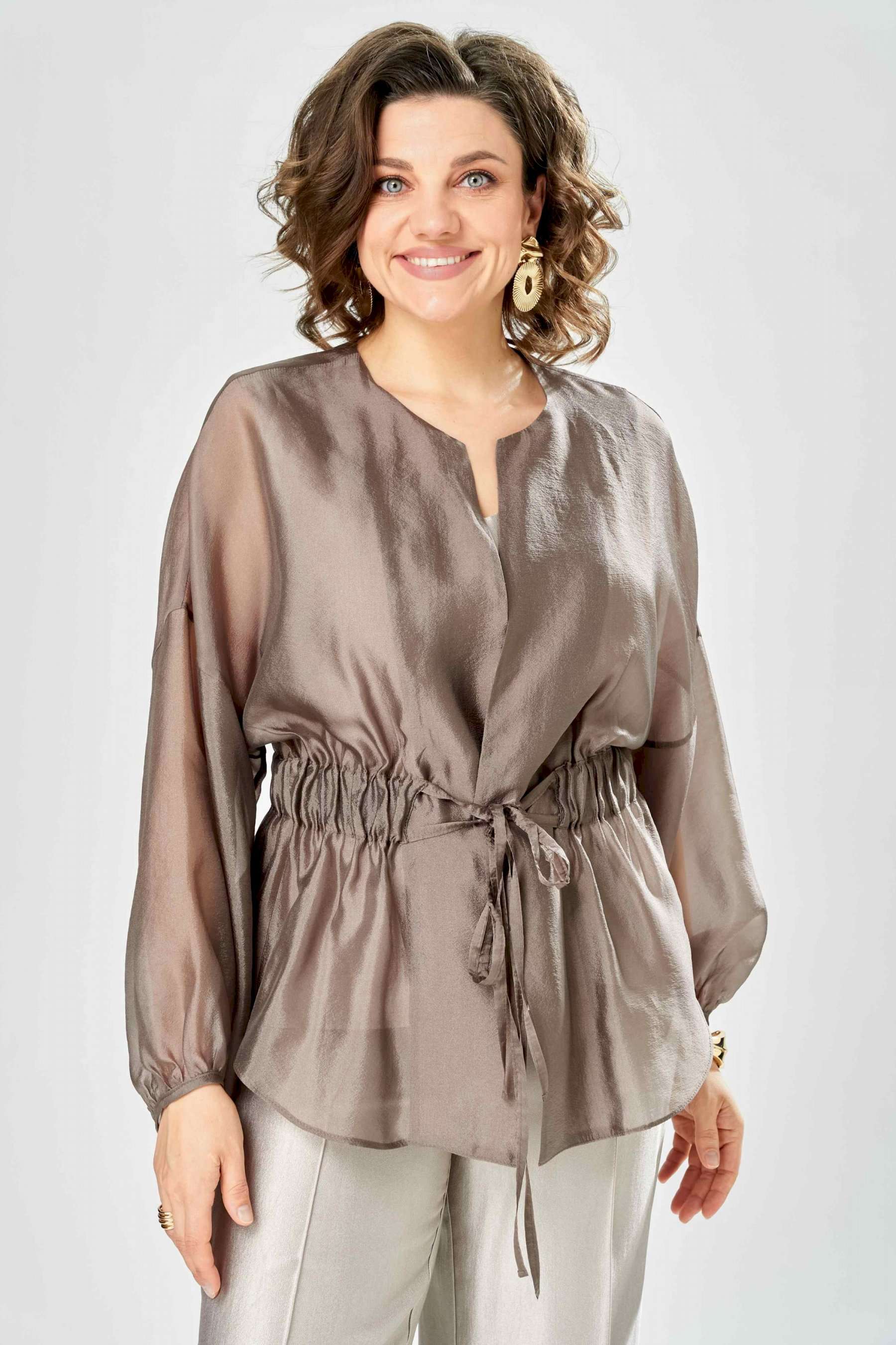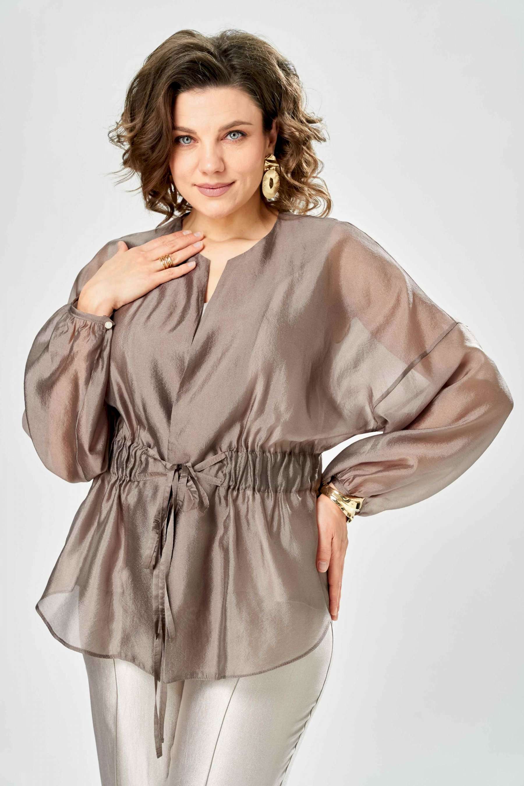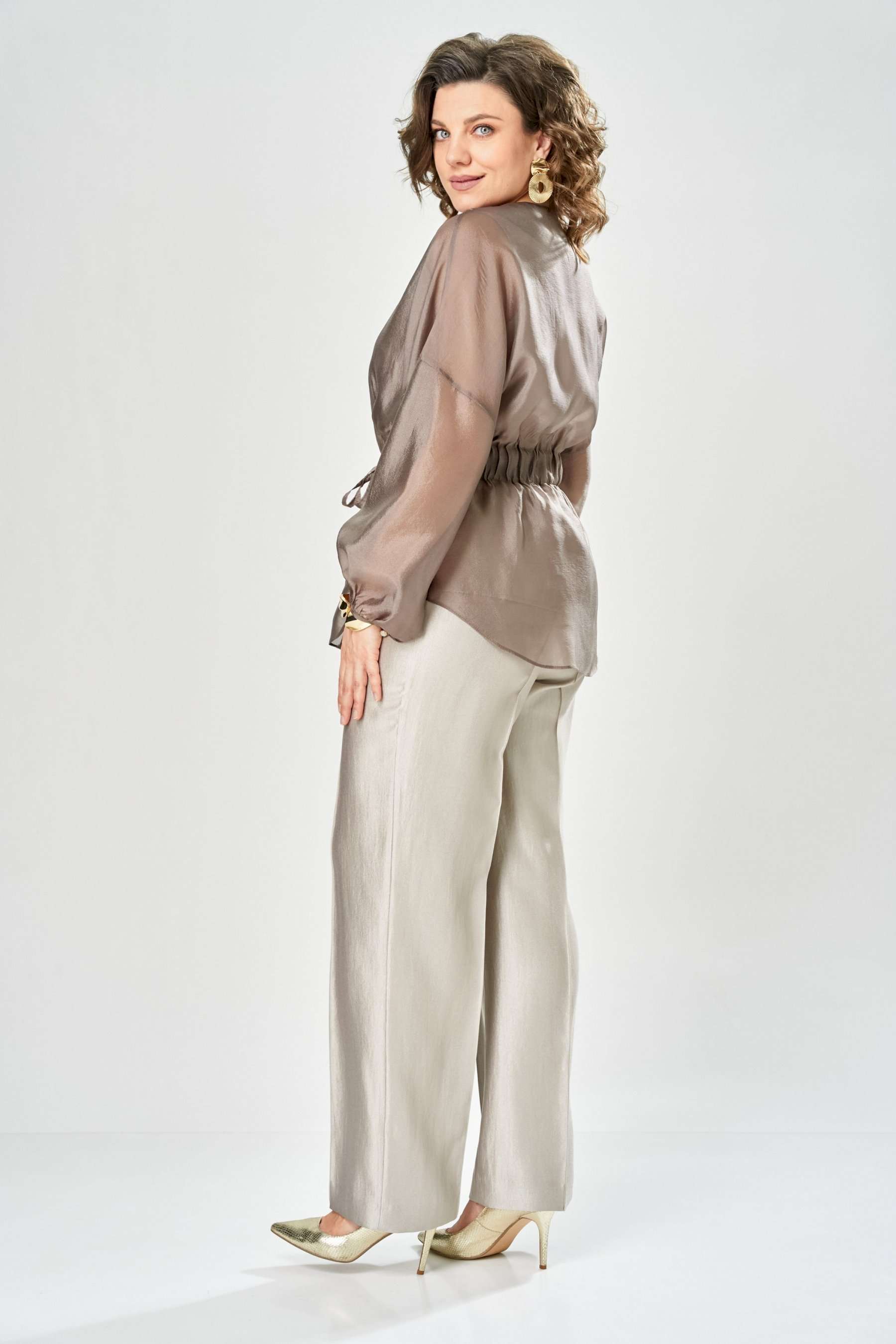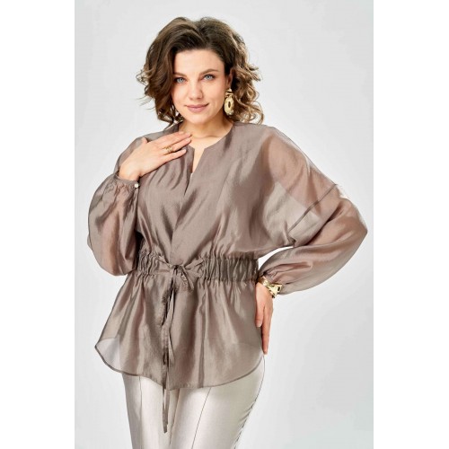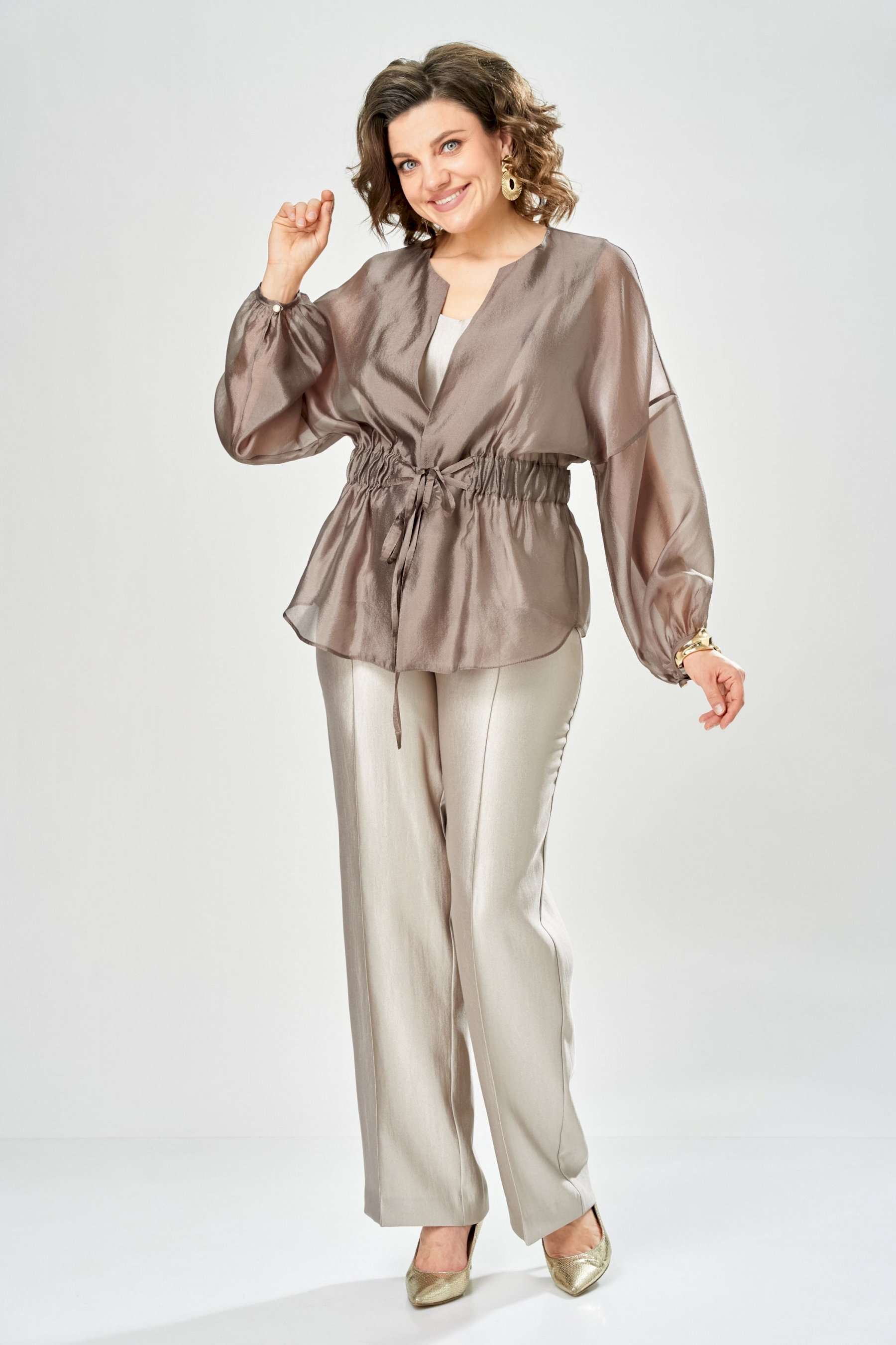 Комплект женский. Элегантный женский комплект состоит из трёх предметов, топа, блузы и брюк. Выполнен из двух видов ткани. Топ прилегающего силуэта из плательной ткани с небольшим блеском. Топ на широких бретелях. Горловина и пройма обработаны обтачкой. Брюки из той же ткани что и топ. Брюки прямого силуэта, с застроченными стрелками по переду и спинке. Застежка на молнию по линии банта, верх брюк на облачке. Блузон выполнен из полупрозрачной легкой ткани, свободного силуэта, без застежки, горловина круглая, линия плеча спущенная, рукава широкие со сборкой по низу. Блуза по линии талии собрана на резинку по центру переда фиксируется на завязки. Длина блузы – 74 см Длина рукава блузы – 38,5 см Ширина плеча блузы – 33,5 см Длина брюк по боковому срезу– 109 см Длина брюк по шаговому шву – 82 см Длина топа по среднему шву – 57 см Ширина бретели – 7 см