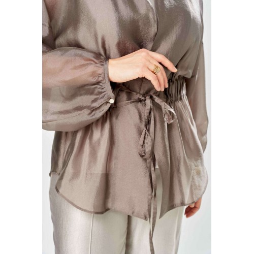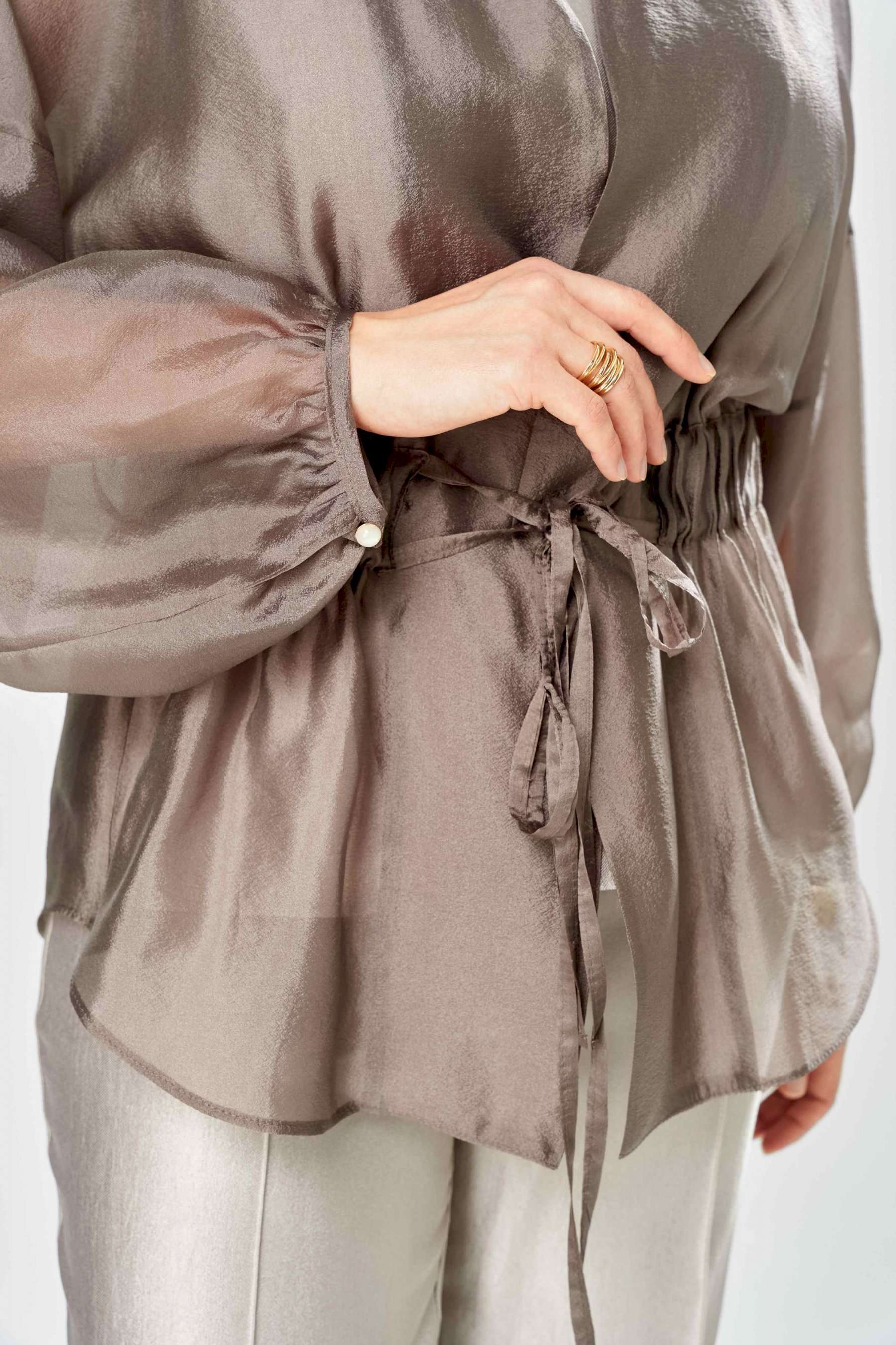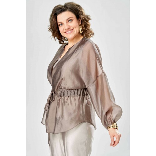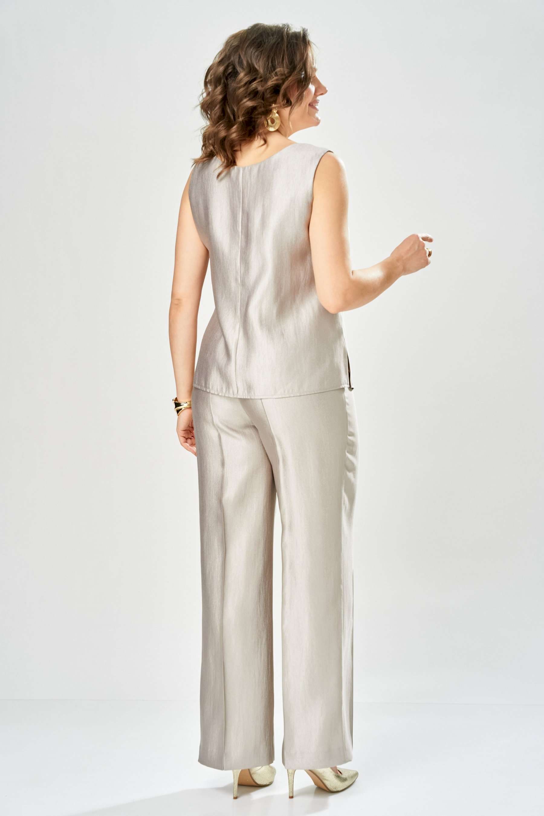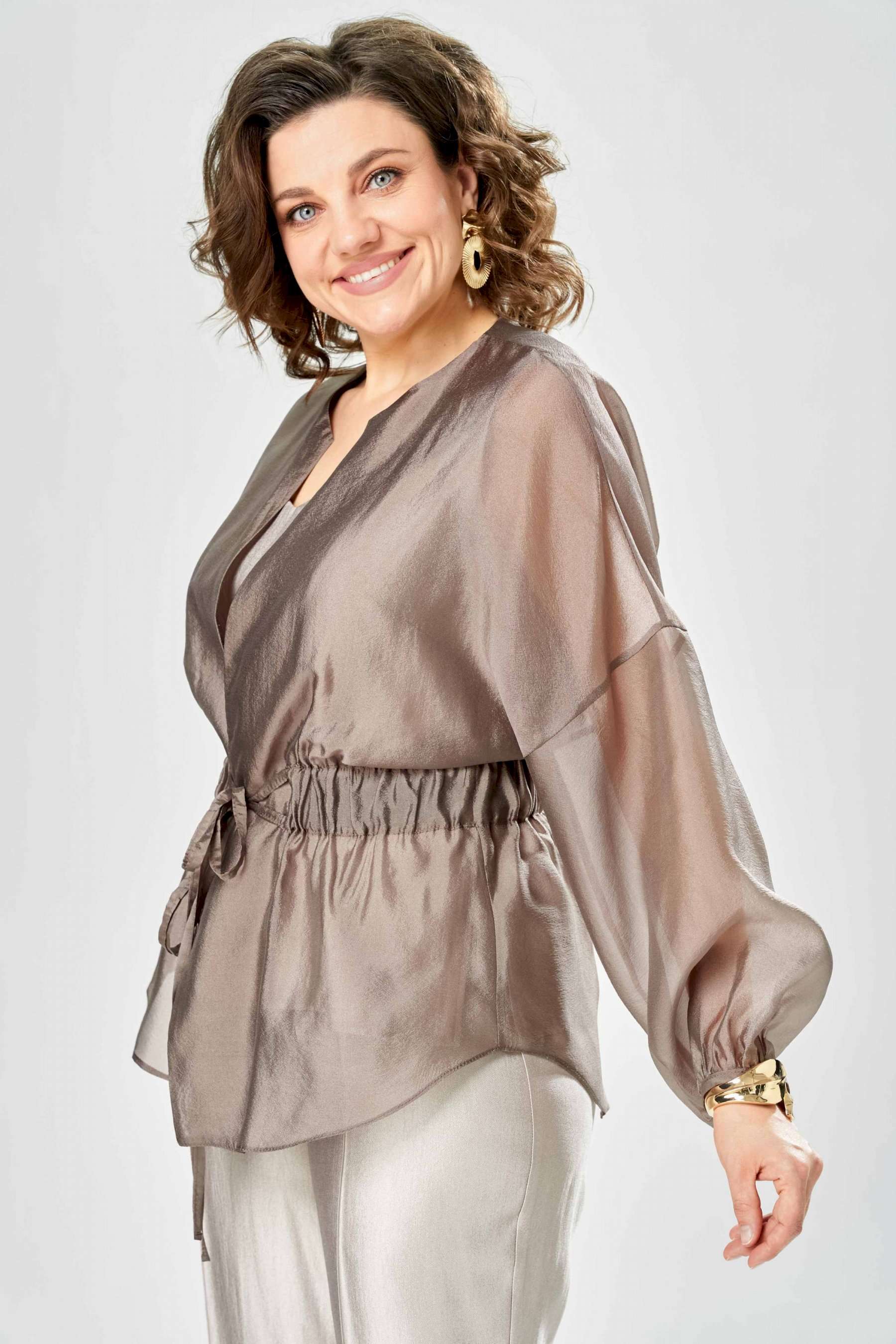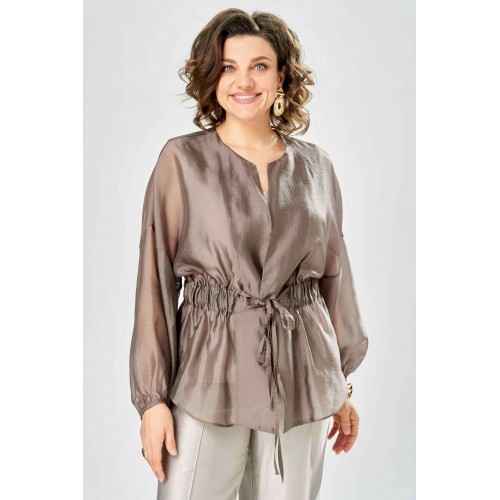 Комплект женский. Элегантный женский комплект состоит из трёх предметов, топа, блузы и брюк. Выполнен из двух видов ткани. Топ прилегающего силуэта из плательной ткани с небольшим блеском. Топ на широких бретелях. Горловина и пройма обработаны обтачкой. Брюки из той же ткани что и топ. Брюки прямого силуэта, с застроченными стрелками по переду и спинке. Застежка на молнию по линии банта, верх брюк на облачке. Блузон выполнен из полупрозрачной легкой ткани, свободного силуэта, без застежки, горловина круглая, линия плеча спущенная, рукава широкие со сборкой по низу. Блуза по линии талии собрана на резинку по центру переда фиксируется на завязки. Длина блузы – 74 см Длина рукава блузы – 38,5 см Ширина плеча блузы – 33,5 см Длина брюк по боковому срезу– 109 см Длина брюк по шаговому шву – 82 см Длина топа по среднему шву – 57 см Ширина бретели – 7 см