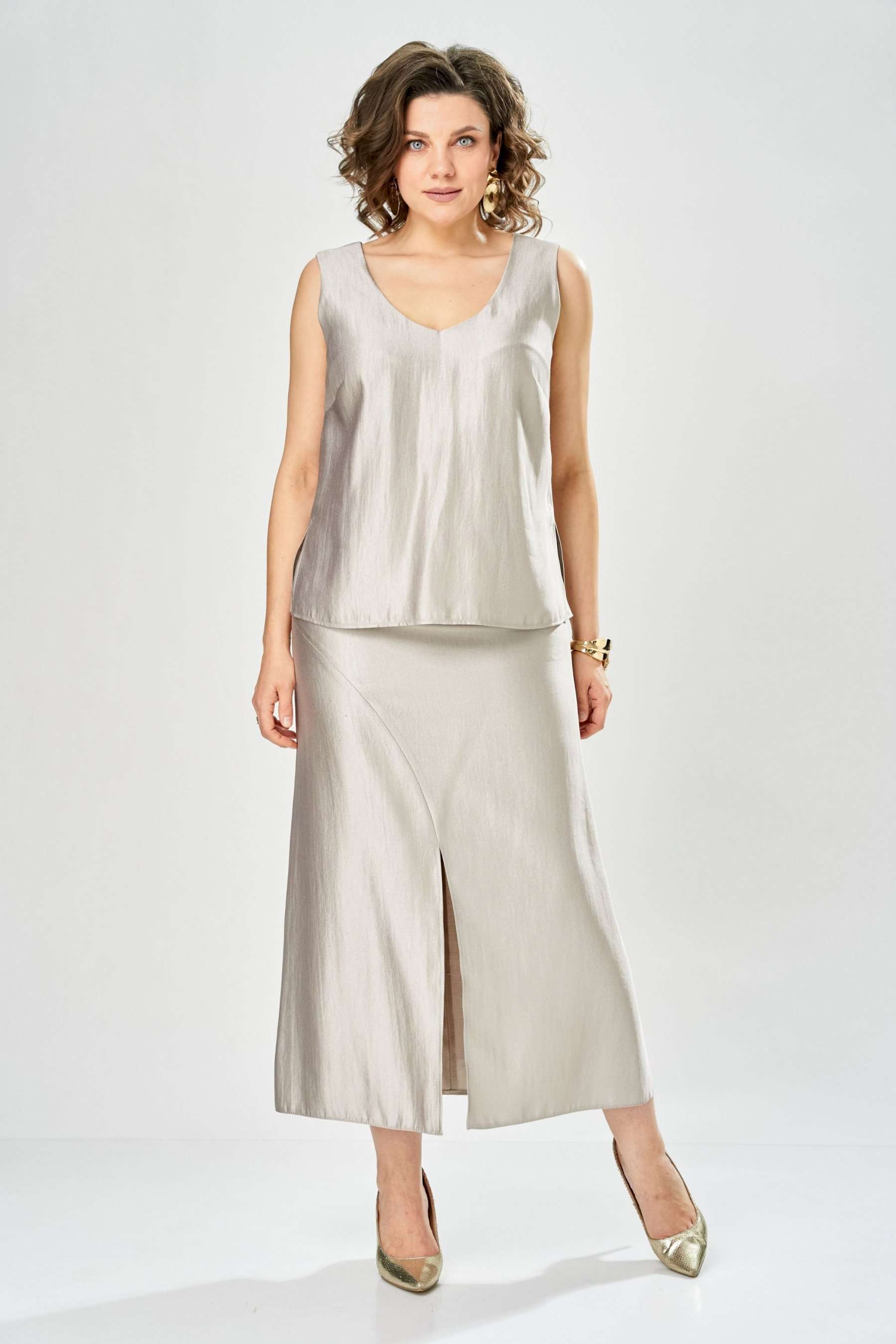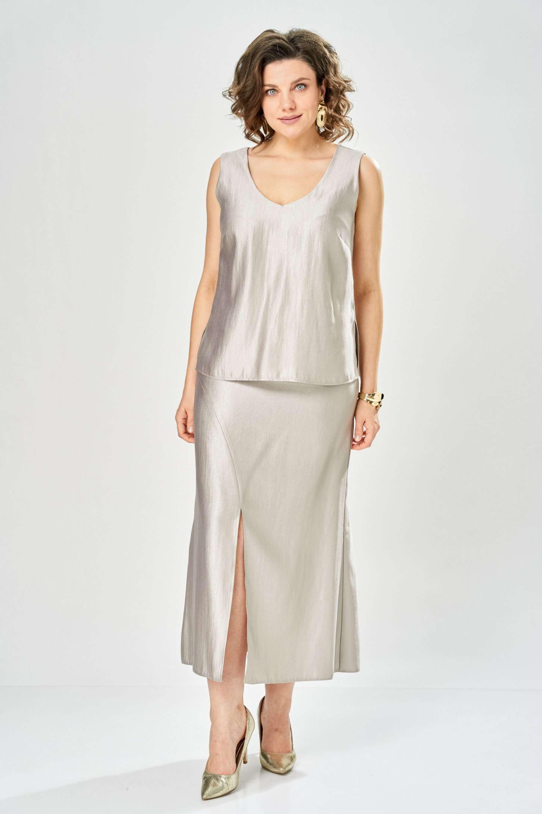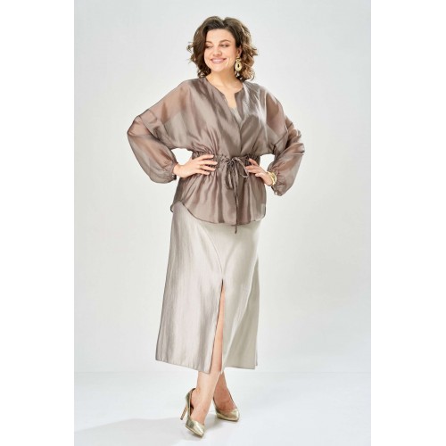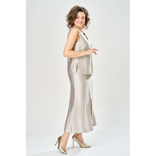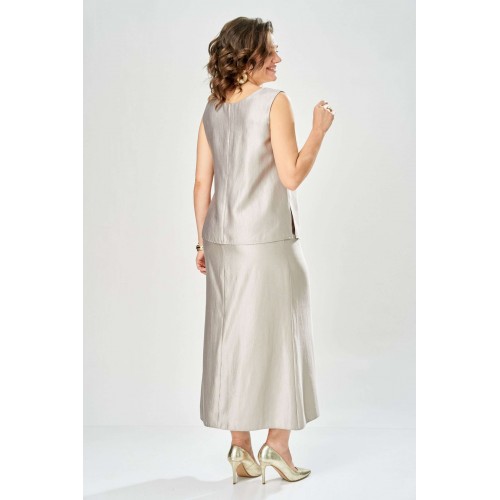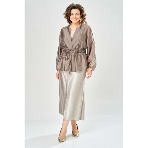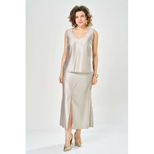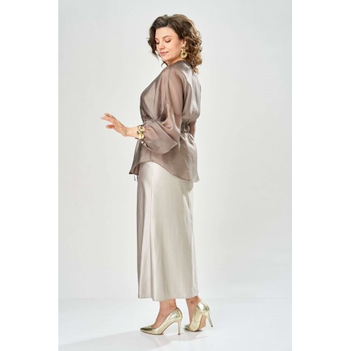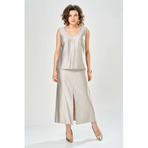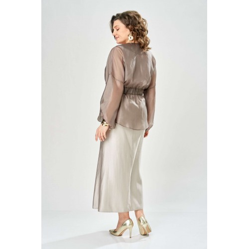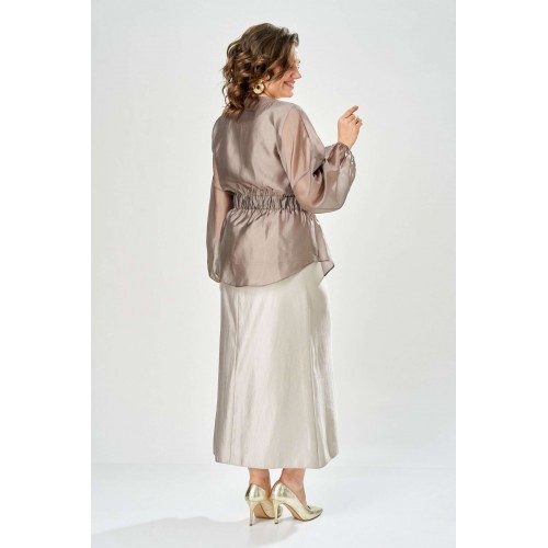 Комплект женский. Элегантный женский комплект состоит из трёх предметов, топа, блузы и юбки. Выполнен из двух видов ткани. Топ прилегающего силуэта из плательной ткани с небольшим блеском. Топ на широких бретелях. Горловина и пройма обработаны обтачкой. Юбка расширенная к низу, по переду фигурный рельеф с разрезом по низу, застежка в среднем шве спинки на тесьму молния. Юбка на подкладке. Блузон выполнен из полупрозрачной легкой ткани, свободного силуэта, без застежки, горловина круглая, линия плеча спущенная, рукава широкие со сборкой по низу. Блуза по линии талии собрана на резинку по центру переда фиксируется на завязки. Длина блузы – 74 см Длина рукава блузы – 38,5 см Ширина плеча блузы – 33,5 см Длина юбки – 93 см Длина топа по среднему шву – 57 см Ширина бретели – 7 см