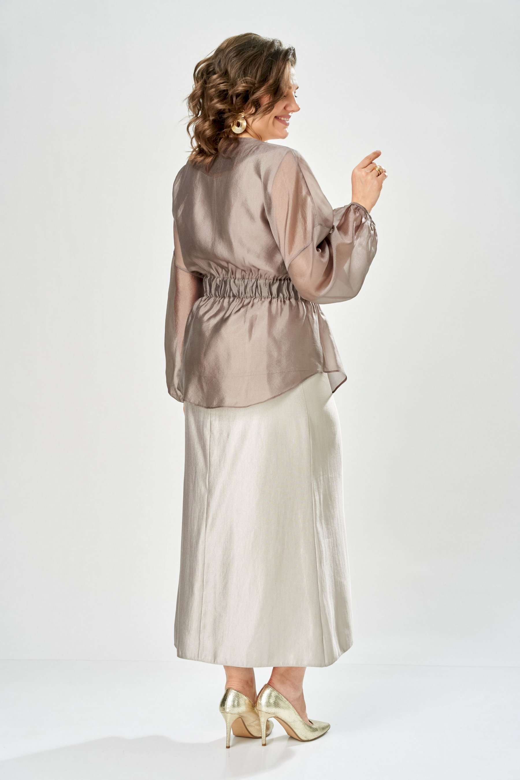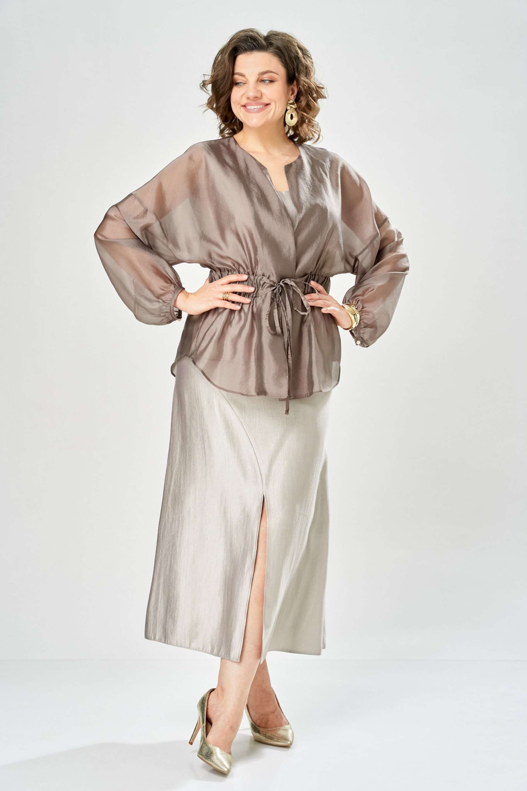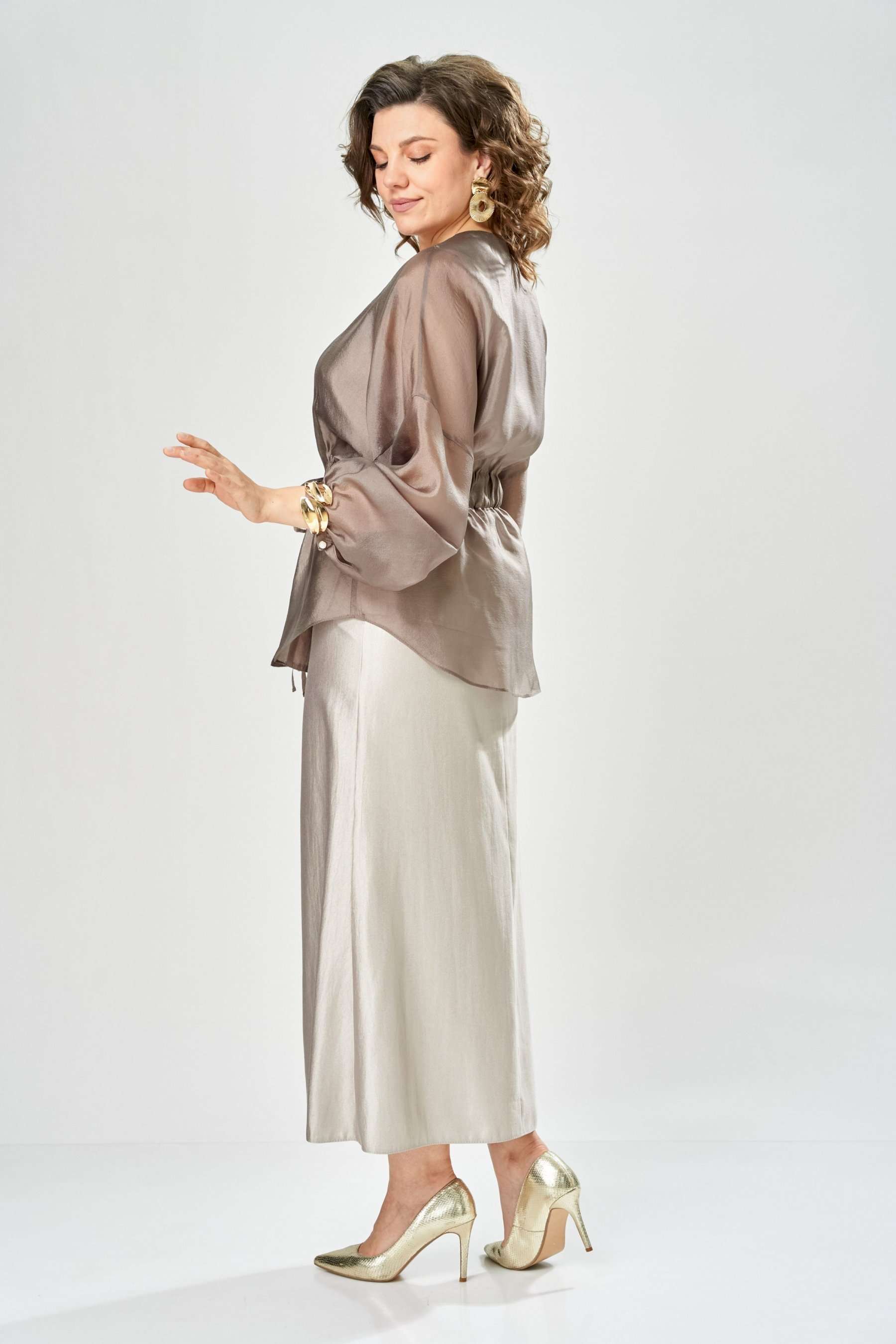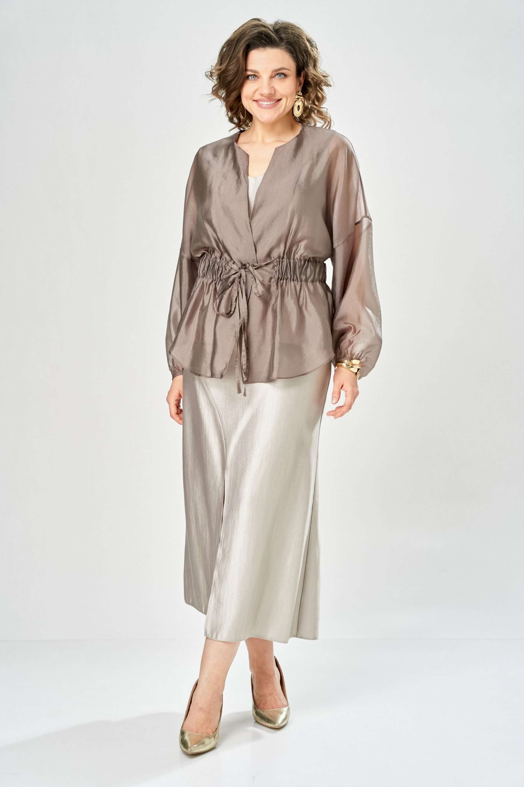 Комплект женский. Элегантный женский комплект состоит из трёх предметов, топа, блузы и юбки. Выполнен из двух видов ткани. Топ прилегающего силуэта из плательной ткани с небольшим блеском. Топ на широких бретелях. Горловина и пройма обработаны обтачкой. Юбка расширенная к низу, по переду фигурный рельеф с разрезом по низу, застежка в среднем шве спинки на тесьму молния. Юбка на подкладке. Блузон выполнен из полупрозрачной легкой ткани, свободного силуэта, без застежки, горловина круглая, линия плеча спущенная, рукава широкие со сборкой по низу. Блуза по линии талии собрана на резинку по центру переда фиксируется на завязки. Длина блузы – 74 см Длина рукава блузы – 38,5 см Ширина плеча блузы – 33,5 см Длина юбки – 93 см Длина топа по среднему шву – 57 см Ширина бретели – 7 см