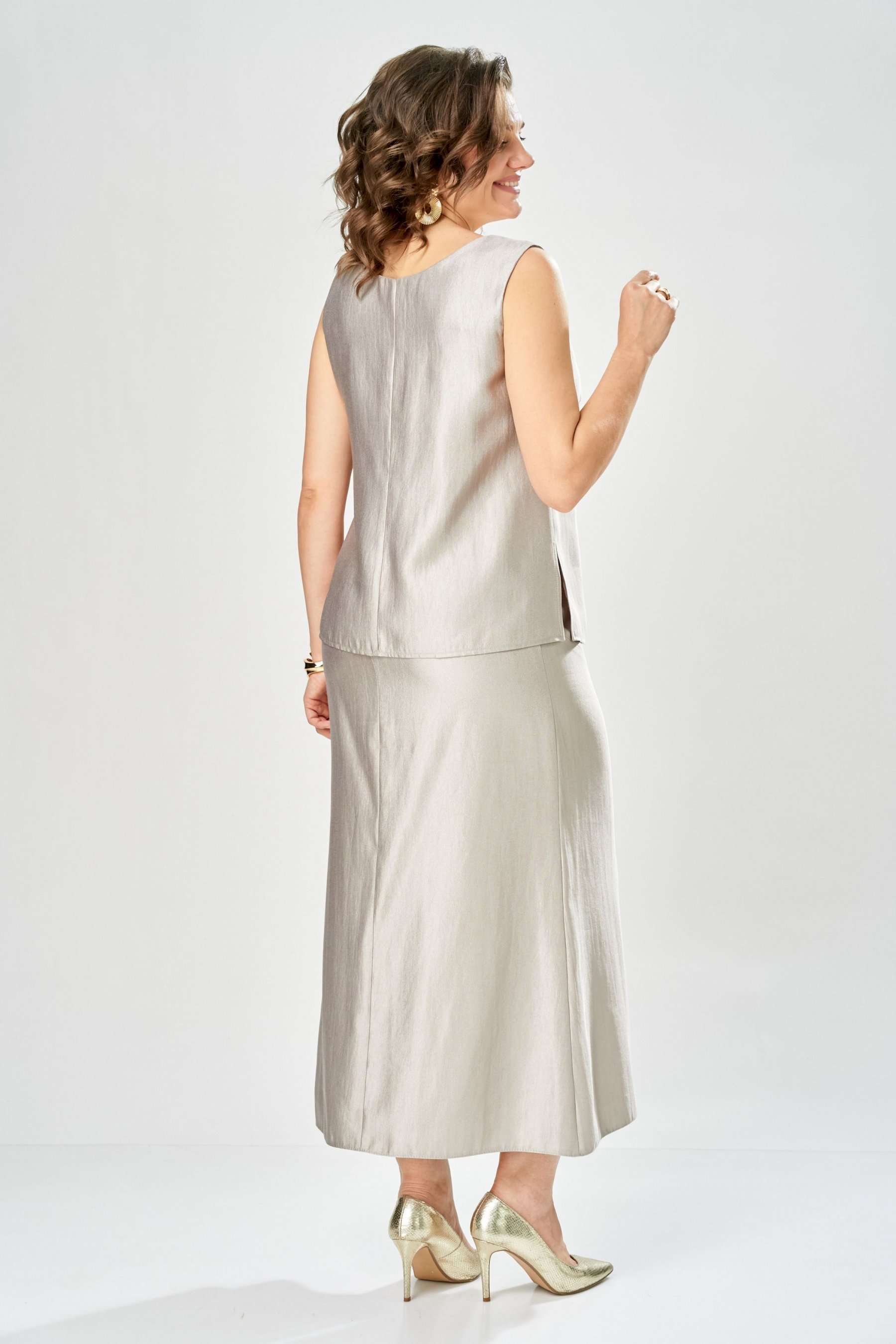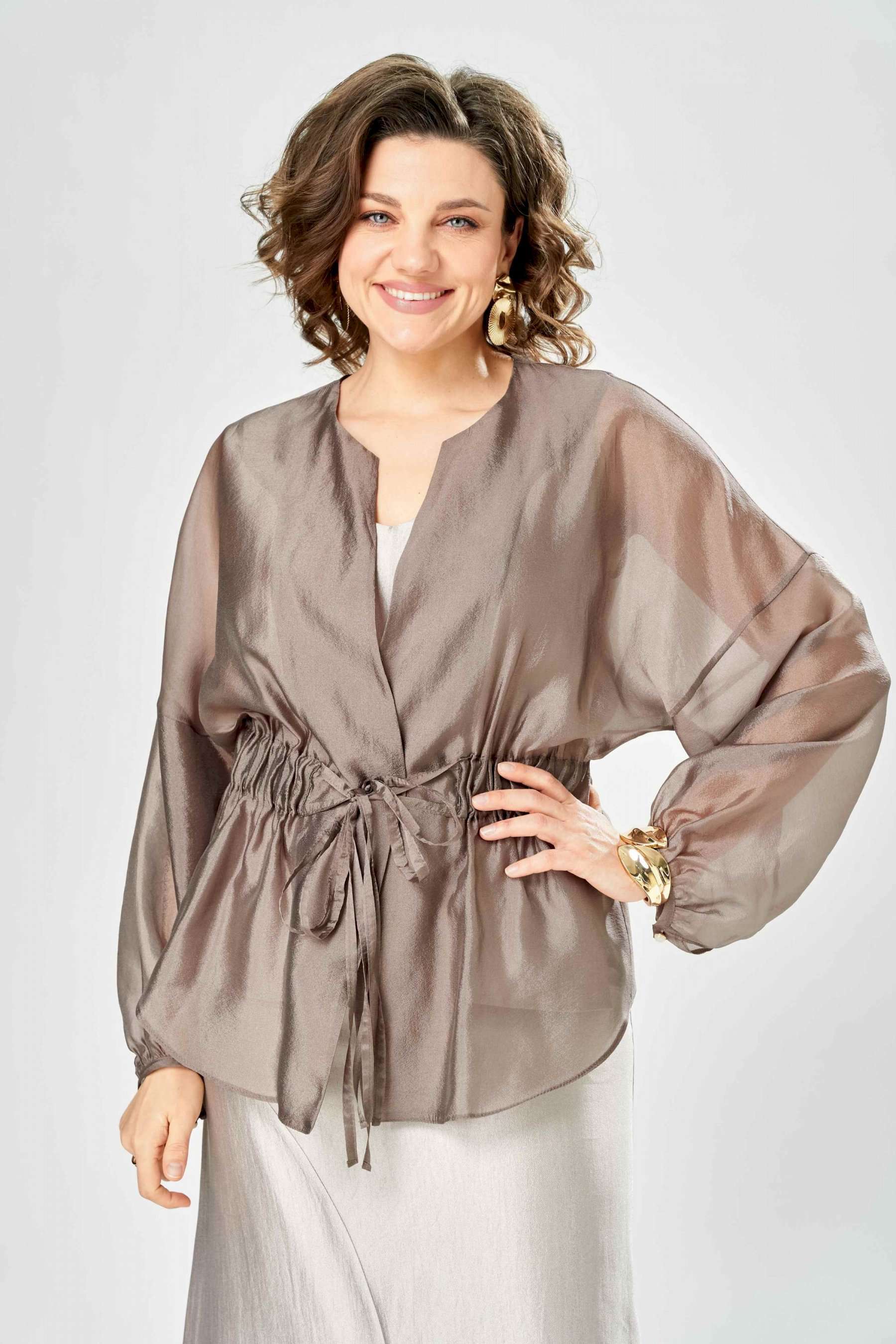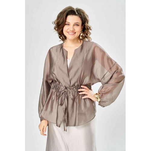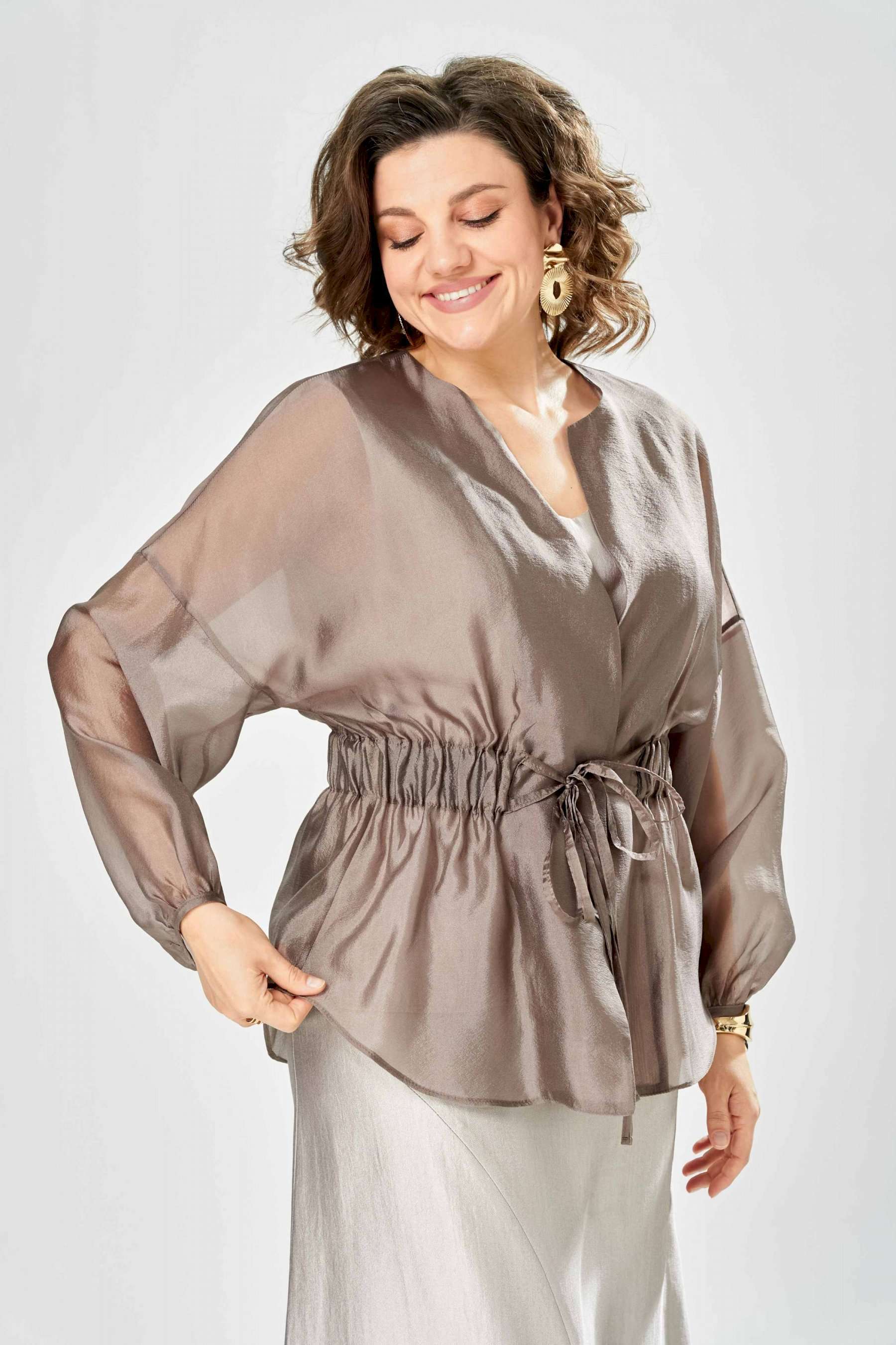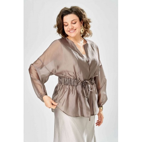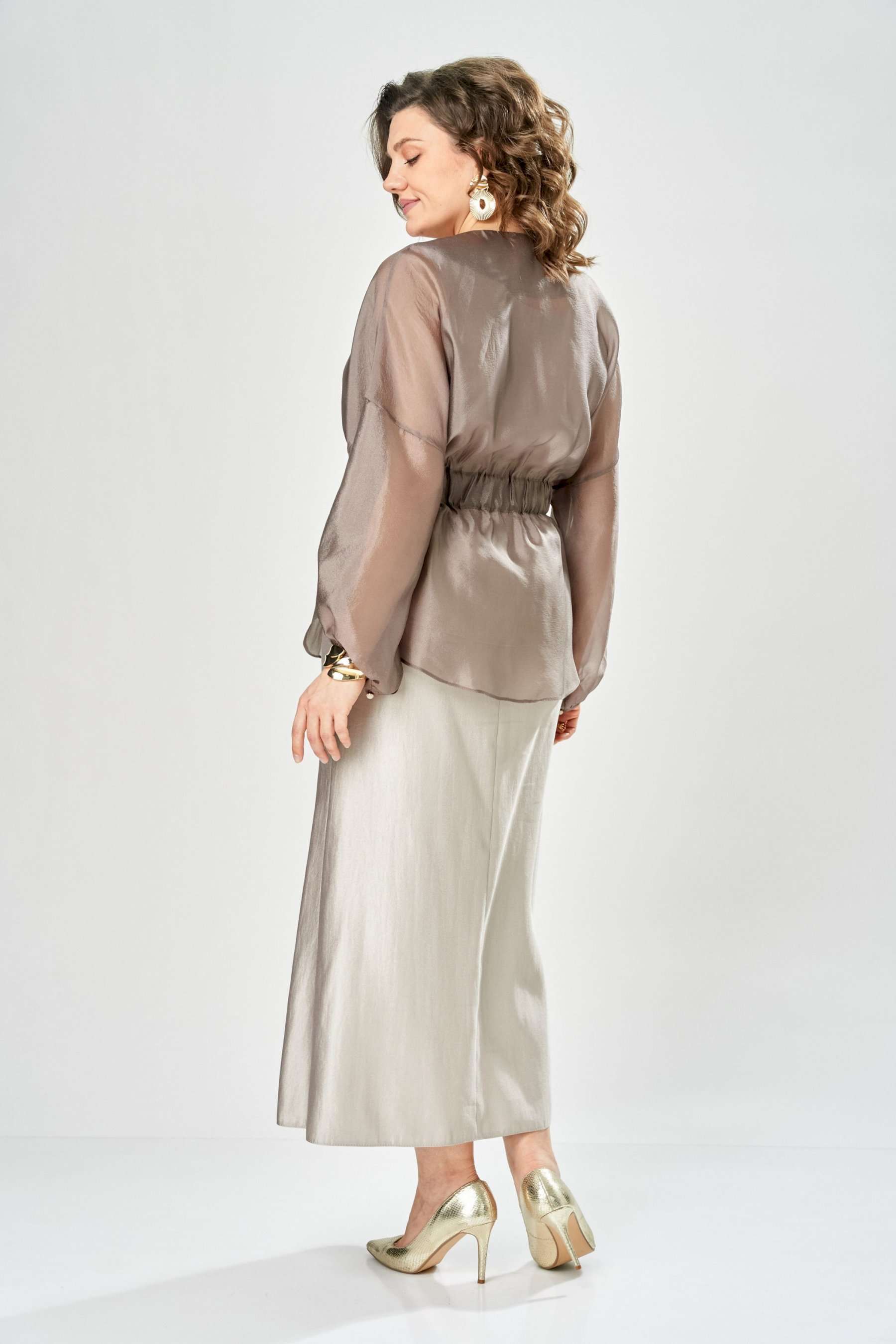 Комплект женский. Элегантный женский комплект состоит из трёх предметов, топа, блузы и юбки. Выполнен из двух видов ткани. Топ прилегающего силуэта из плательной ткани с небольшим блеском. Топ на широких бретелях. Горловина и пройма обработаны обтачкой. Юбка расширенная к низу, по переду фигурный рельеф с разрезом по низу, застежка в среднем шве спинки на тесьму молния. Юбка на подкладке. Блузон выполнен из полупрозрачной легкой ткани, свободного силуэта, без застежки, горловина круглая, линия плеча спущенная, рукава широкие со сборкой по низу. Блуза по линии талии собрана на резинку по центру переда фиксируется на завязки. Длина блузы – 74 см Длина рукава блузы – 38,5 см Ширина плеча блузы – 33,5 см Длина юбки – 93 см Длина топа по среднему шву – 57 см Ширина бретели – 7 см