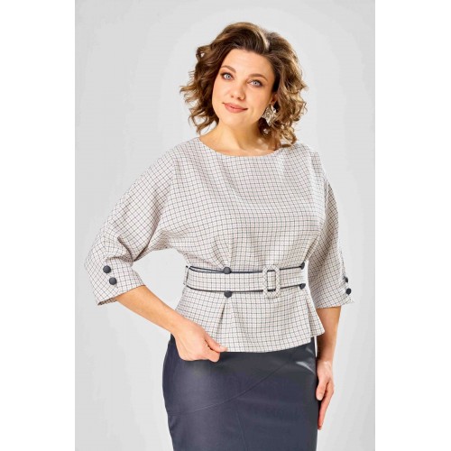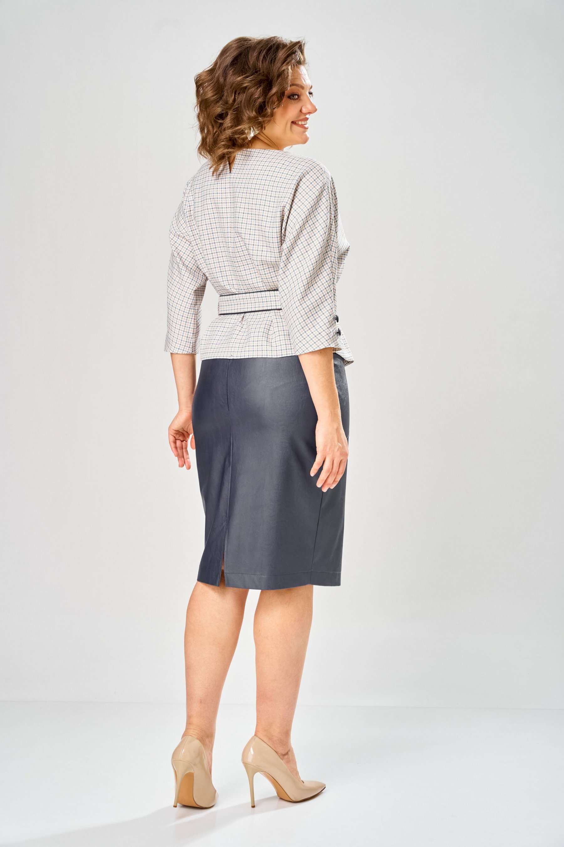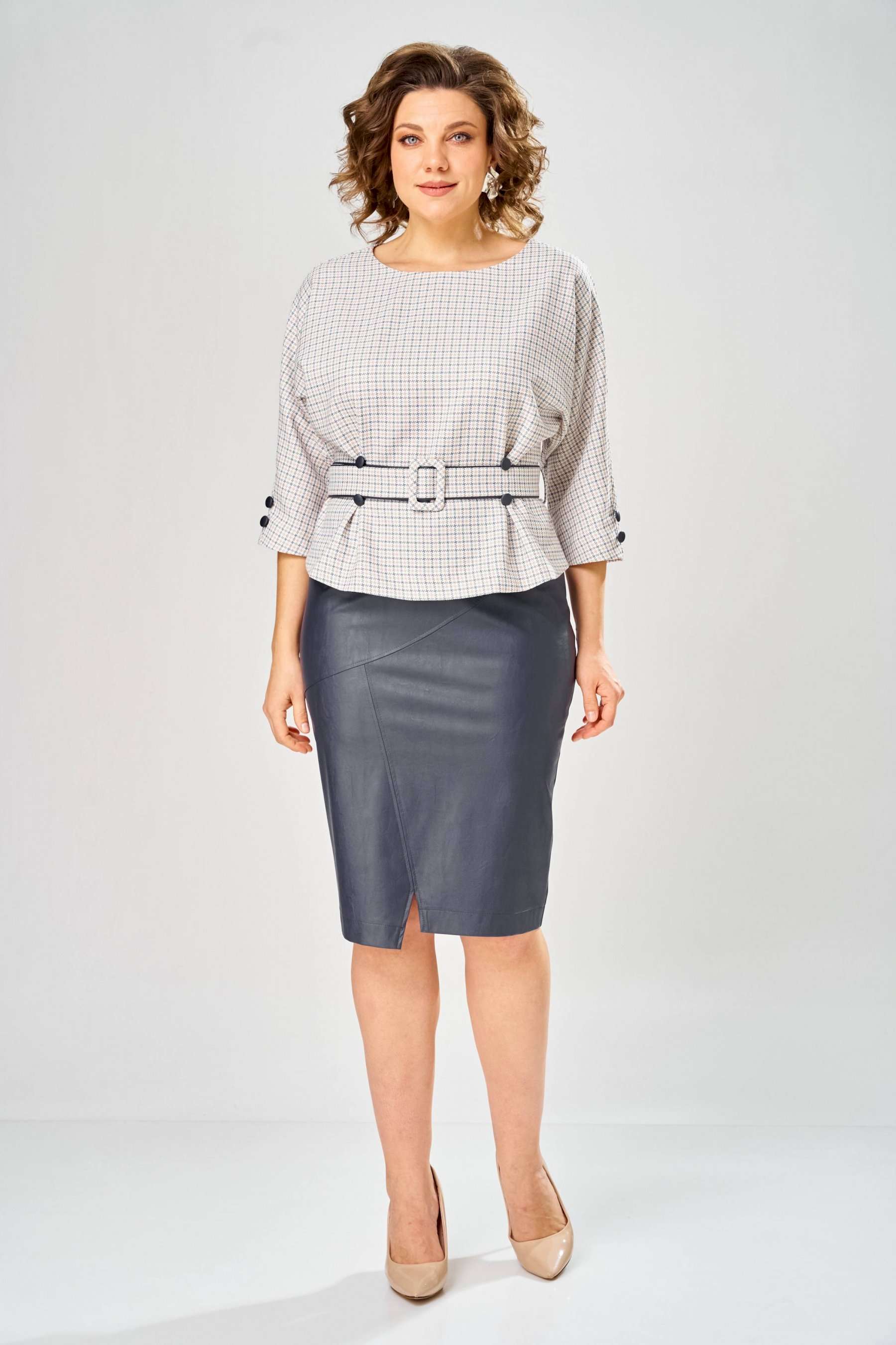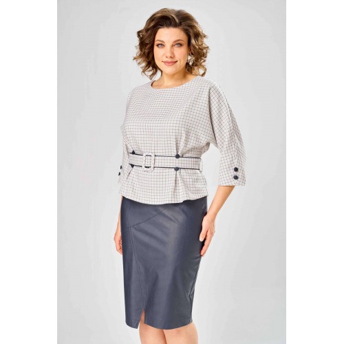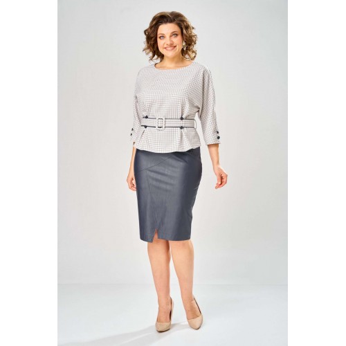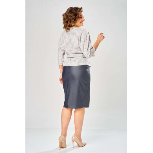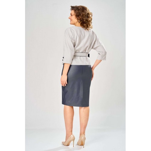 Стильный женский костюм состоит из блузы из плательной ткани и юбки из кожи. Блуза с цельнокроеные рукавом и круглой формой горловины. По переду на уровне талии обработаны складки-защипы. Спинка со средним швом с разрезом у горловины. По низу рукава расположены по две отделочные пуговицы из кожи. К блузе прилагается ремень, выполненный из сочетания кожи и плательной ткани. Юбка зауженная к низу на подкладке. Перед юбки с фигурными подрезами и отделочными строчками по ним. По спинке средний шов с застёжкой на тесьму-молния и разрезом по низу. Верх юбки оформлен отрезным поясом с резинкой. Длина блузы - 60 см Длина рукава – 53 см Длина юбки – 62 см