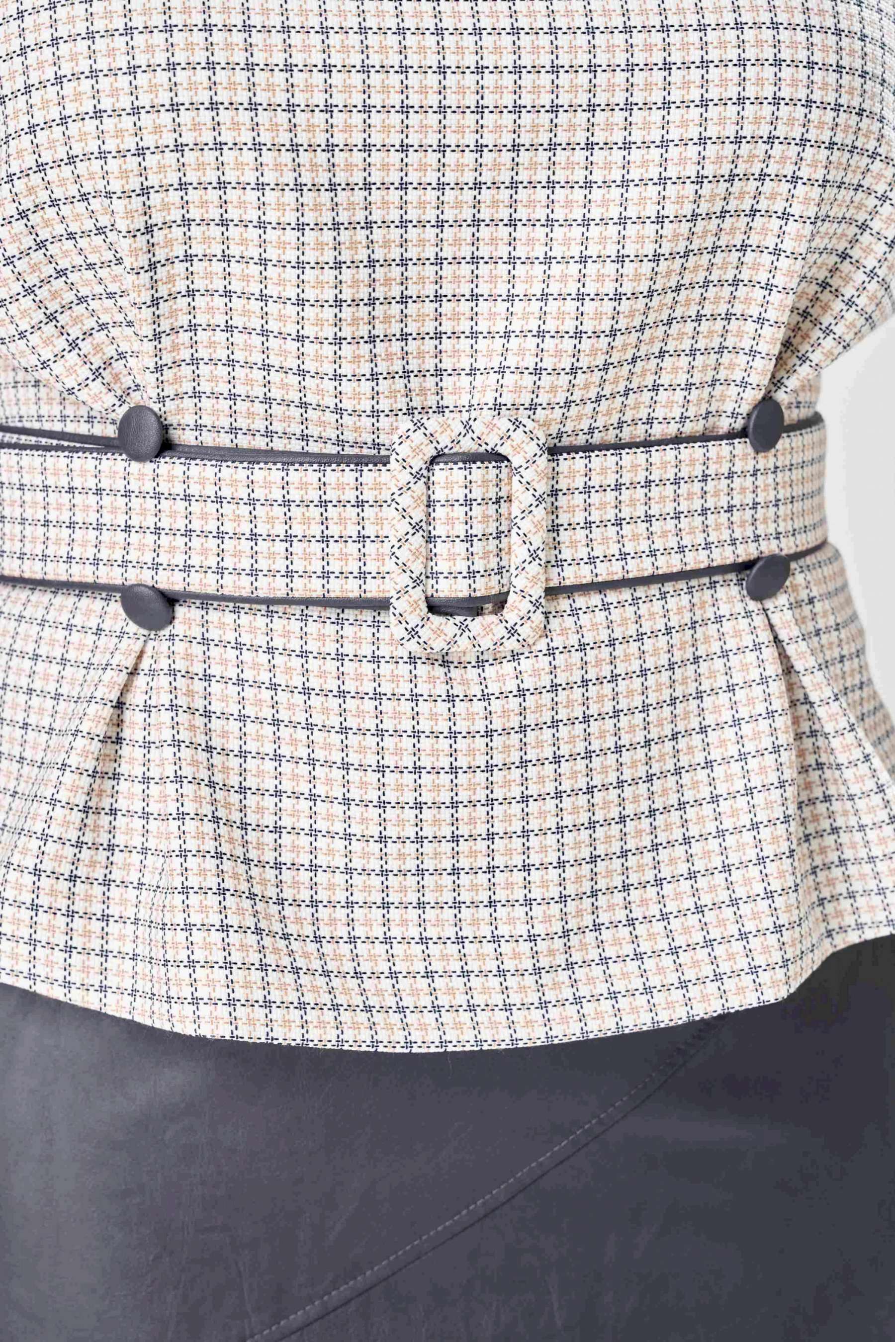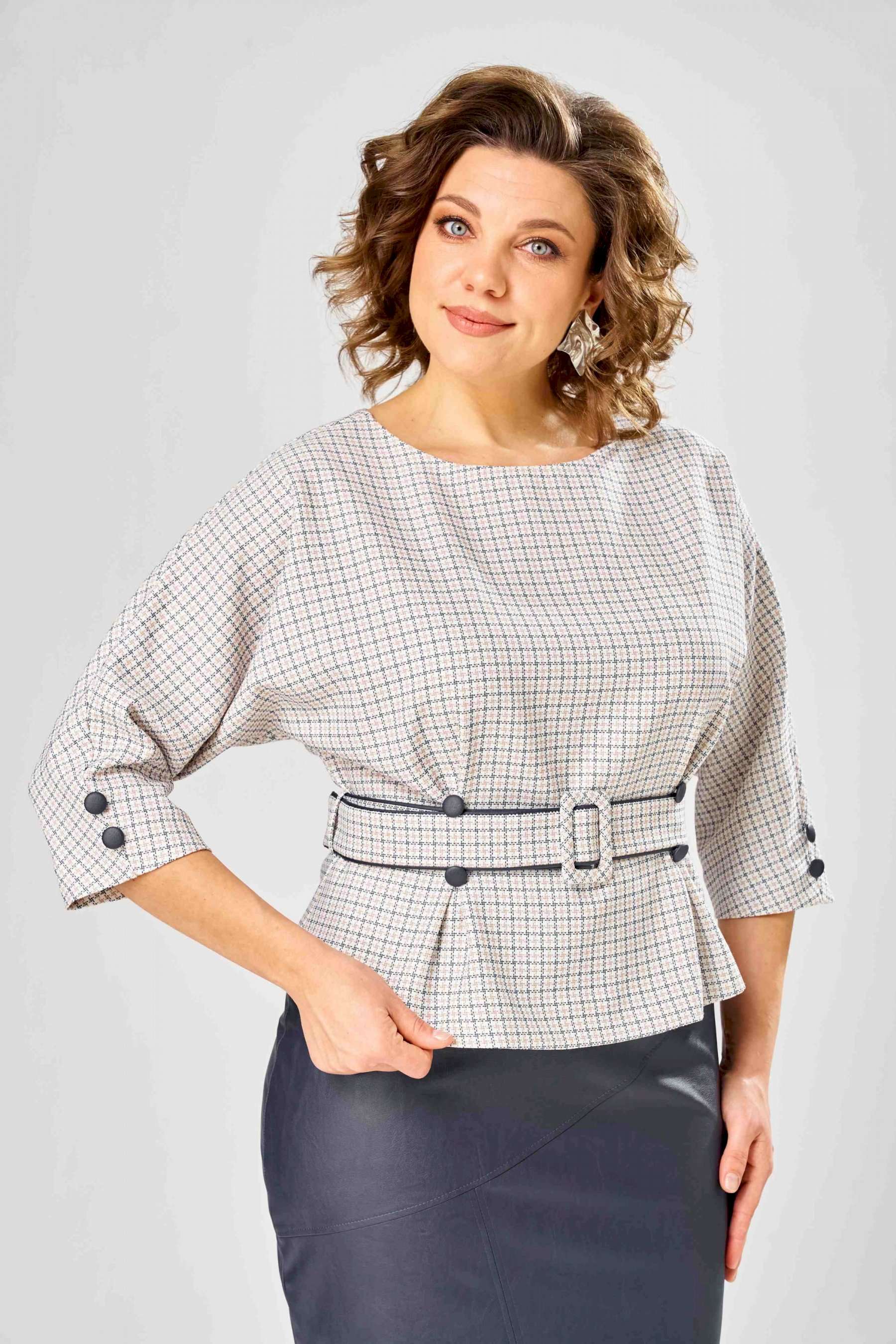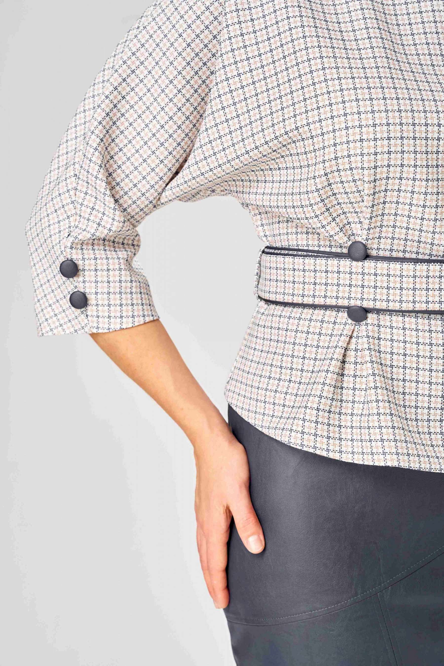 Стильный женский костюм состоит из блузы из плательной ткани и юбки из кожи. Блуза с цельнокроеные рукавом и круглой формой горловины. По переду на уровне талии обработаны складки-защипы. Спинка со средним швом с разрезом у горловины. По низу рукава расположены по две отделочные пуговицы из кожи. К блузе прилагается ремень, выполненный из сочетания кожи и плательной ткани. Юбка зауженная к низу на подкладке. Перед юбки с фигурными подрезами и отделочными строчками по ним. По спинке средний шов с застёжкой на тесьму-молния и разрезом по низу. Верх юбки оформлен отрезным поясом с резинкой. Длина блузы - 60 см Длина рукава – 53 см Длина юбки – 62 см