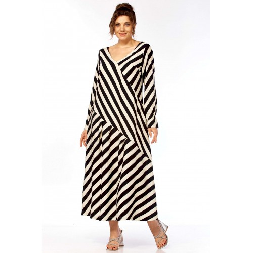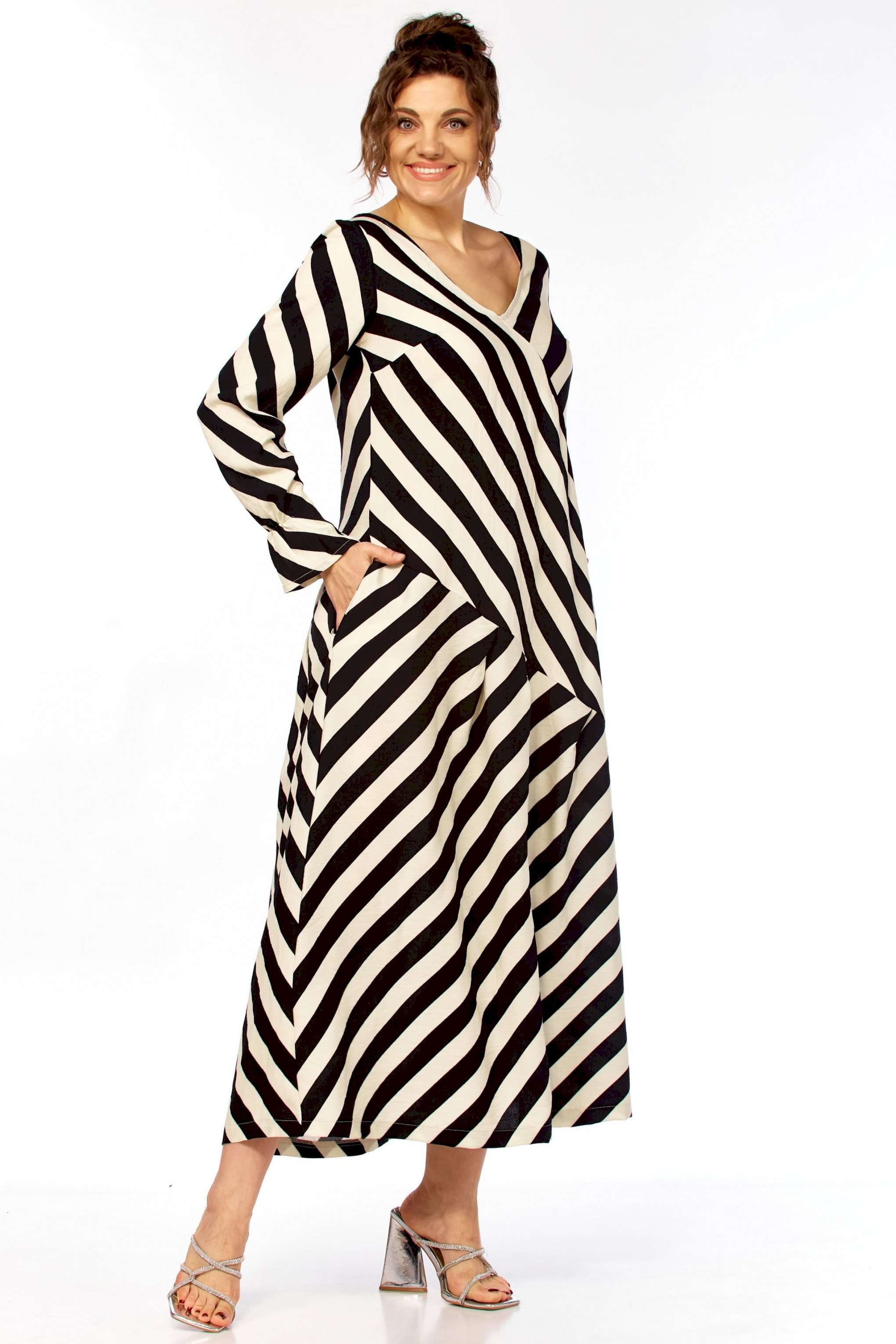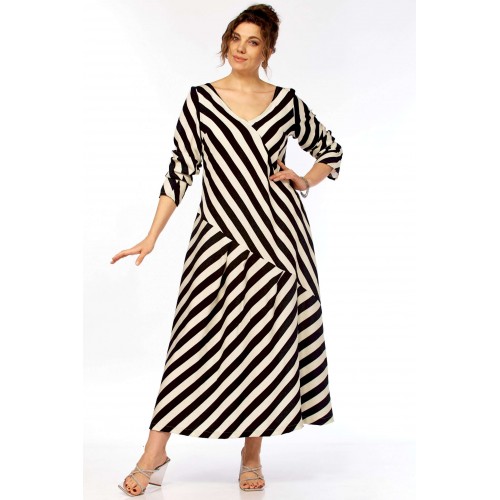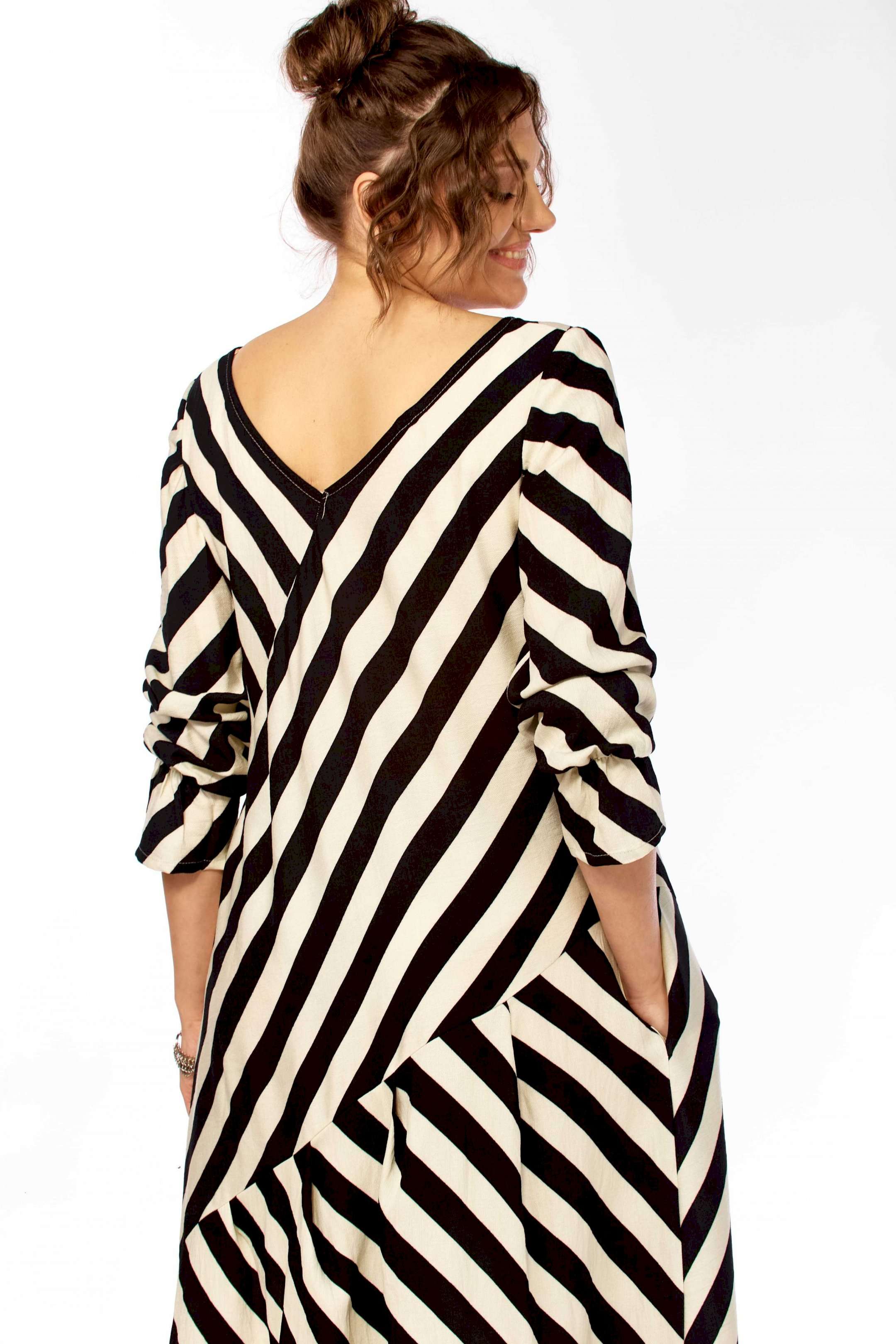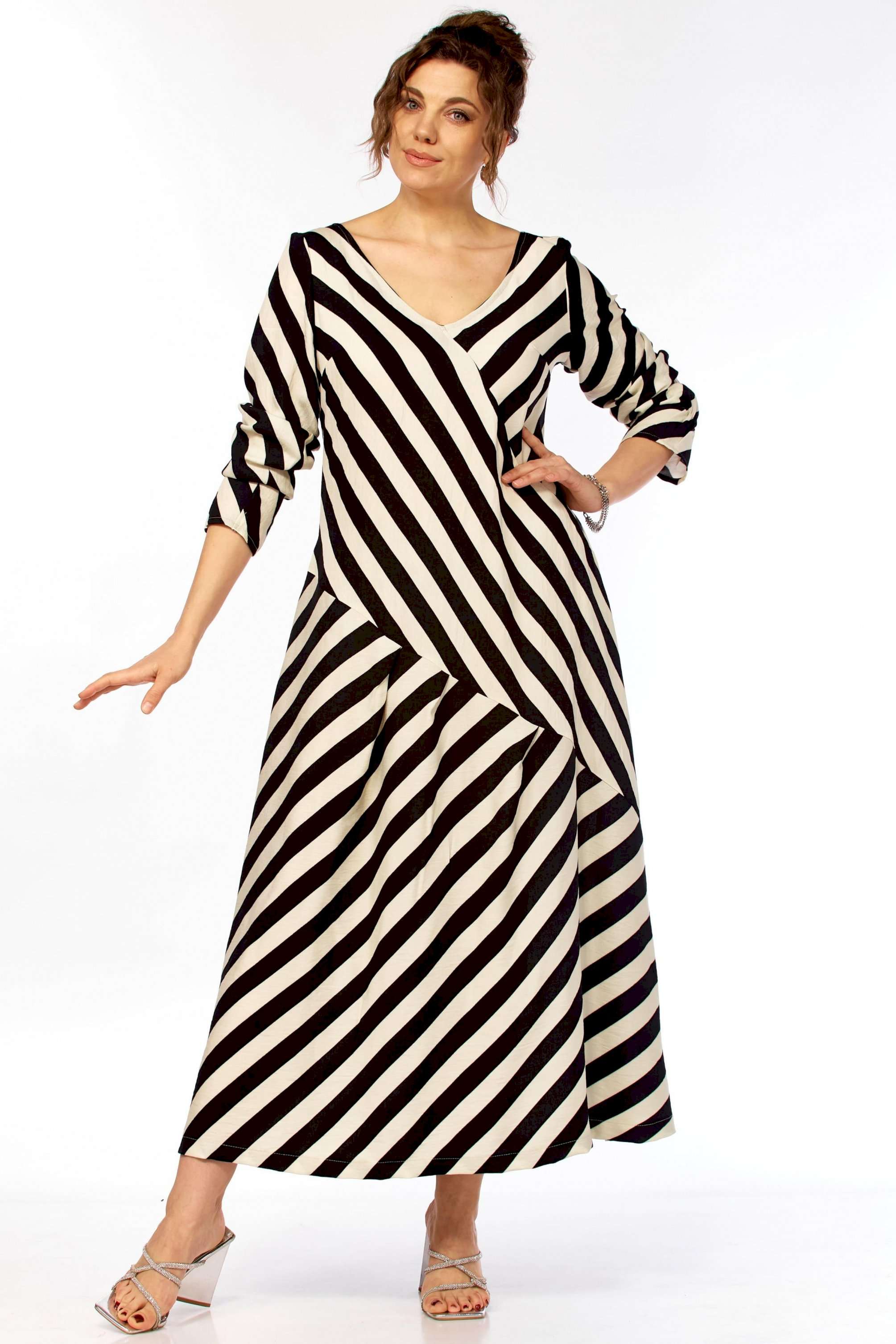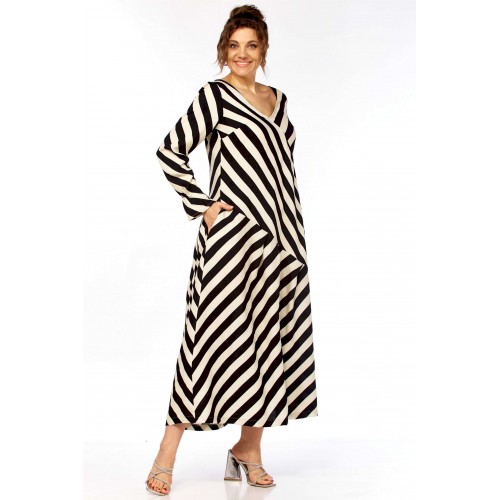 Ищете платье, которое само «строит» фигуру? Представляем безупречное воплощение элегантности и динамики. Это не просто платье в полоску — это платье продумано до мелочей для создания образа уверенной, стильной и современной женщины. Уникальный крой с чередованием направлений полоски создает мощный визуальный эффект. Диагональные линии мгновенно «вытягивают» силуэт, скрывают нюансы в области талии и бедер, делая фигуру более стройной и грациозной. V-образный вырез благородное декольте и такой же глубокий вырез на спинке открывают линию шеи и ключиц, добавляя образу хрупкости и женственности, при этом оставаясь в рамках делового этикета. Свободный А-силуэт не сковывает движений, а мягкие складки юбки красиво играют при ходьбе. Приятный бонус — незаметные, функциональные карманы в боковых швах. Рукав длинный (62см) с изящной сборкой на манжете позволяет регулировать длину и добавляет образу легкости. Длина платья 130см Сочетание классического черного и молочного — это инвестиция в гардероб, которая никогда не выйдет из моды. С чем носить? • Для офиса: С лаконичными лодочками и минималистичными украшениями. • Для города: С босоножками на устойчивом каблуке (как на фото) или стильными лоферами. • Для отдыха: Добавьте широкополую шляпу и крупные очки — и образ в стиле «круизный шик» готов!