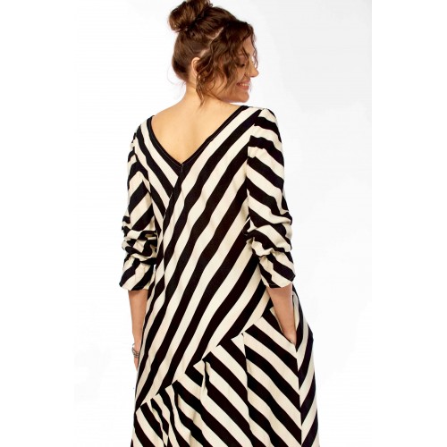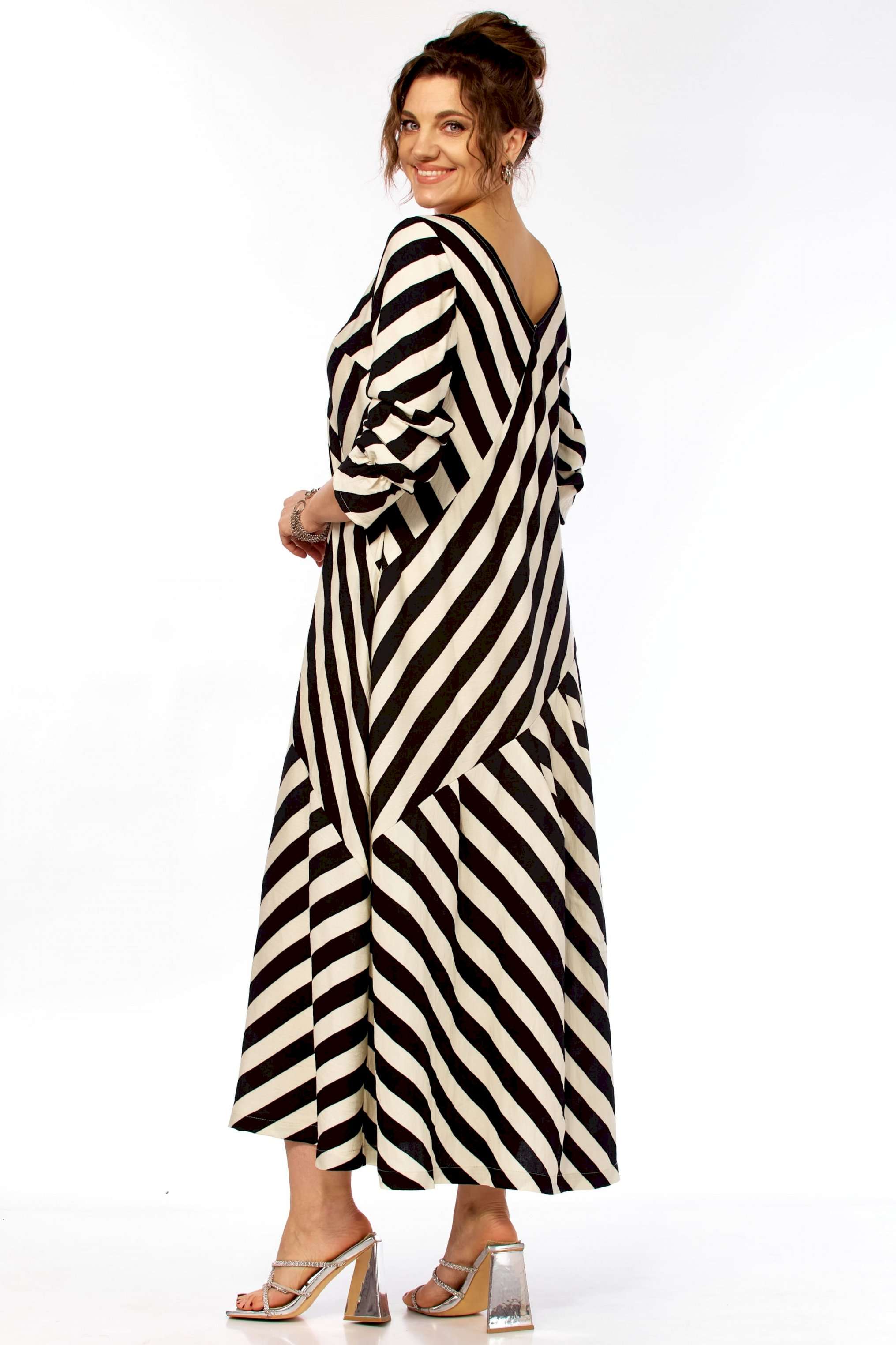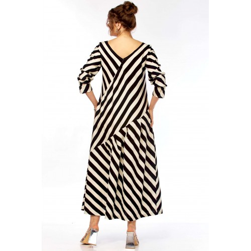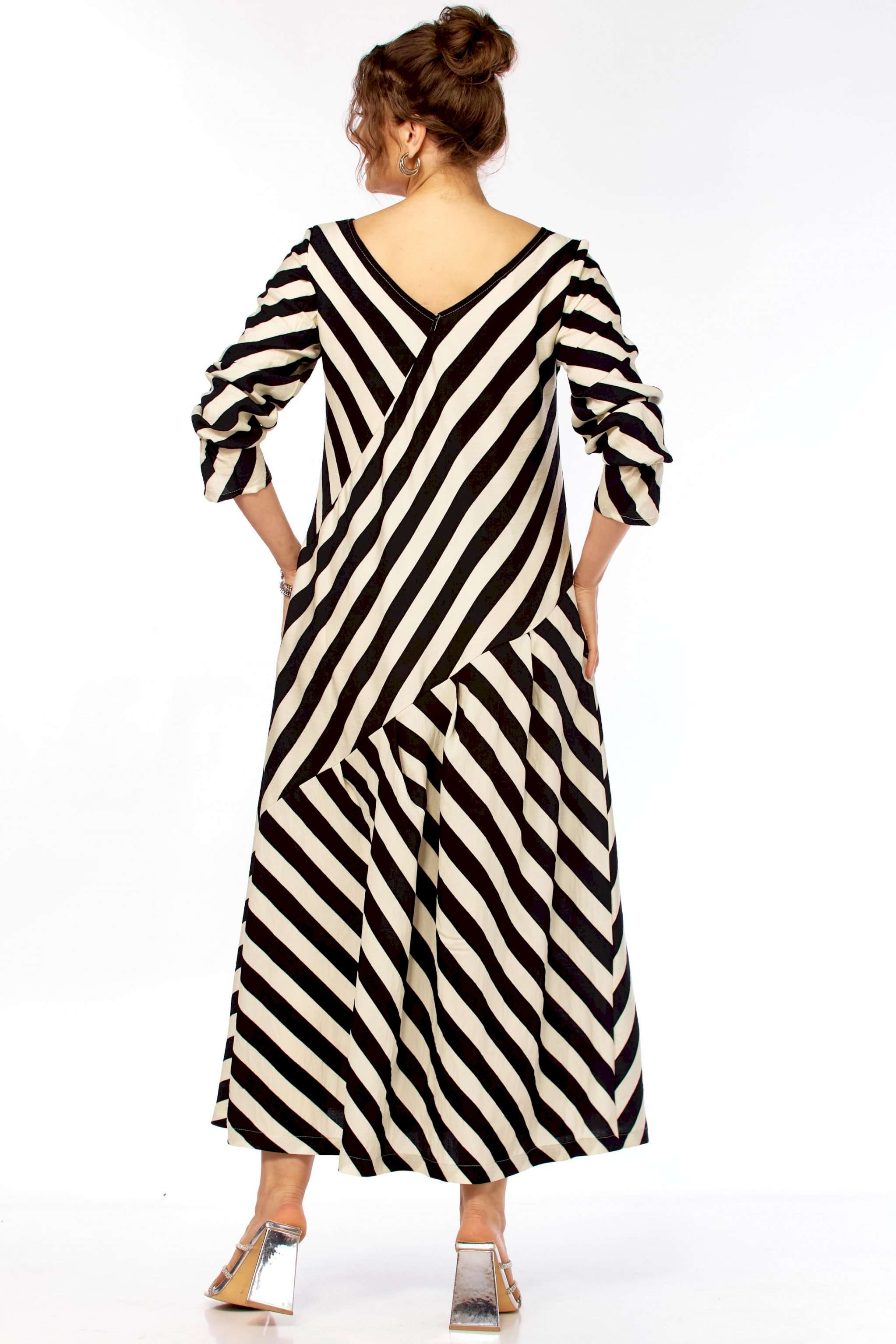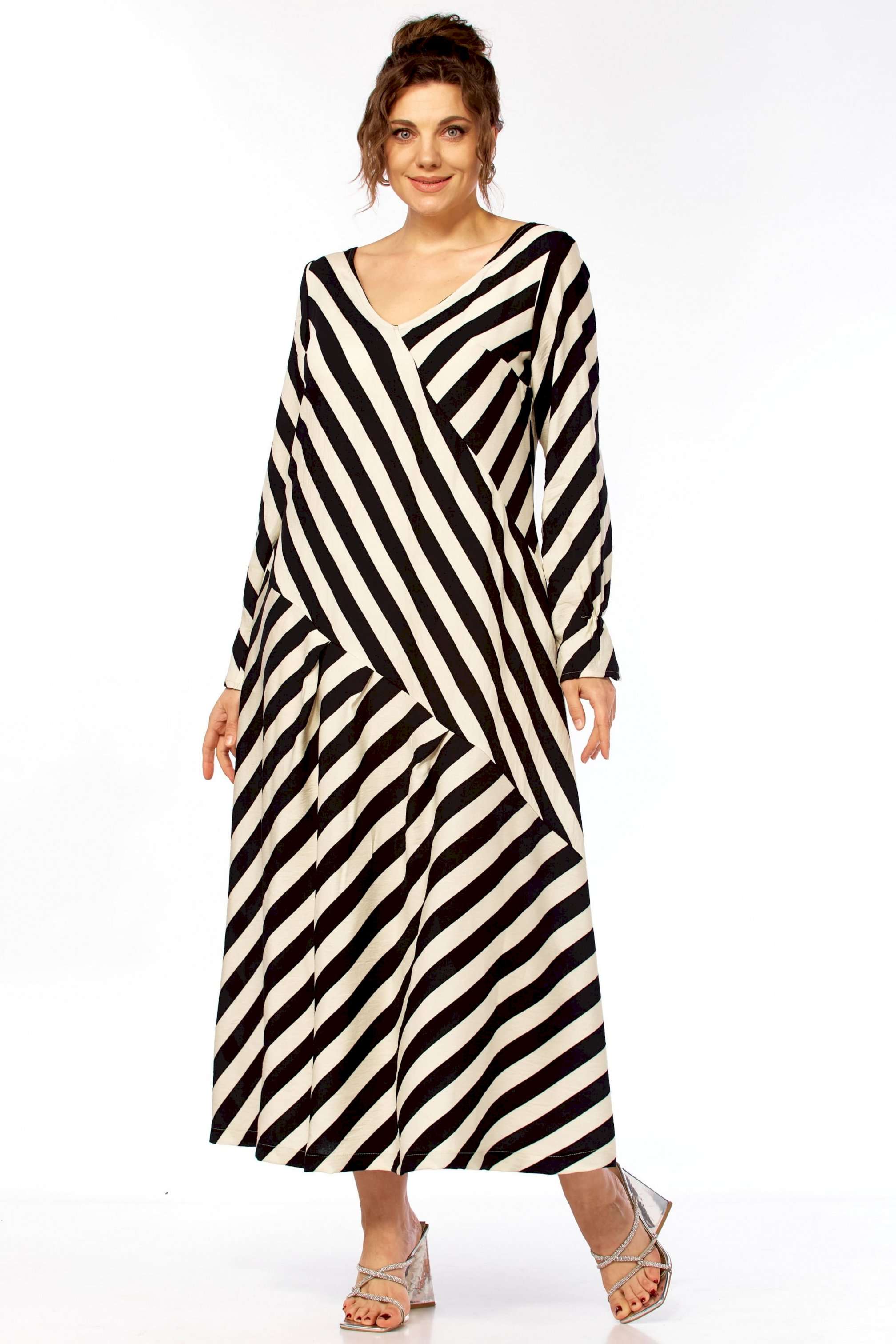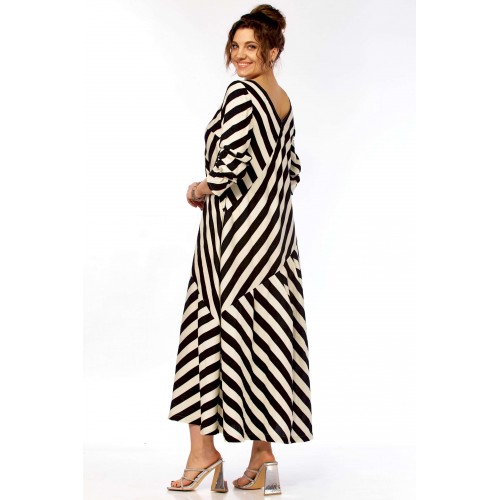 Ищете платье, которое само «строит» фигуру? Представляем безупречное воплощение элегантности и динамики. Это не просто платье в полоску — это платье продумано до мелочей для создания образа уверенной, стильной и современной женщины. Уникальный крой с чередованием направлений полоски создает мощный визуальный эффект. Диагональные линии мгновенно «вытягивают» силуэт, скрывают нюансы в области талии и бедер, делая фигуру более стройной и грациозной. V-образный вырез благородное декольте и такой же глубокий вырез на спинке открывают линию шеи и ключиц, добавляя образу хрупкости и женственности, при этом оставаясь в рамках делового этикета. Свободный А-силуэт не сковывает движений, а мягкие складки юбки красиво играют при ходьбе. Приятный бонус — незаметные, функциональные карманы в боковых швах. Рукав длинный (62см) с изящной сборкой на манжете позволяет регулировать длину и добавляет образу легкости. Длина платья 130см Сочетание классического черного и молочного — это инвестиция в гардероб, которая никогда не выйдет из моды. С чем носить? • Для офиса: С лаконичными лодочками и минималистичными украшениями. • Для города: С босоножками на устойчивом каблуке (как на фото) или стильными лоферами. • Для отдыха: Добавьте широкополую шляпу и крупные очки — и образ в стиле «круизный шик» готов!