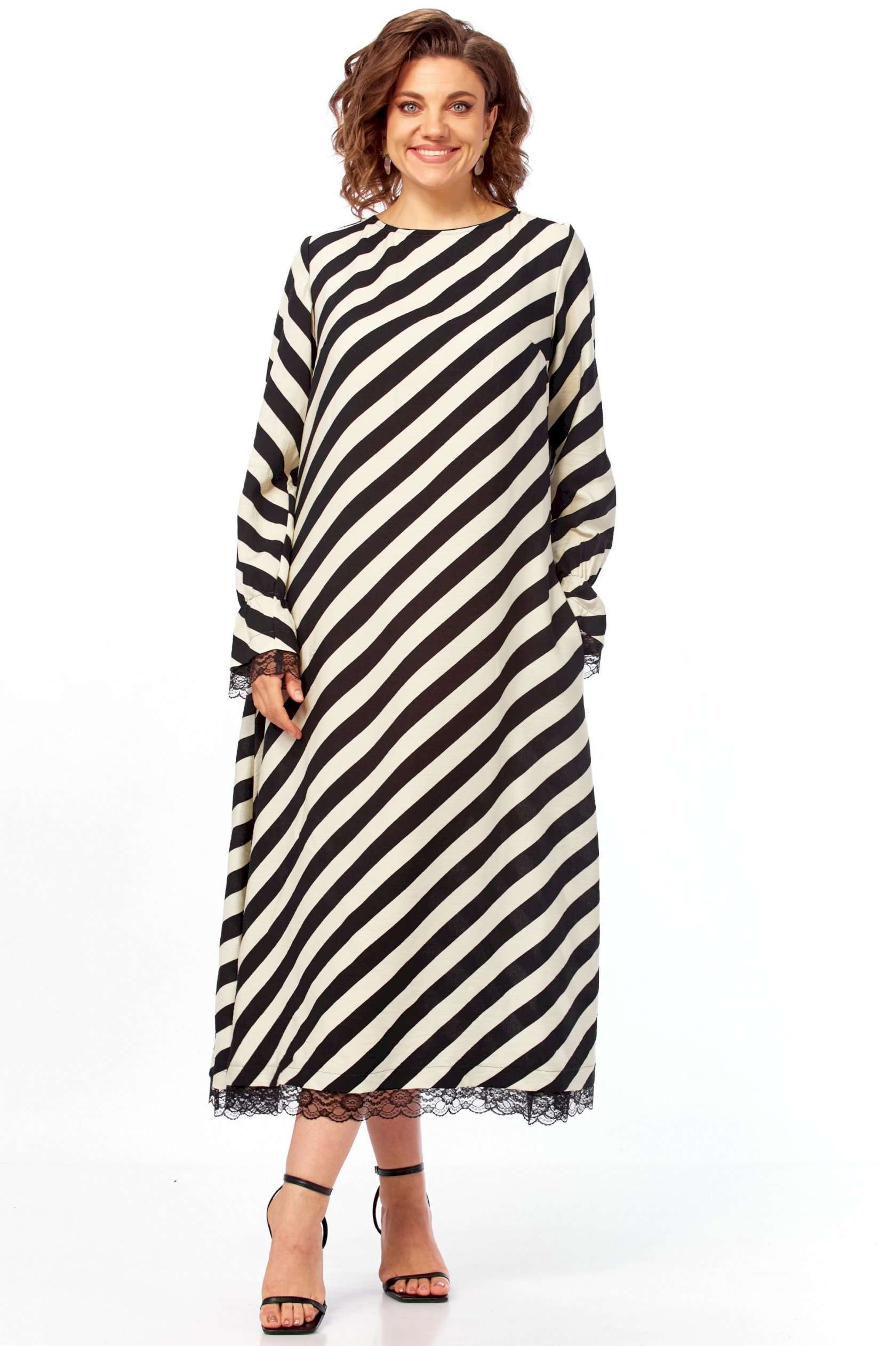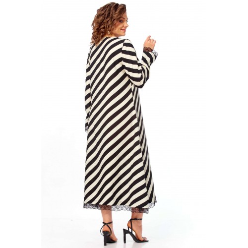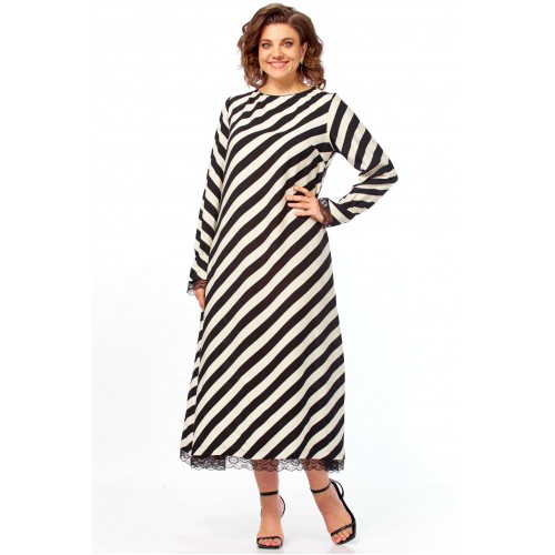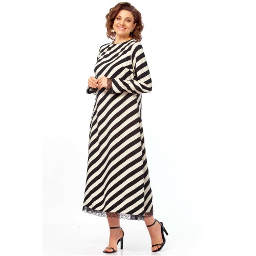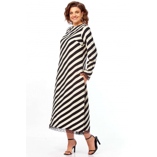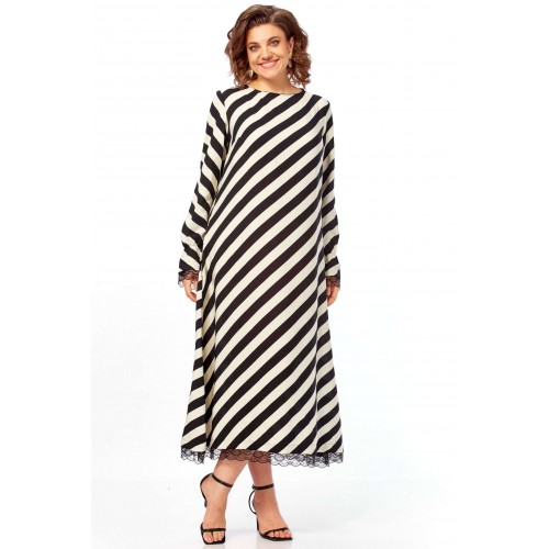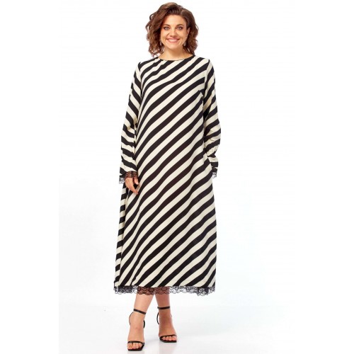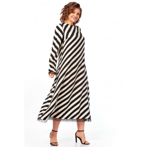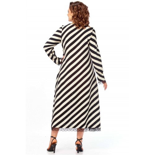 Модель представлена в свободном А-силуэте (трапеция), который обеспечивает комфортную посадку и свободу движений. Главным визуальным акцентом является контрастный принт в виде широких диагональных полос. Такое направление рисунка обладает выраженным оптическим эффектом: оно визуально вытягивает силуэт, придает динамику образу и делает фигуру стройнее. Низ подола и манжеты рукавов декорированы широким черным кружевом, этот элемент добавляет модели нарядности и смягчает строгость геометрического принта. • Горловина: Классический круглый вырез, лаконично оформленный, что подчеркивает линию шеи. • Рукава: Втачные, полной длины (62см без учета кружева). Свободный крой рукава заканчивается изящным кружевным акцентом на запястьях. • Карманы: В боковых швах предусмотрены функциональные потайные карманы, которые не нарушают общую линию кроя. • Длина: Актуальная длина миди (125см без учета кружева), которая гармонично сочетается с классической обувью на каблуке.