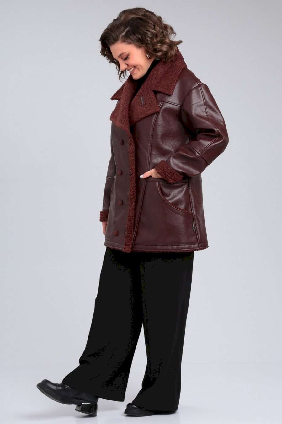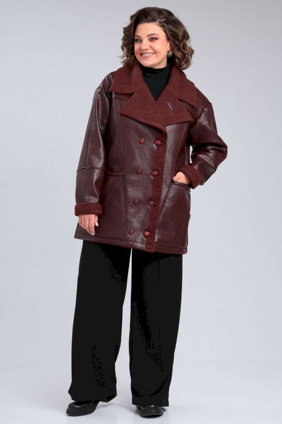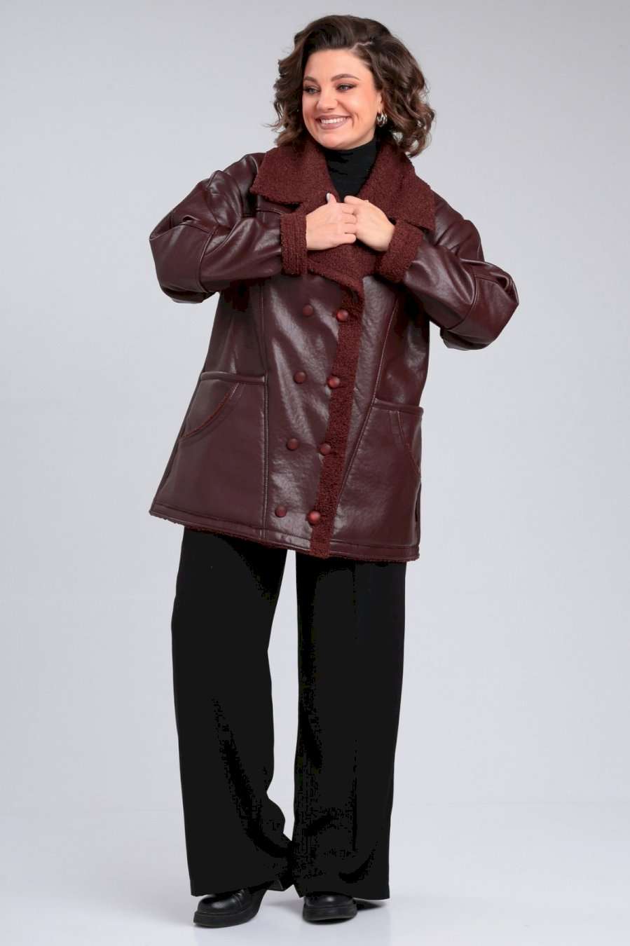Дубленка женская короткая от Celentano. Выполнена из экокожи высокого качества с меховой изнанкой. Воротник втачной с лацканом. Застежка двубортная на петли и пуговицы. Полочка с кокеткой, на полочке расположены по два функциональных кармана справа и слева. Спинка разрезная с кокеткой. Рукав одношовный втачной с подрезами, плечо спущено. В модели есть прибавка на верхнюю одежду. Длинна изделия по спинке 78-80 см в зависимости от размера, длина рукава 82 см от горловины во всех размерах (плечо спущено). Изделие выполнено из высококачественной мягкой экокожи, которая не трескается и не растягивается, в отличие от натуральной кожи. Фурнитура может отличаться от заявленых на фото. Куртка без подкладки и утеплителя, изнанка - экомех. По температурному режиму подходит для еврозимы (до небольшого минуса), осени и весны (демисезон). Примечание: Перед первой примеркой рекомендуется пройти изнанку (мех) изделия липким роликом для чистки одежды. Рост модели 171 см.