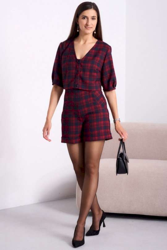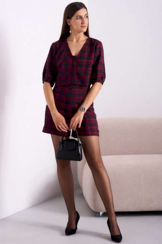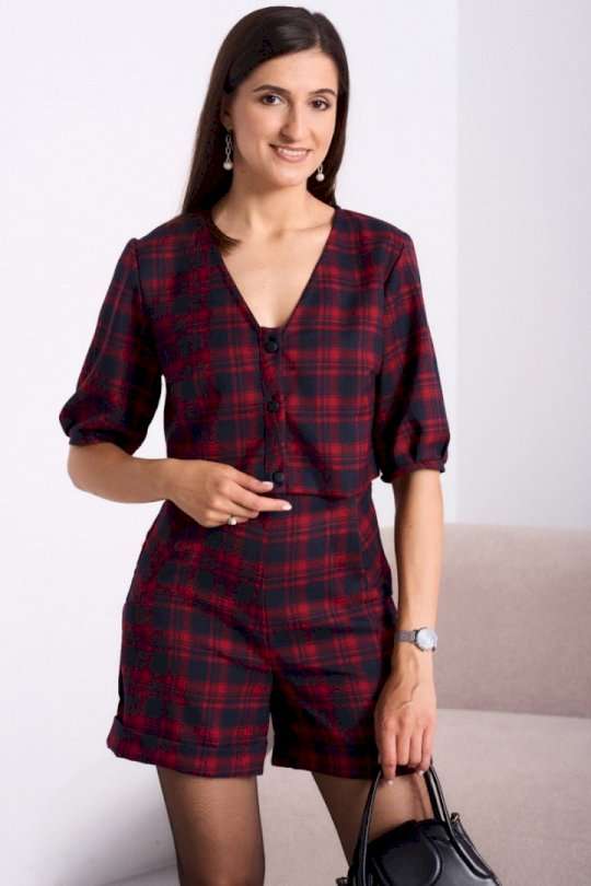 Комплект Celentano M 5054 – это смелый и стильный образ для тех, кто не боится экспериментов. Клетка снова в моде, а этот укороченный комплект сочетает в себе дерзость и элегантность. Состоящий из жакета и шорт, этот комплект выполнен из ткани на основе шерсти и хлопка, что обеспечивает комфорт и тепло в прохладную погоду. Жакет: • Укороченный крой (длина по спинке: 41 см) подчеркивает талию и создает силуэт \"\"песочные часы\"\". • Рукав 3/4 (длина: 33 см) с узкой манжетой придает образу легкости и женственности. • V-образный вырез горловины и функциональная застежка на петли и пуговицы позволяют регулировать глубину декольте. • Нагрудные вытачки обеспечивают идеальную посадку по фигуре. • Спинка цельнокроенная. • Рукав одношовный втачной. Шорты: • Длина по боковому шву: 42 см – идеальная длина, чтобы подчеркнуть стройность ног. • Высокая корсетная талия визуально удлиняет ноги и создает эффект стройности. • Застежка-молния по боковому шву обеспечивает комфортную посадку. • Двойной манжет по низу добавляет образу элегантности и завершенности. • Ткань шерсть и хлопок - для комфорта.