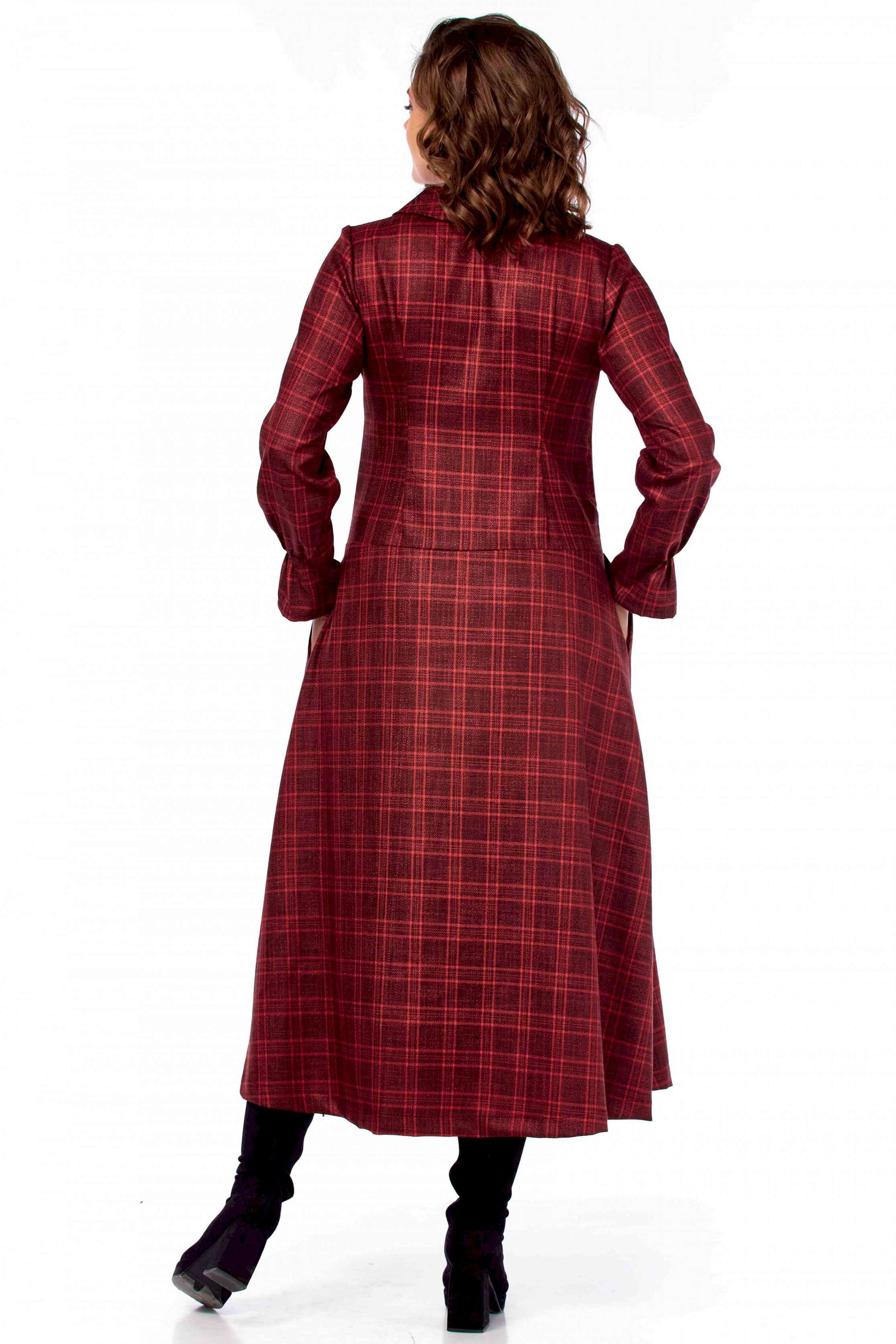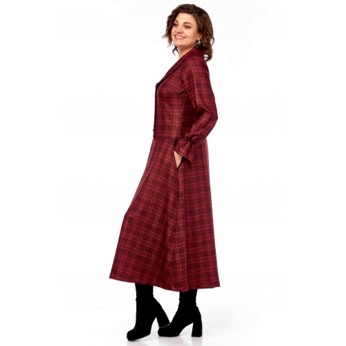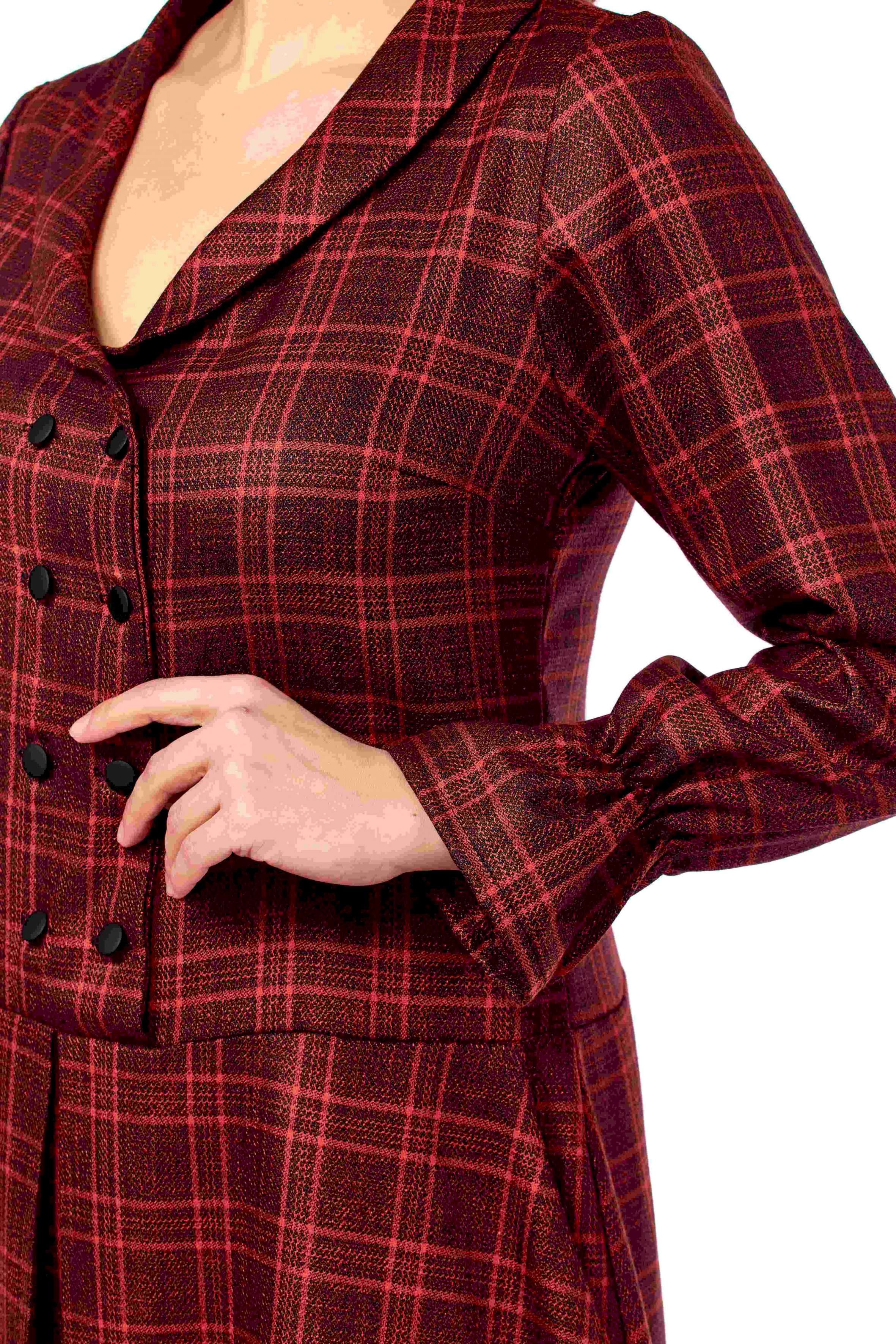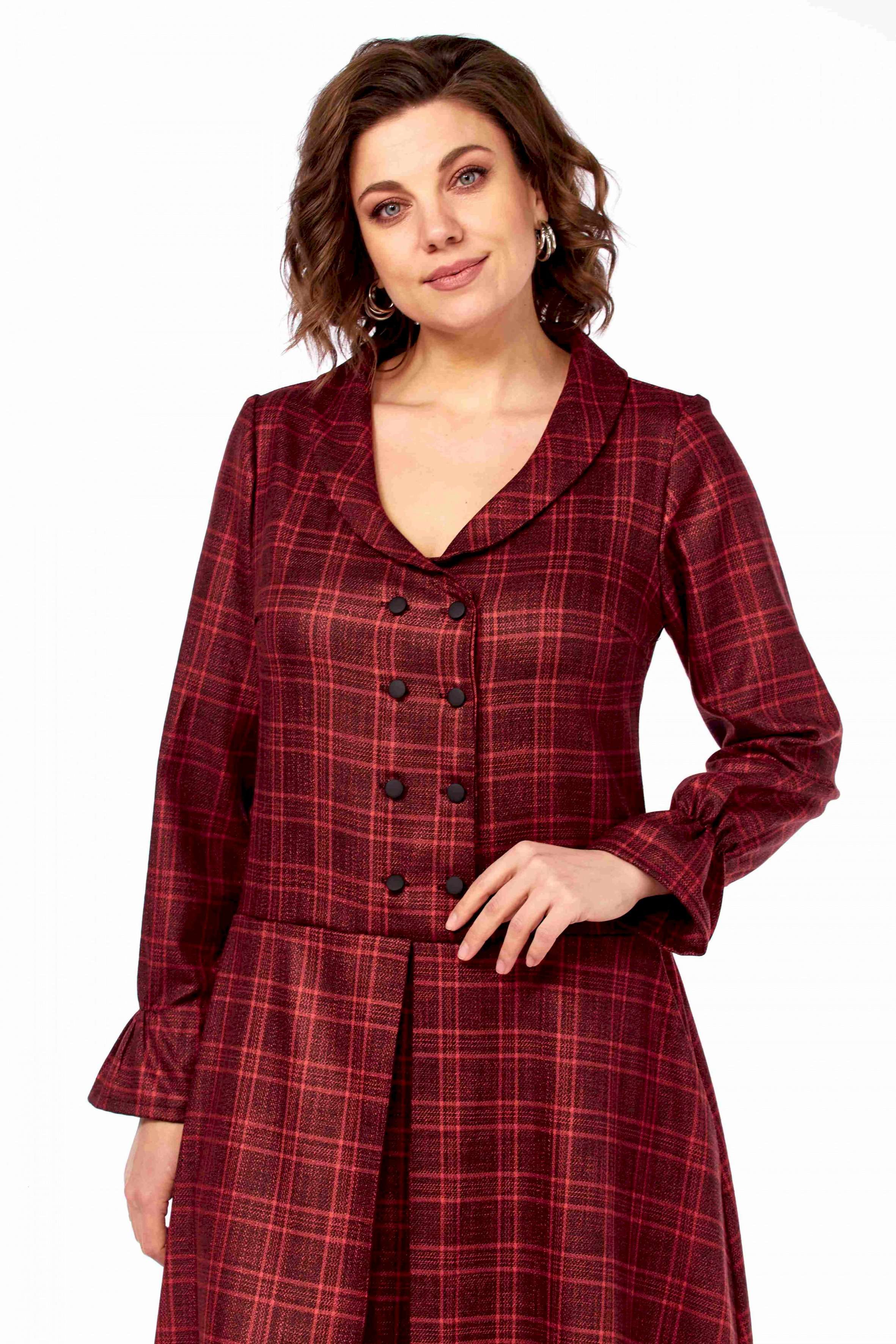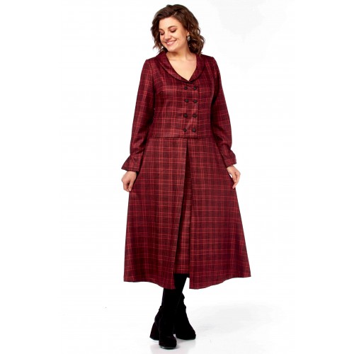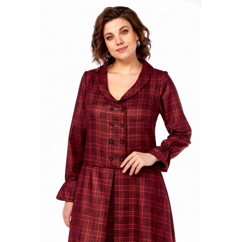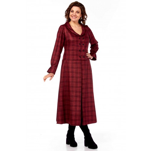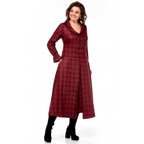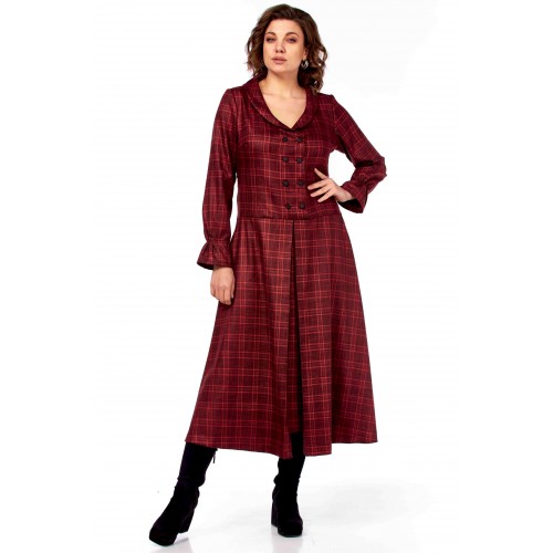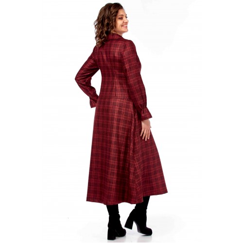 Платье миди, силуэт полуприлегающий в верхней части, переходящий в расклешенный А-силуэт к низу, создающий эффект удлиненной и струящейся фигуры. Воротник широкий, плоский, отложной, с закругленными краями. Лиф с застежкой на петли пуговицы. Декоративный ряд контрастных пуговиц, подчеркивает V-образный вырез и утончает силуэт. Для лучшего прилегания в платье выполнены нагрудные выточки и выточки по спинке, для большего удобства обработаны карманы-хулиганы. Рукава длинные, втачные, с легкой сборкой на манжетах, что добавляет мягкости и женственности. По полочке и спинке идет подрез чуть ниже линии талии, от которого по полочке юбки выполнена встречная складка. Длина изделия по спинке 120 см., длина рукава 62 см.