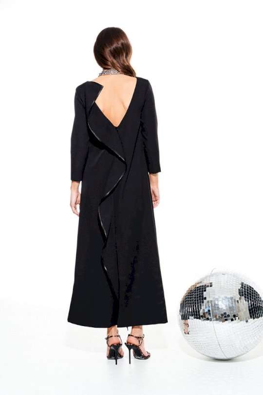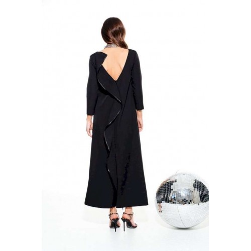 Платье из костюмно-плательной ткани, умеренного объема, прямого силуэта, с застежкой на потайную молнию в среднем шве спинки. Перед с круглым вырезом горловины и нагрудными вытачками. Спинка с V-образным вырезом горловины, средним швом и разрезом. Вырез горловины и средний шов спинки оформлены воланом. Рукав 3/4, втачной, одношовный. Длина платья до щиколотки.