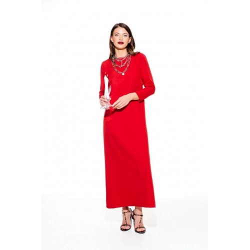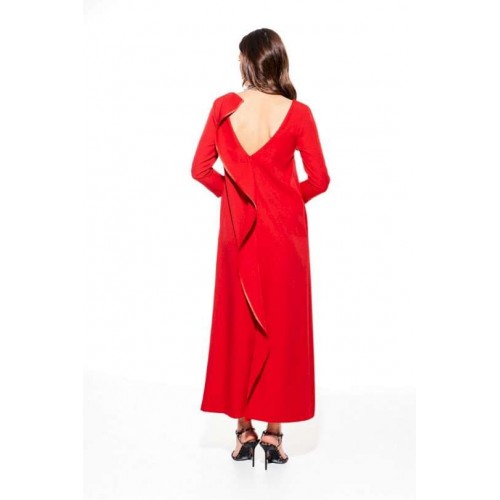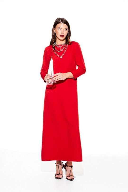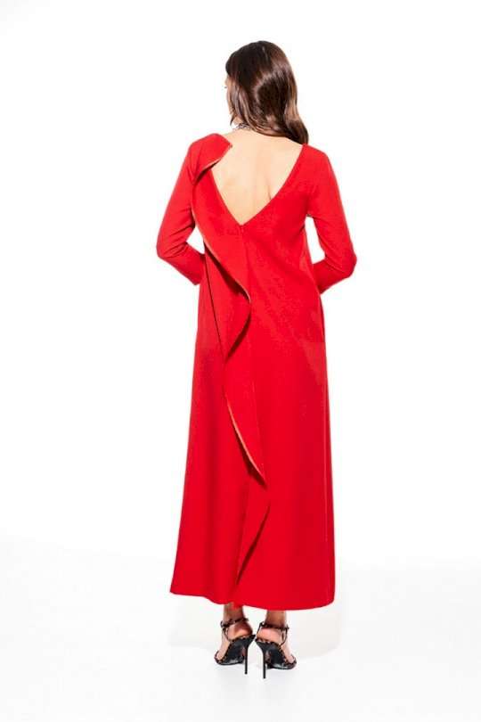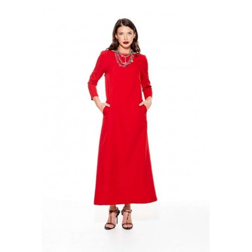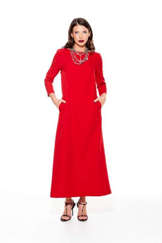 Платье из костюмно-плательной ткани, умеренного объема, прямого силуэта, с застежкой на потайную молнию в среднем шве спинки. Перед с круглым вырезом горловины и нагрудными вытачками. Спинка с V-образным вырезом горловины, средним швом и разрезом. Вырез горловины и средний шов спинки оформлены воланом. Рукав 3/4, втачной, одношовный. Длина платья до щиколотки.
