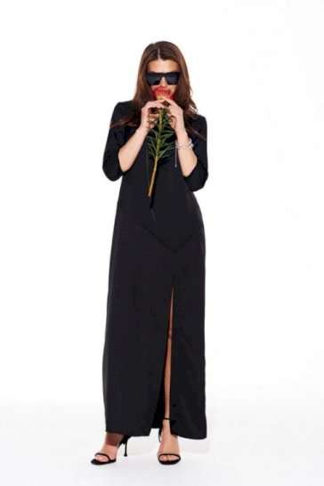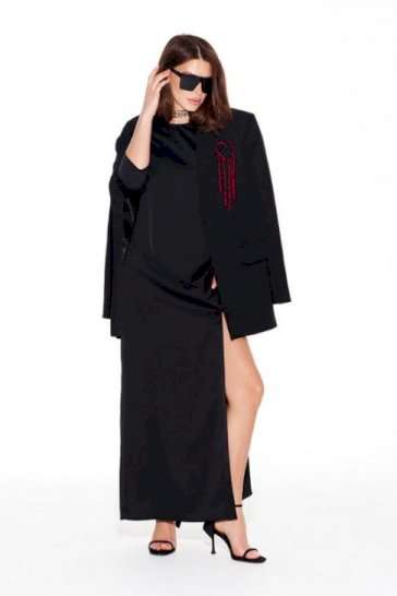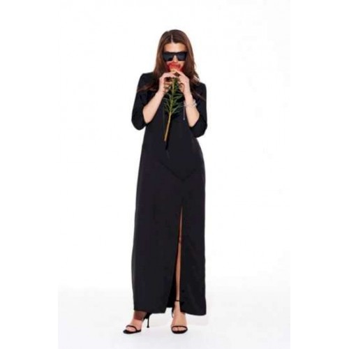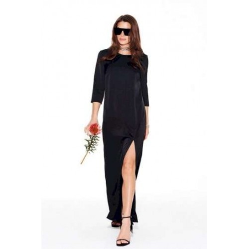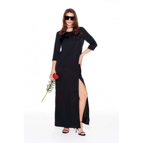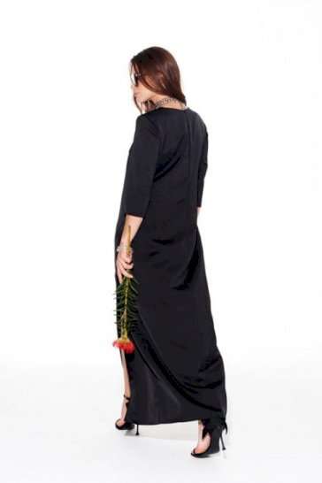 Платье из струящейся ткани с блеском, умеренного объема, прямого силуэта, с круглым вырезом горловины. Перед с нагрудными вытачками и фигурным подрезом. Нижняя часть переда с разрезом. Спинка со средним швом и застежкой на потайную тесьму-молнию. Рукав 3/4, втачной, одношовный.