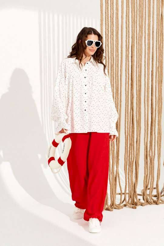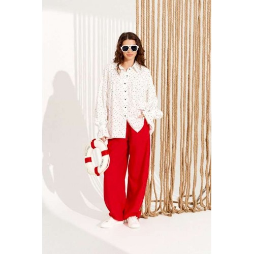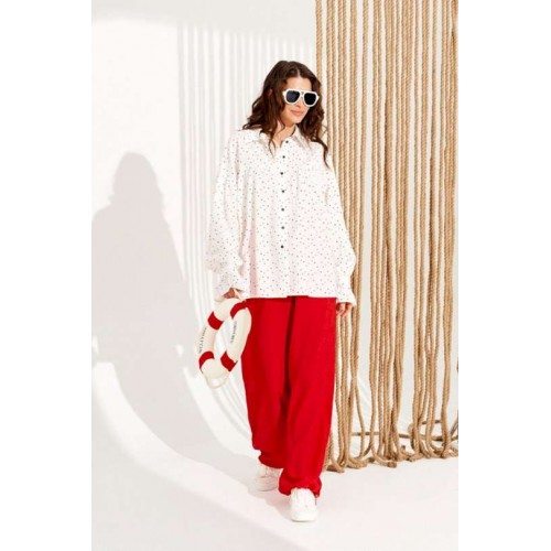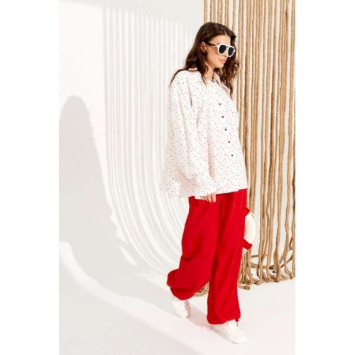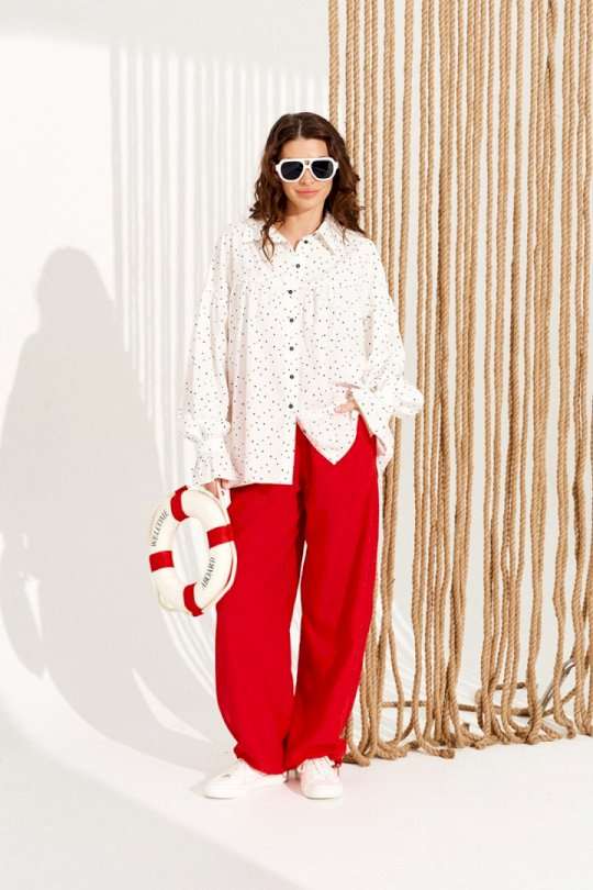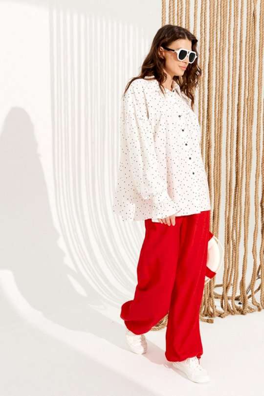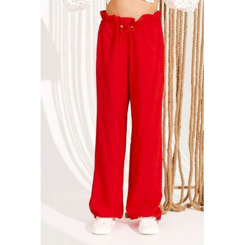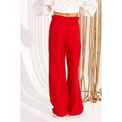 Брюки свободного объема, прямого силуэта. Перед с имитацией гульфика. Пояс цельнокроеный, с отделочными строчками, образующими кулиску, в которую продет эластичный шнур с фиксаторами. Для регулировки объема нижний срез оформлен кулиской с эластичным шнуром и фиксатором. Длина изделия на модели вдоль бокового шва с учетом пояса — 111 см (допустимое отклонение +/- 1 см)