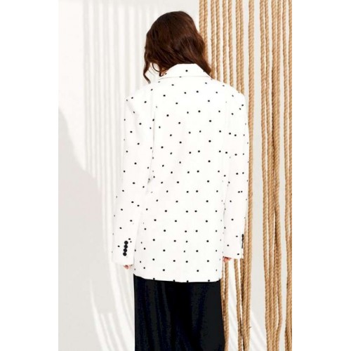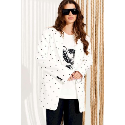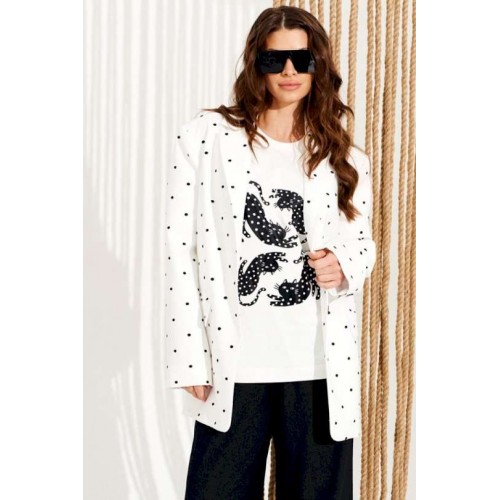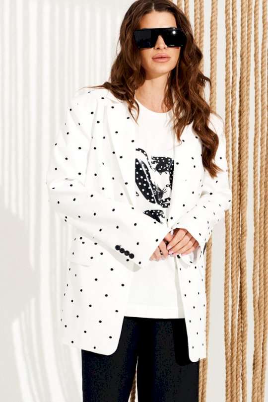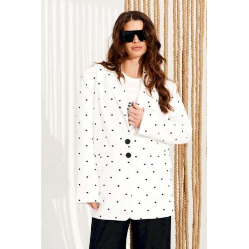 Жакет свободного объема, прямого силуэта, с центральной застежкой на 2 петли и 2 пуговицы, отложным воротником и лацканами пиджачного типа, на подкладке. Детали переда с талиевыми вытачками, отрезными бочками и прорезными карманами с клапанами и двумя обтачками. Спинка со средним швом, отрезными бочками и шлицей. Рукав втачной, двухшовный, длинный. В локтевых швах — функциональные шлицы, застегивающиеся на 4 петли и 4 пуговицы. Длина изделия на модели вдоль середины спинки — 78 см (допустимое отклонение +/- 1 см)