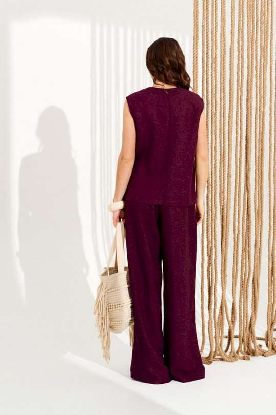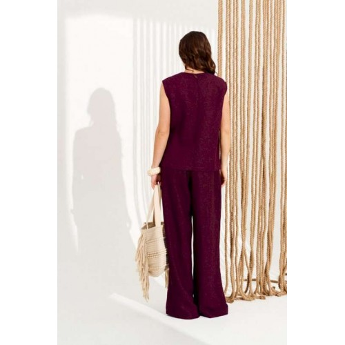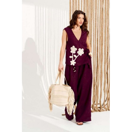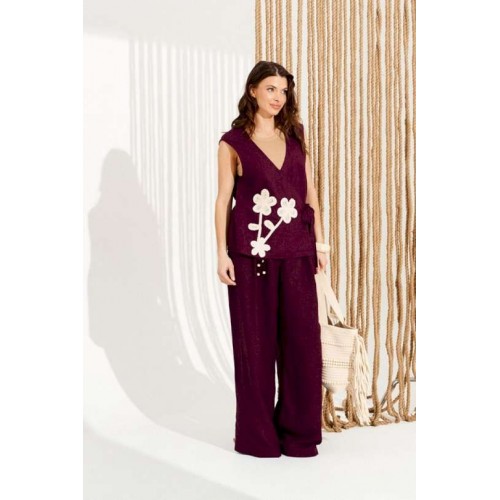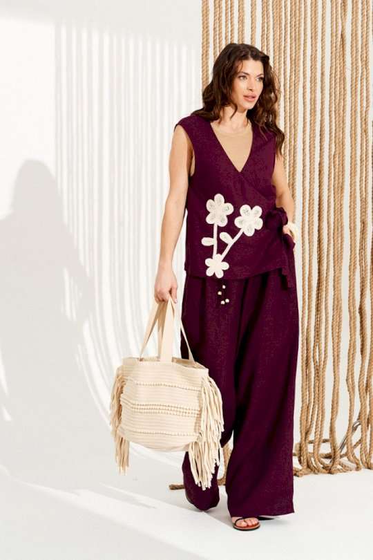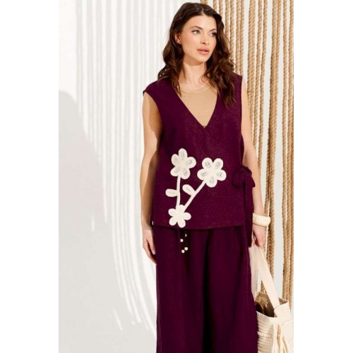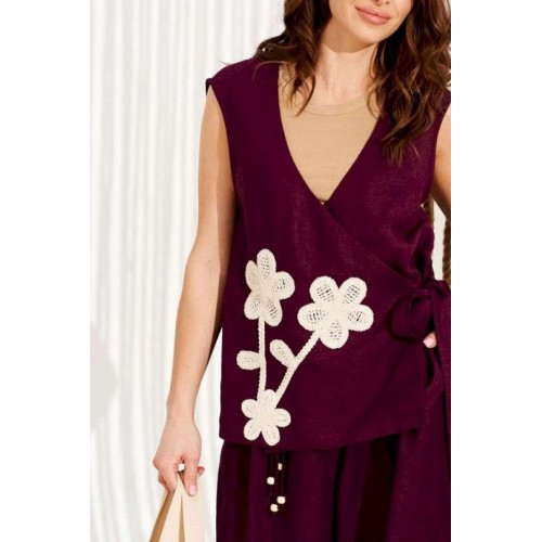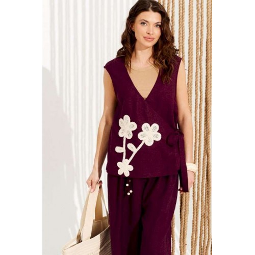 Жилет свободного объема, прямого силуэта, с запахом на завязках и V-образным вырезом горловины. Детали переда с талиевыми вытачками. На правой детали переда расположены декоративные нашивки «Цветы». Спинка со средним швом. Горловина и борта обработаны цельнокроеными обтачками. Длина изделия на модели вдоль середины спинки — 59 см (допустимое отклонение +/- 1 см)
