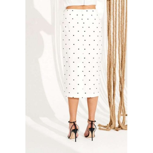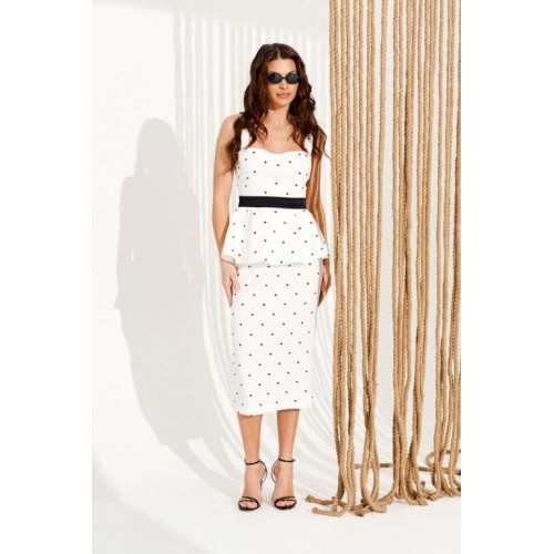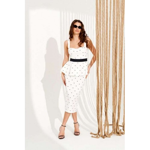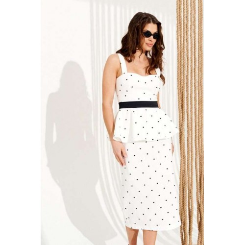 Костюм 2-х предметный, состоящий из блузки и юбки. Блузка приталенного силуэта на подкладке, отрезная по линии талии. Модель на широких бретелях, лиф выполнен с рельефами и акцентными отрезными чашками. Спинка с талиевыми вытачками и застежкой на тесьму-молнию в среднем шве. Нижняя часть изделия выполнена в виде расклешенной баски. Юбка полуприлегающего силуэта. Заднее полотнище с талиевыми вытачками, средним швом, шлицей и застежкой на потайную молнию. Костюм дополнен декоративным поясом, который элегантно подчеркивает линию талии. Длина блузки на модели вдоль середины спинки с учетом бретели — 60 см. Длина юбки на модели вдоль бокового шва — 75 см (допустимое отклонение +/- 1 см).