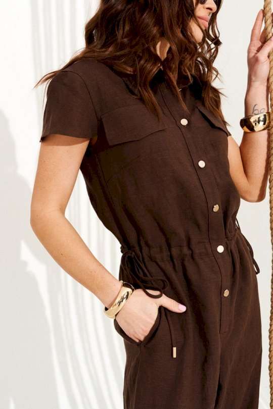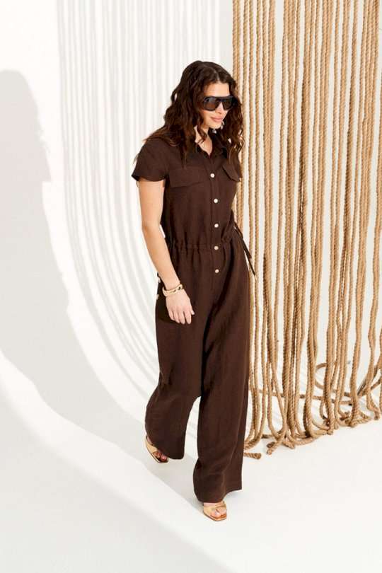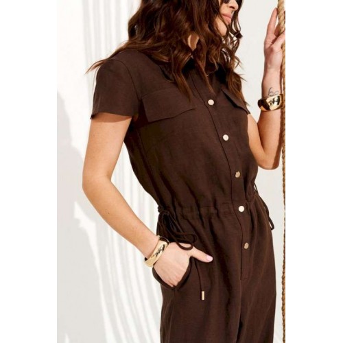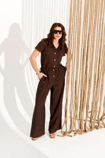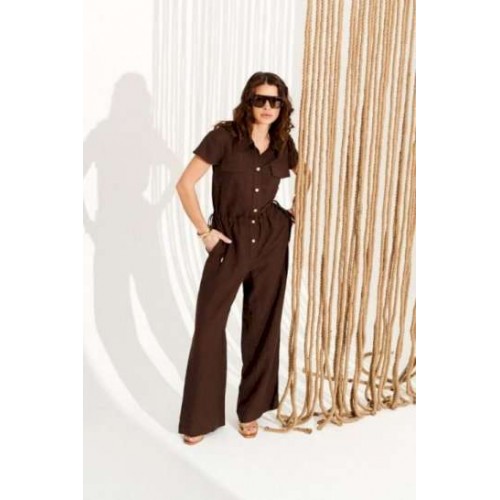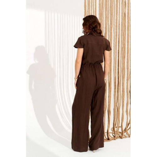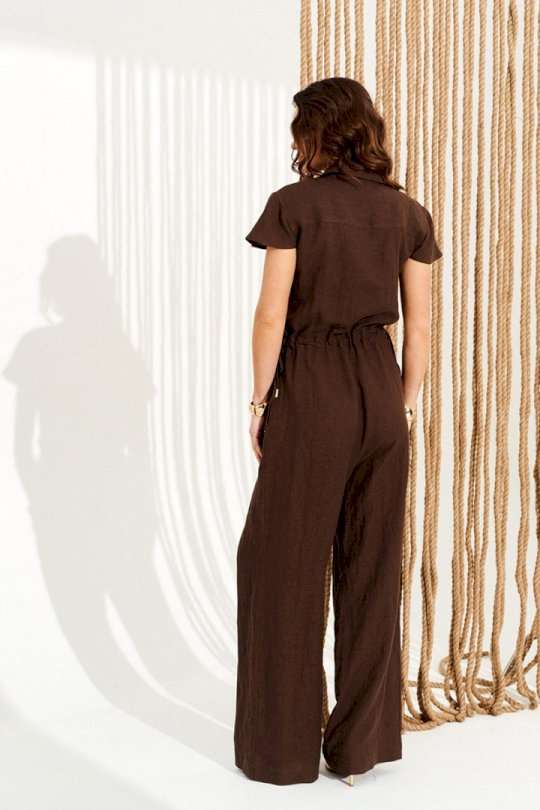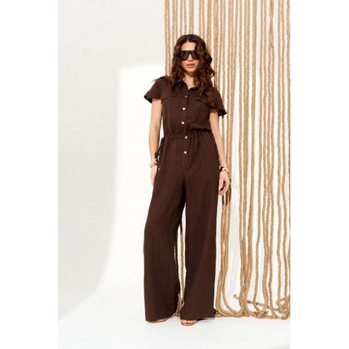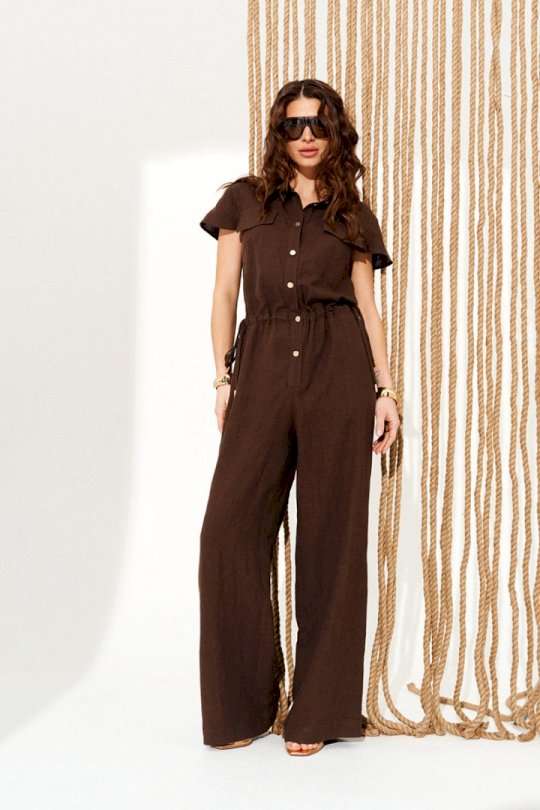Комбинезон умеренного объема, полуприлегающего силуэта, с центральной застежкой на петли и пуговицы. Воротник стояче-отложной на отрезной стойке. Детали переда с нагрудными вытачками и декоративными настрочными клапанами. Спинка с отрезной кокеткой. По линии талии расположена настрочная кулиска со шнурами-завязками и наконечниками, выведенными в боковые швы для регулировки прилегания. Рукав-крылышко. Длина изделия на модели вдоль середины спинки до низа штанины — 156 см (допустимое отклонение +/- 1 см).
