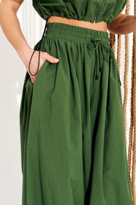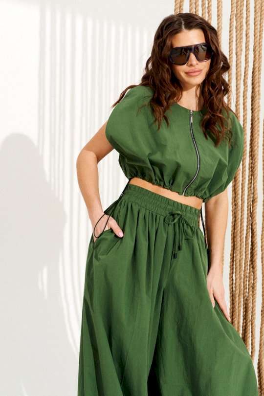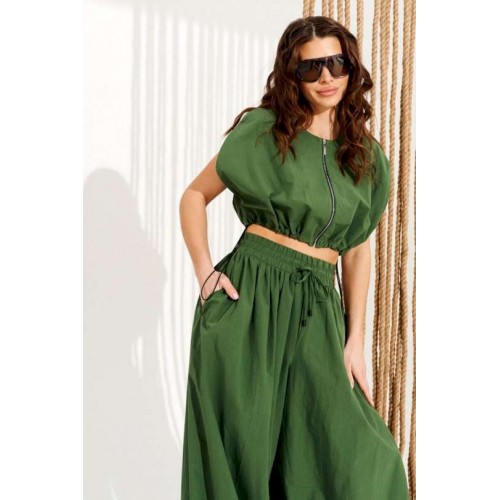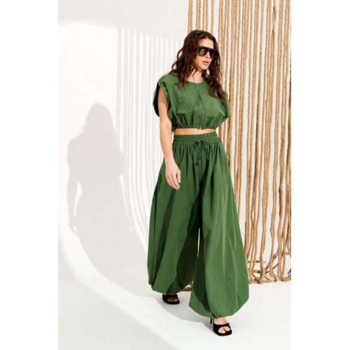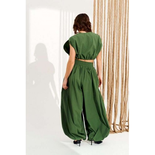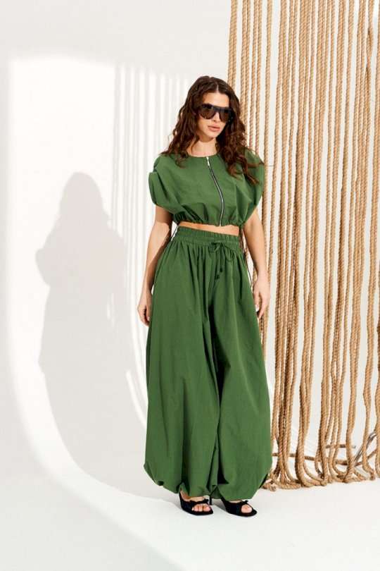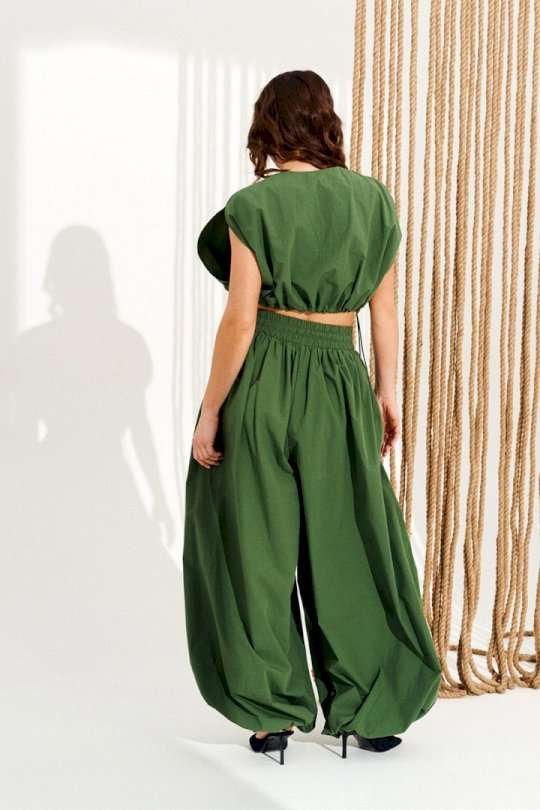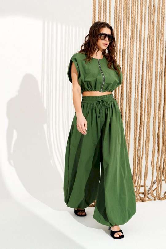 Комплект 2-х предметный, состоящий из блузона и брюк. Блузон свободного объема, прямого силуэта, с центральной застежкой на тесьму-молнию и фигурным вырезом проймы. Для регулировки объема по низу изделия предусмотрена кулиска с эластичным шнуром и фиксаторами. Горловина и борта обработаны цельнокроеными обтачками. Брюки большого объема. В боковых швах расположены карманы. Пояс притачной, на резинке с отделочными строчками, образующими кулиску, в которую продет шнур-завязка с наконечниками. Нижний срез брюк на резинке. Длина блузы на модели вдоль середины спинки — 39 см (допустимое отклонение +/- 1 см). Длина брюк на модели вдоль бокового шва с учетом пояса — 117,5 см (допустимое отклонение +/- 1 см).