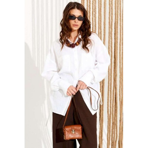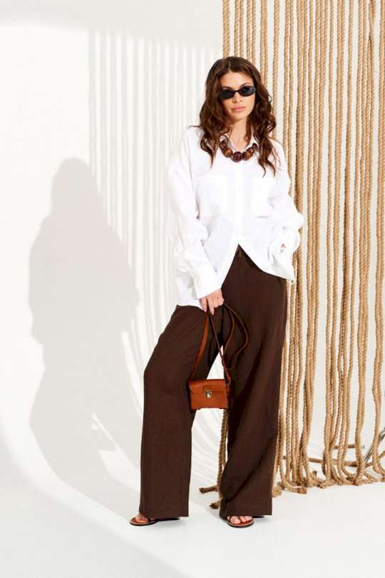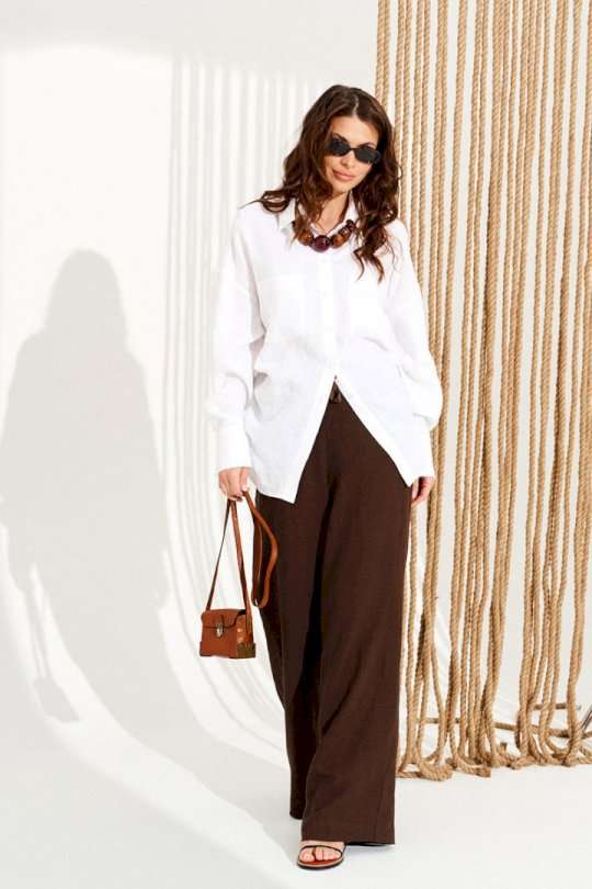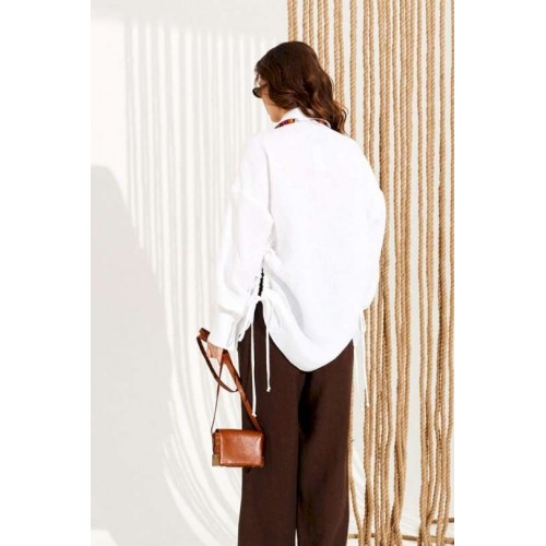Блузка свободного объема, прямого силуэта, с центральной застежкой на петли и пуговицы. Воротник стояче-отложной с отрезной стойкой. Детали переда с накладными карманами. Спинка цельная. Боковые швы заканчиваются разрезами с кулисками и завязками. Рукав втачной, одношовный, длинный. Нижний срез рукава с разрезом и притачной манжетой с застежкой на одну петлю и пуговицу. Длина изделия на модели вдоль середины спинки — 81 см (допустимое отклонение +/- 1 см).