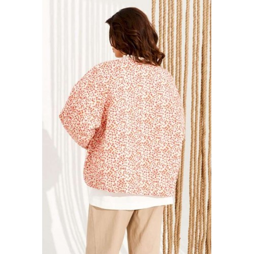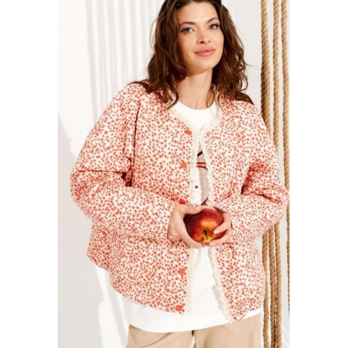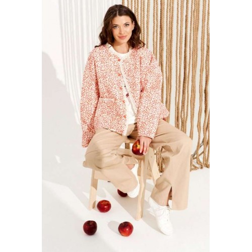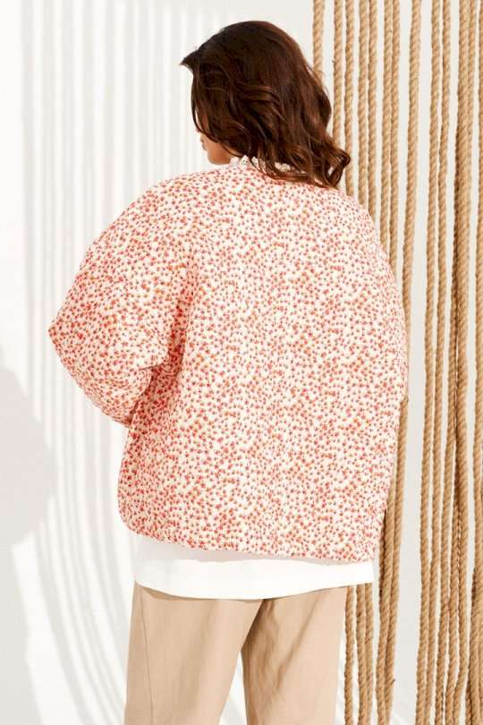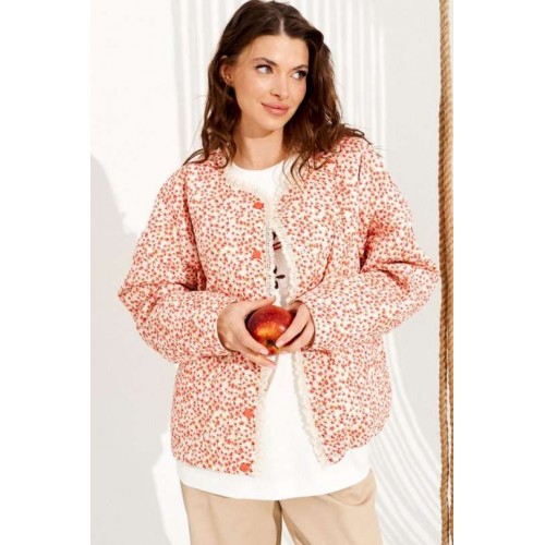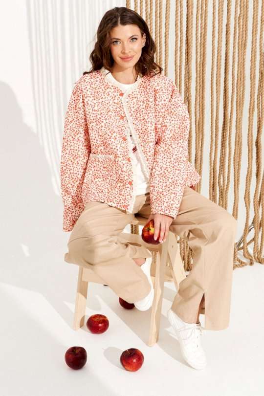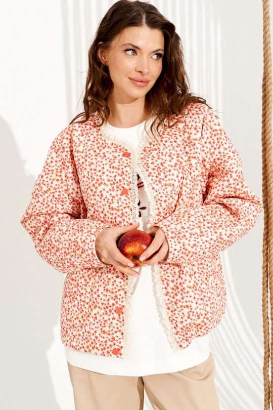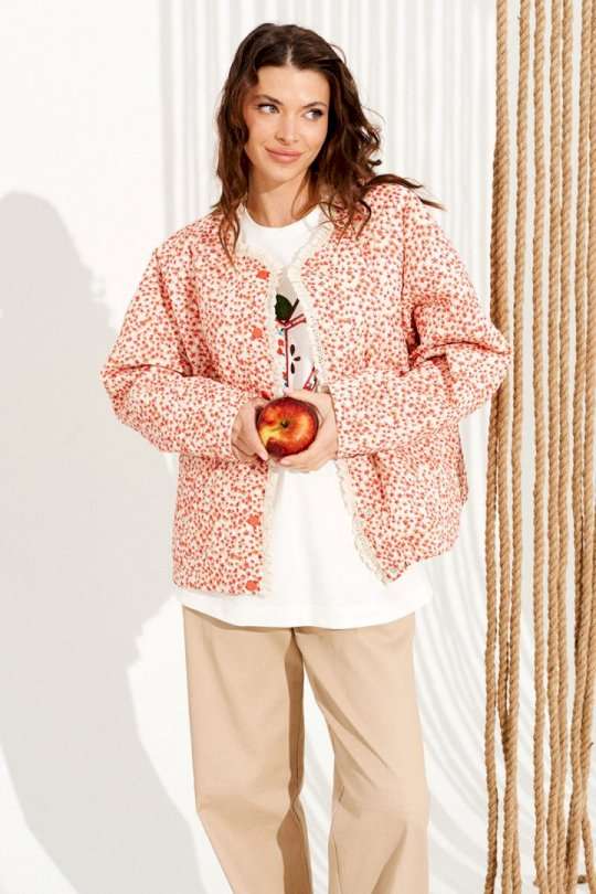 Куртка из стеганой ткани, свободного объема, прямого силуэта, с центральной застежкой на кнопки. Детали переда с накладными карманами. Спинка цельная. Рукав втачной, одношовный, длинный. Для регулировки объема нижний срез оформлен кулиской с эластичным шнуром и фиксаторами. Горловина, борта и карманы обработаны кружевом. Длина изделия на модели вдоль середины спинки — 62 см (допустимое отклонение +/- 1 см).