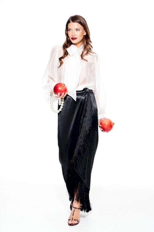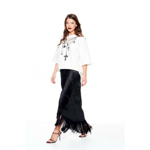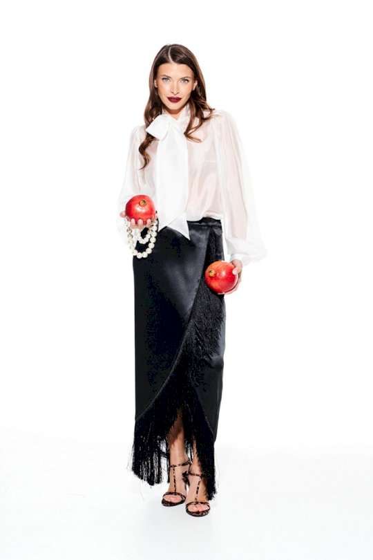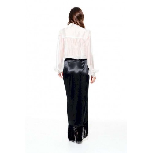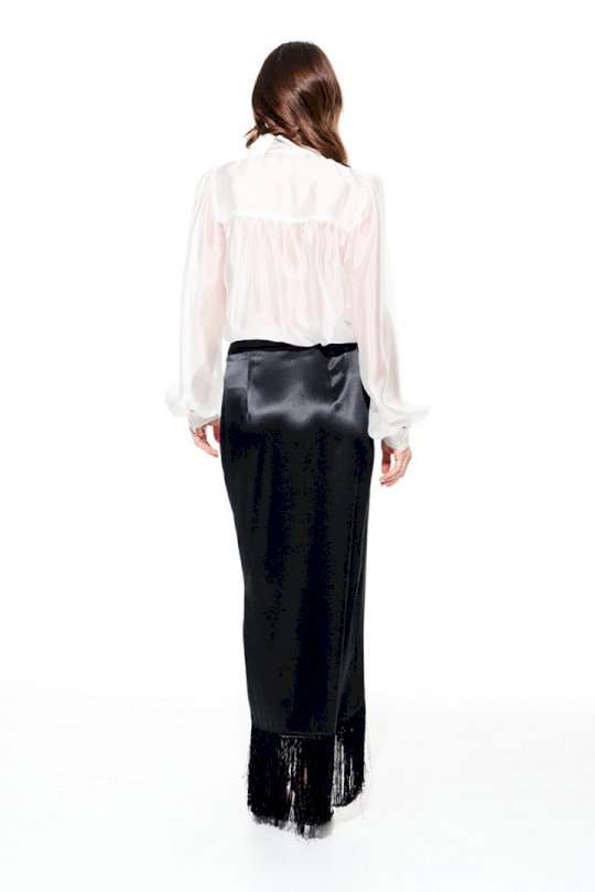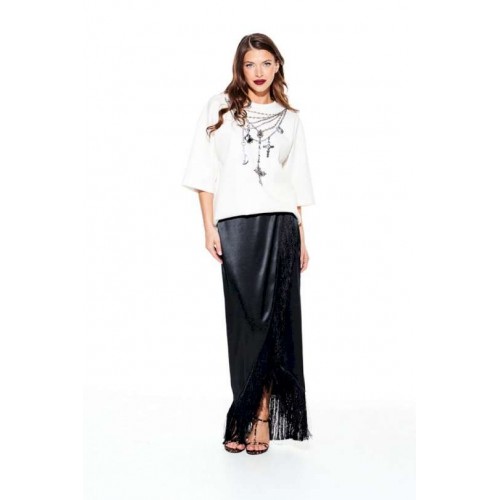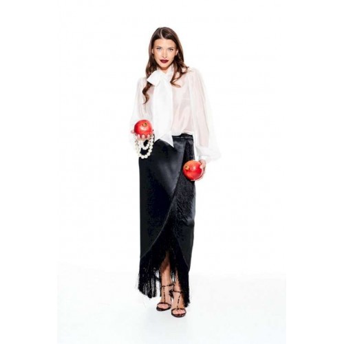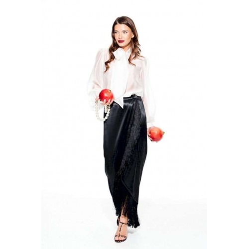 Юбка из струящейся ткани с блеском, прямого силуэта, с бахромой, застежкой на потайную молнию в левом боковом шве. Переднее полотнище с запахом. Заднее полотнище с талиевыми вытачками. Пояс притачной, с застежкой на 1 петлю и 1 пуговицу.