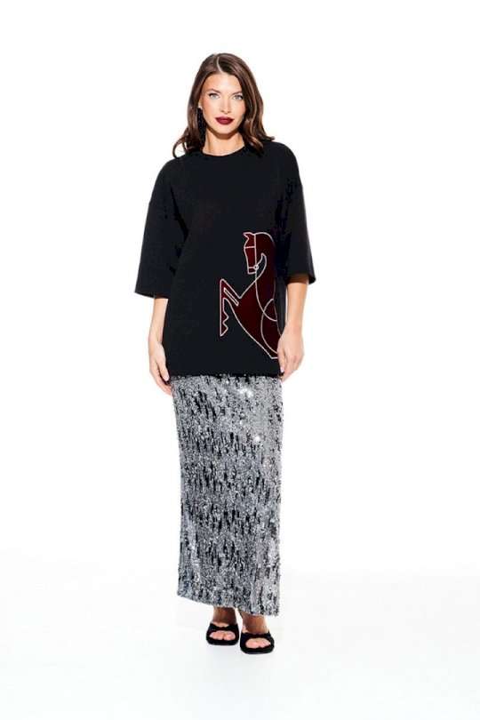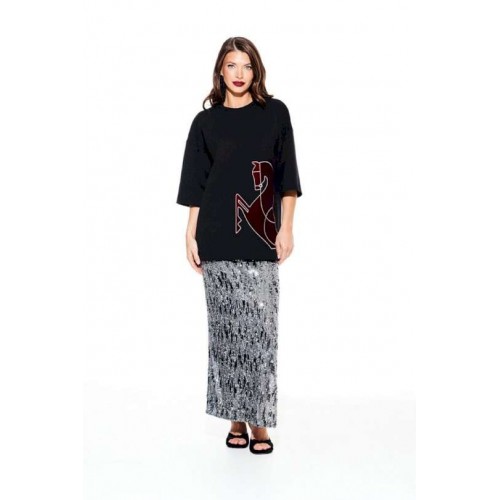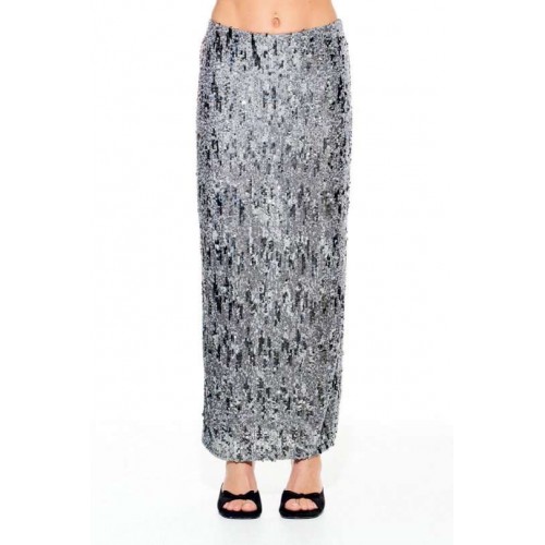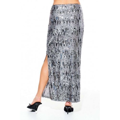 Юбка из трикотажного полотна в пайетки с притачными шортами, прямого силуэта, с разрезом в левом боковом шве. Перед и спинка цельные. Пояс на резинке. Длина юбки до щиколотки. Шорты выполнены из трикотажной подкладки.