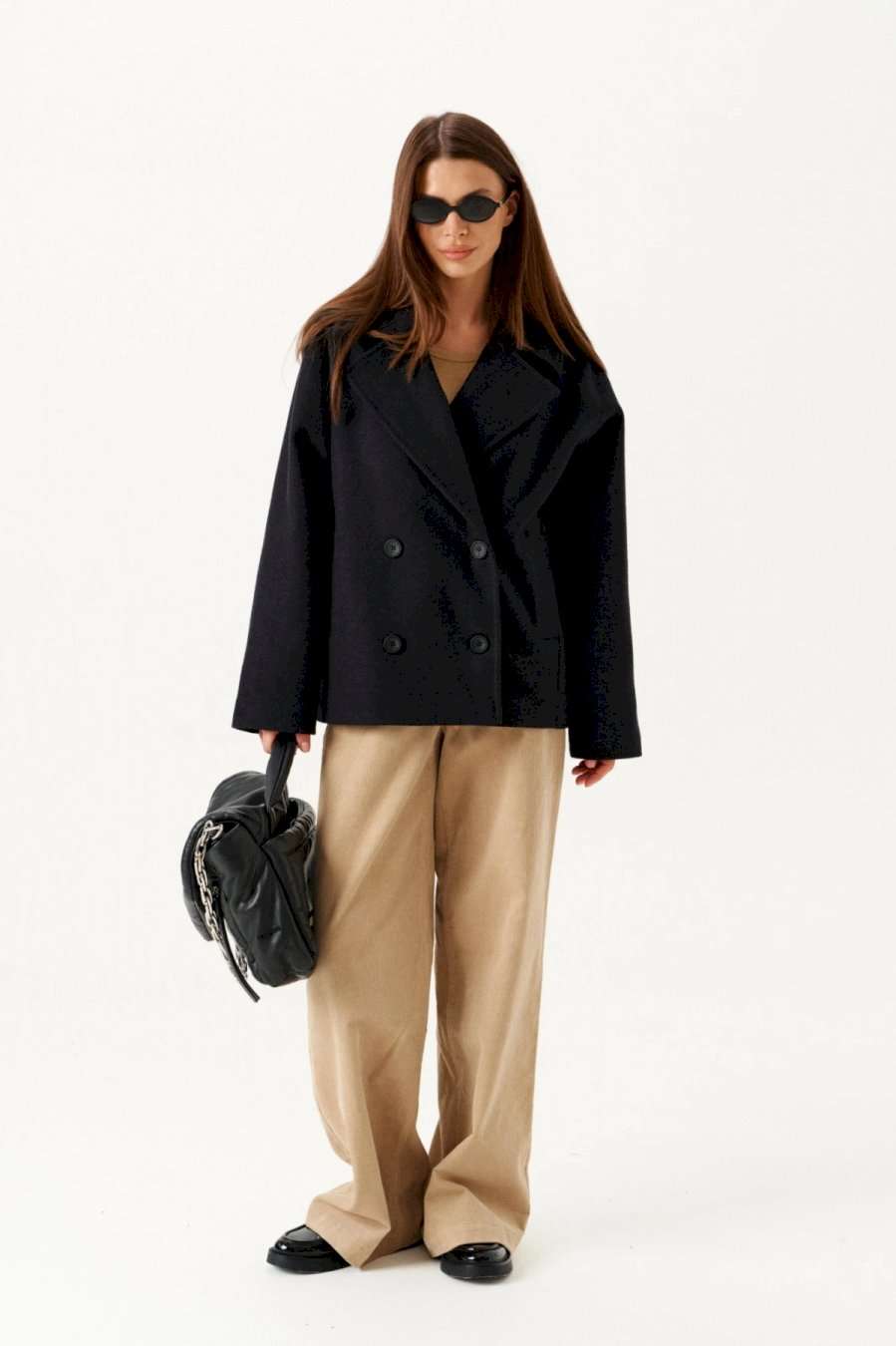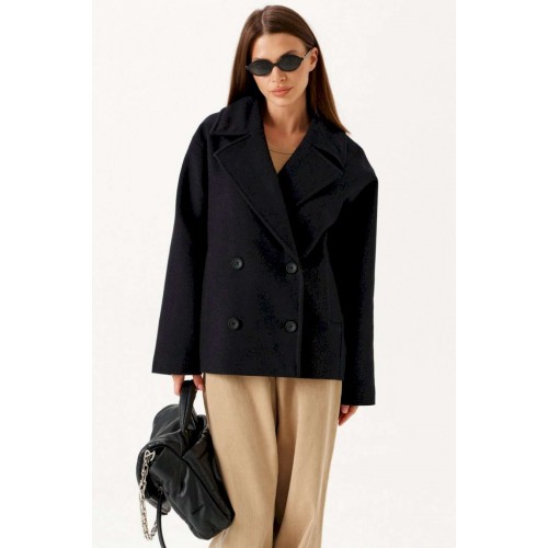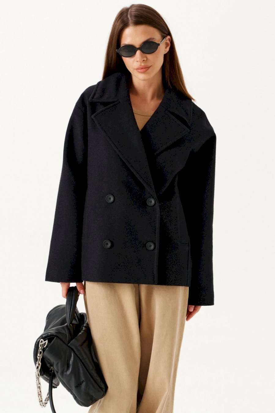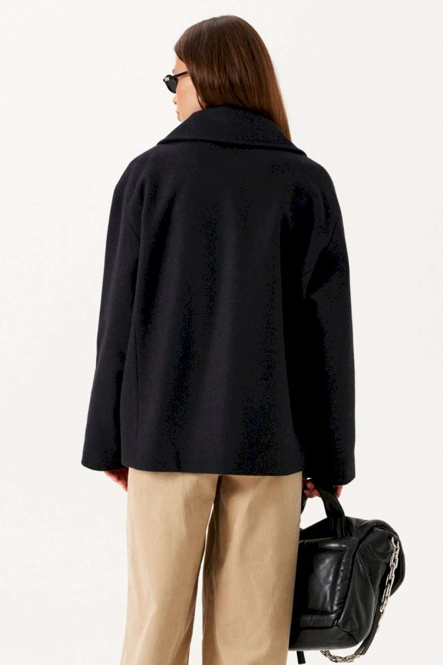 Полупальто из пальтовой ткани, прямого силуэта, свободное, с центральной двубортной застежкой на петли и пуговицы, отложным воротником и лацканами пиджачного типа, на подкладке. Перед с отрезными бочками и прорезными карманами с листочкой. Спинка с отрезными бочками. Рукав втачной, длинный.