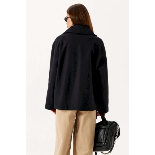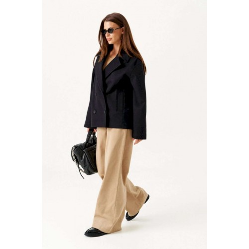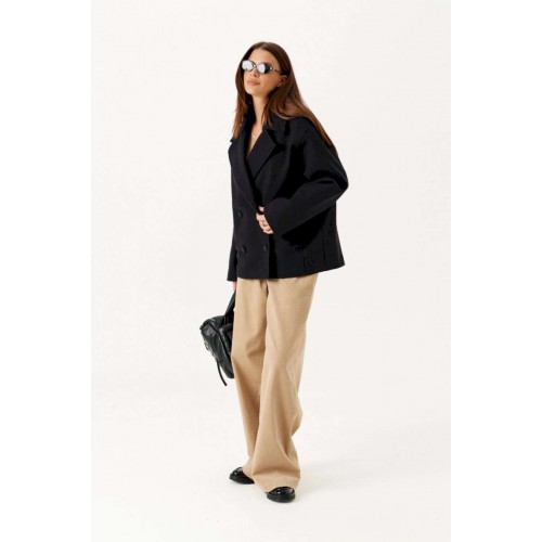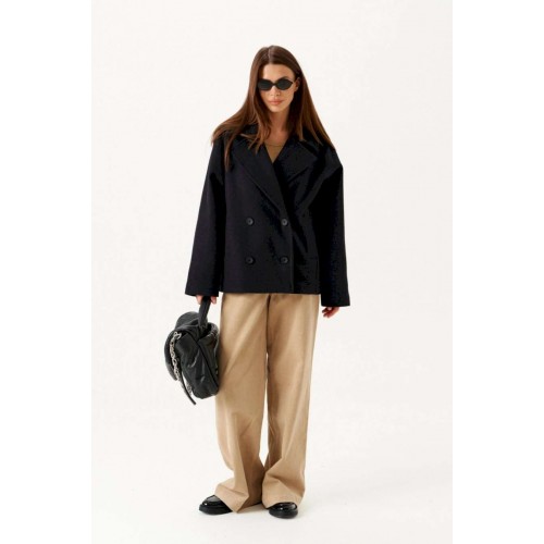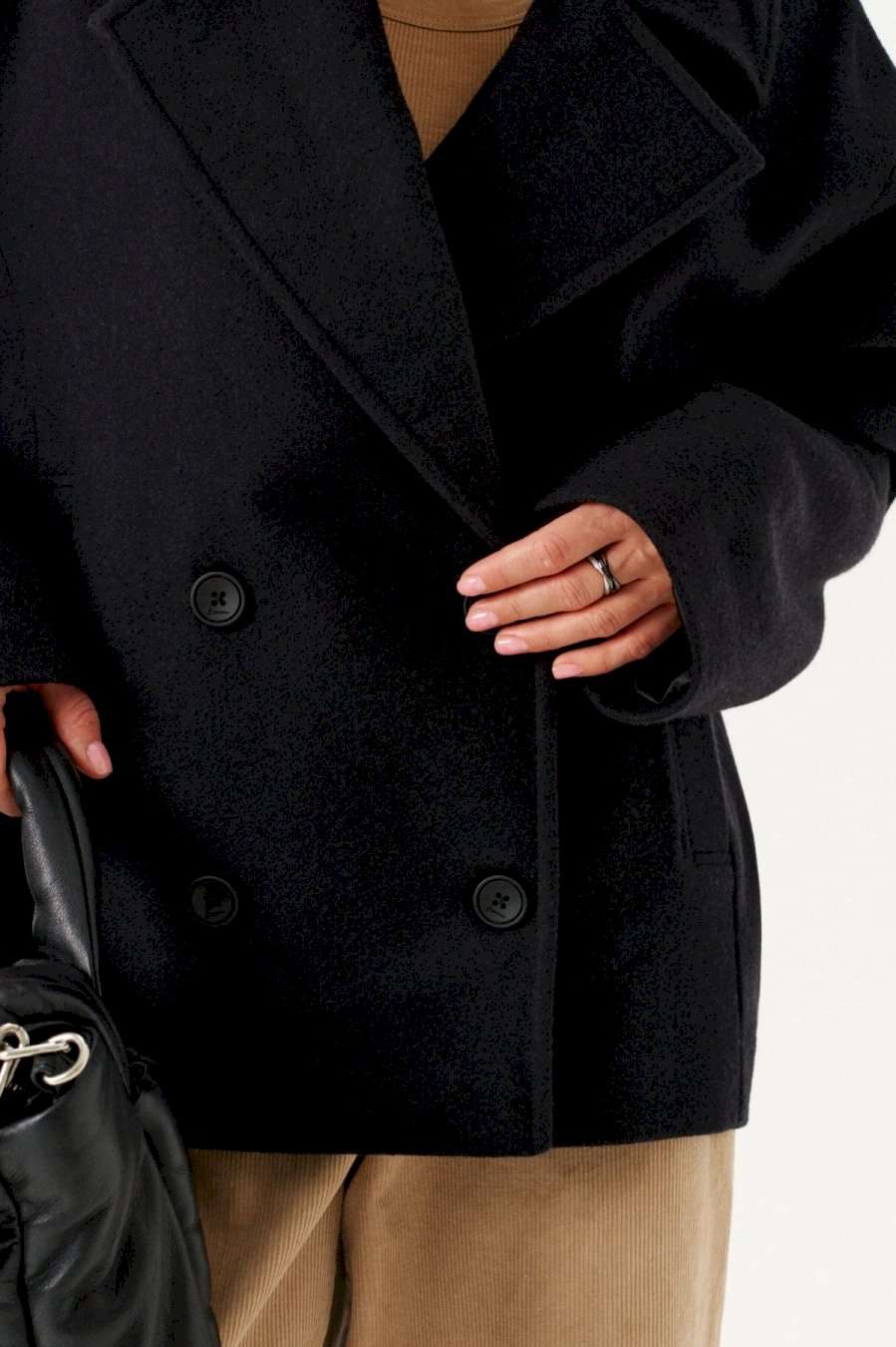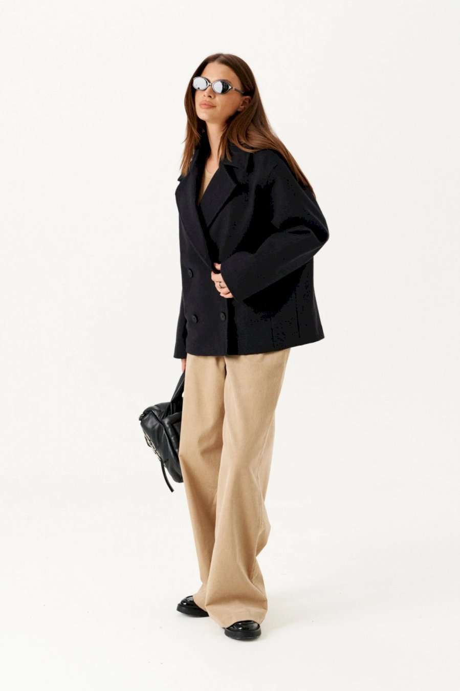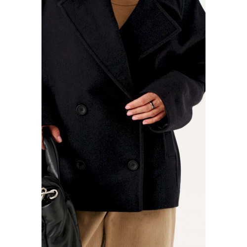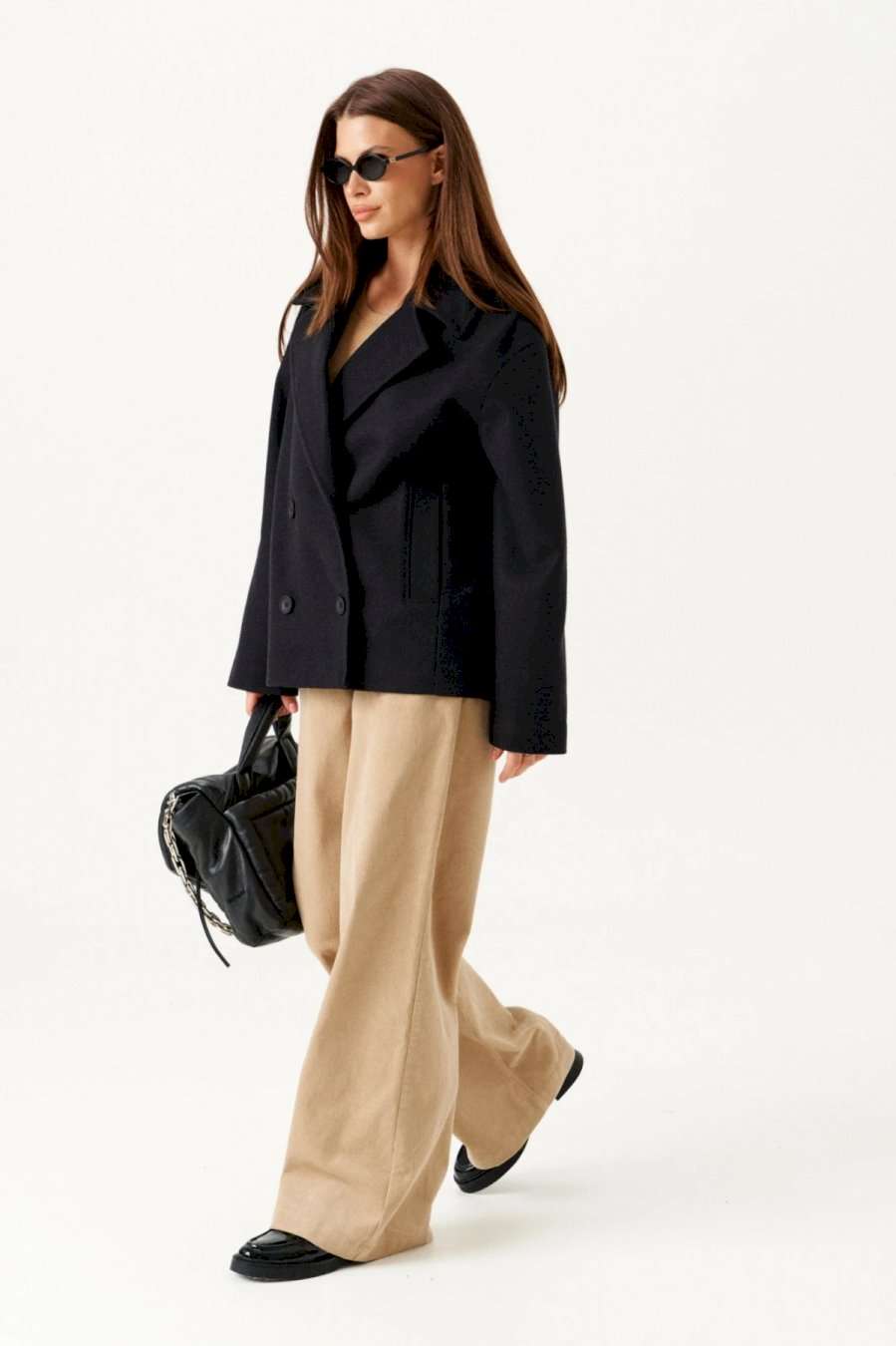 Полупальто из пальтовой ткани, прямого силуэта, свободное, с центральной двубортной застежкой на петли и пуговицы, отложным воротником и лацканами пиджачного типа, на подкладке. Перед с отрезными бочками и прорезными карманами с листочкой. Спинка с отрезными бочками. Рукав втачной, длинный.