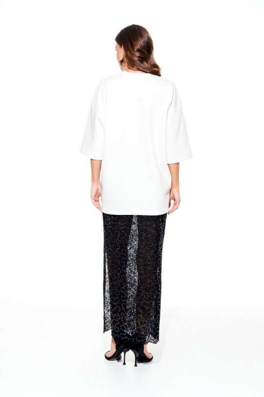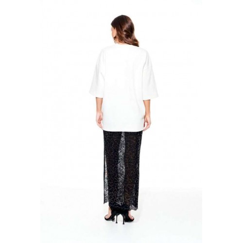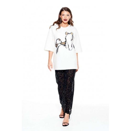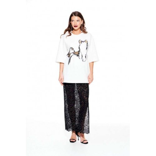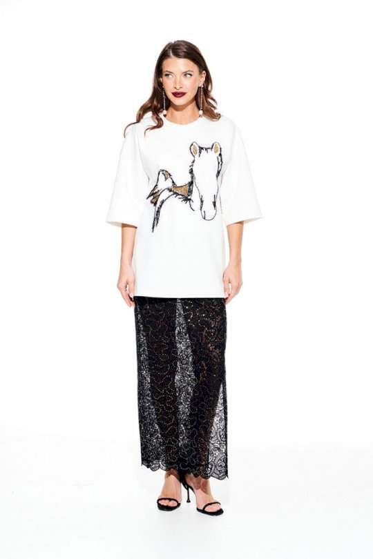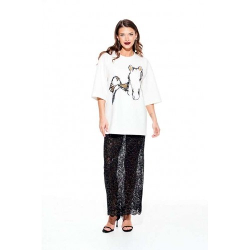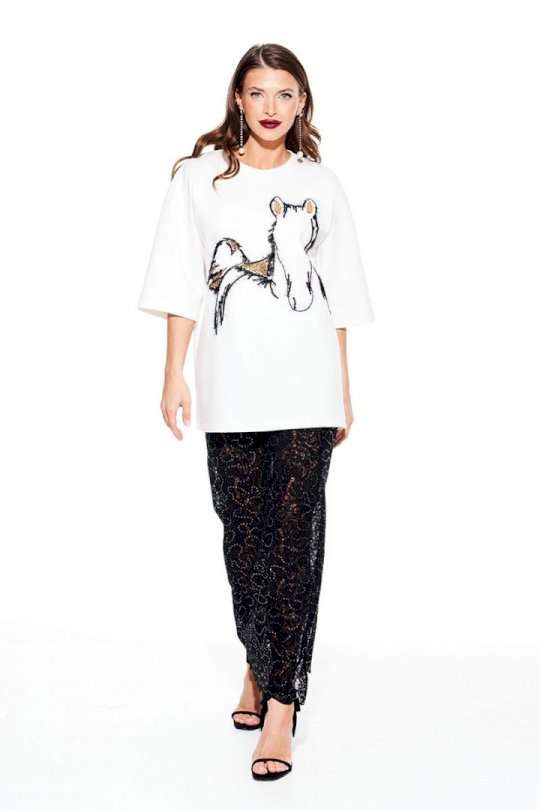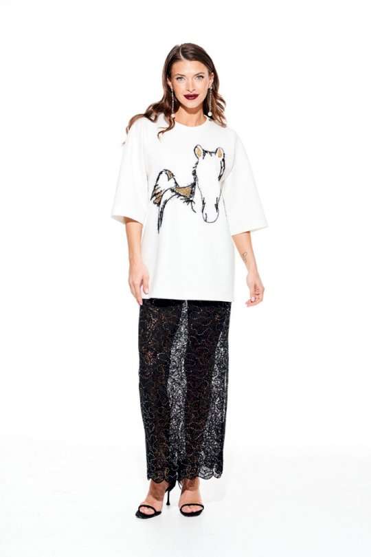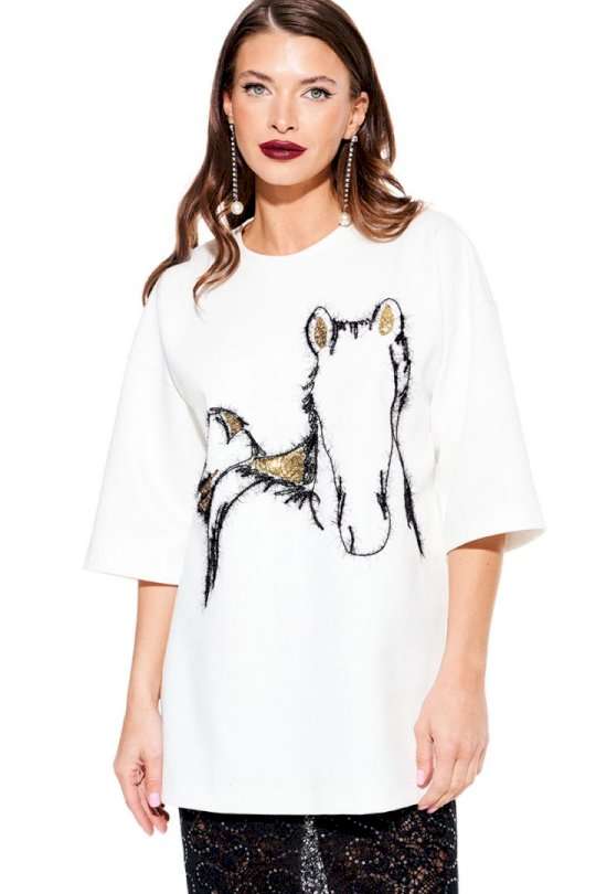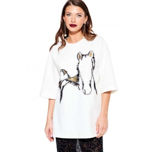 Джемпер из трикотажного полотна, прямого силуэта, свободный, с круглым вырезом горловины. Перед и спинка цельные. По переду выполнена вышивка \"Лошадь\".