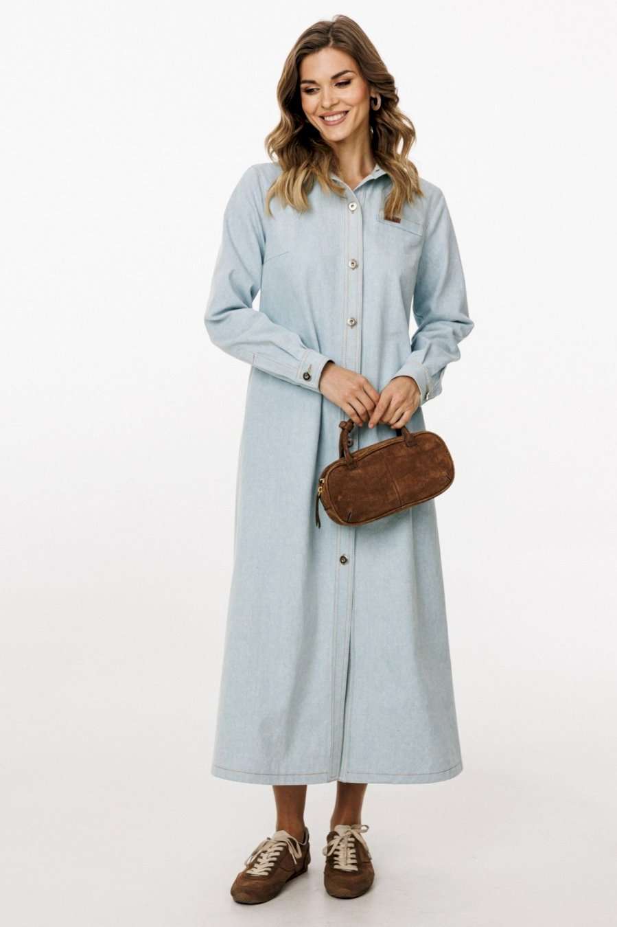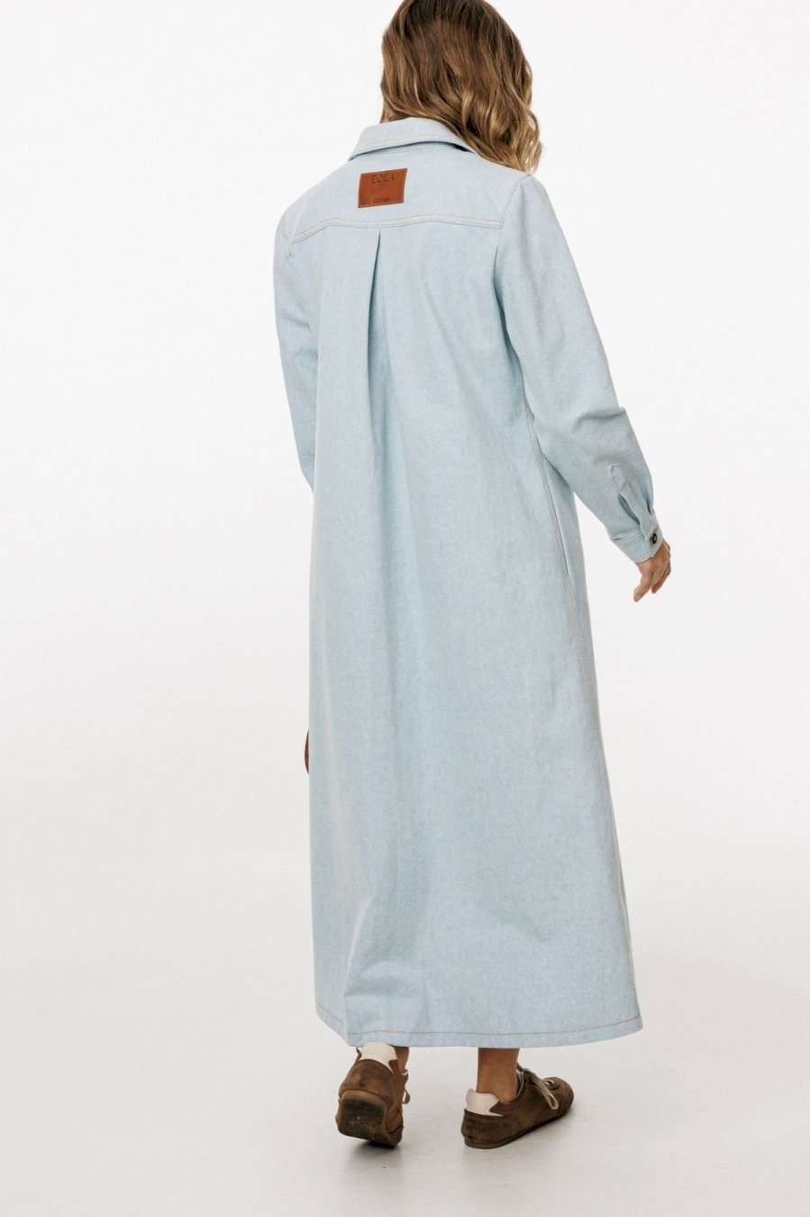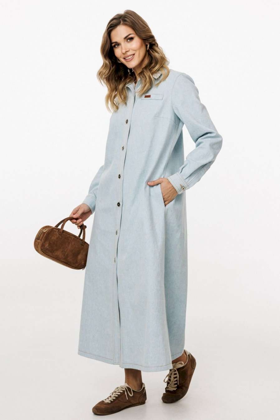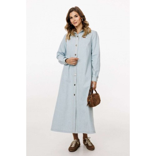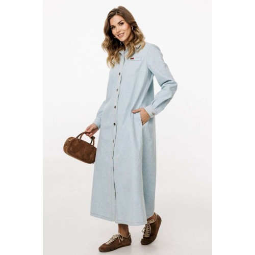 Платье выполнено из плотного джинса. Платье А-образного силуэта, длиной миди. Застежка спереди на металлические пробивные пуговицы. На спинке кокетка и встречная складка от нее. Воротник стояче-отложной с отрезной стойкой. Рукав втачной, одношовный, с прорезью и складками по низу. Низ рукава на манжете, застегивающейся на пуговицу. В боковых швах карманы. Платье декорировано нашивками из натуральной кожи по переду и спинке. В комплект входит ремень из сновной ткани с обтяжной пряжкой. Длина платья: р.42-46 -127 см, р.48-52 - 128,5 см. Длина рукава: р.42-46 - 63 см, р.48-52 - 64 см. ПЛАТЬЕ м. 3041 42 44 46 48 50 52 Длина по центру спинки 133 133 133 134,5 134,5 134,5 Длина рукава 64 64 64 65 65 65 Объем по груди 51 53 55 57 59 61 Объем по талии 49 51 53 55 57 59 Объем по бедрам 54 56 58 60 62 64 Объем по низу 74 76 78 80 82 84 Объем рукава вверху 32 34 36 38 40 42 Объем рукава внизу 22 22 22 24 24 24