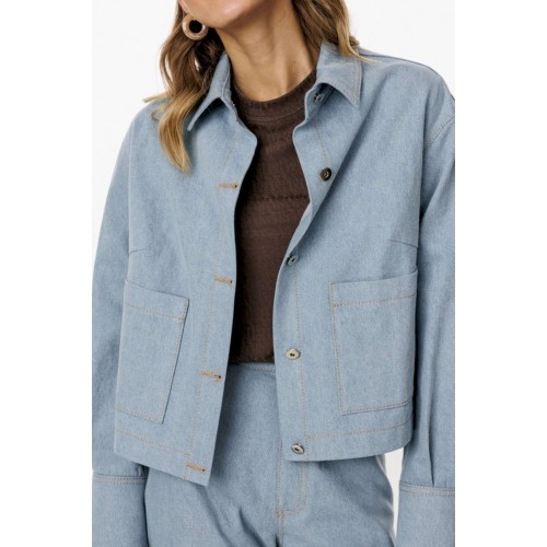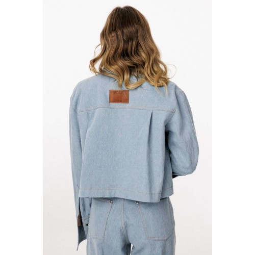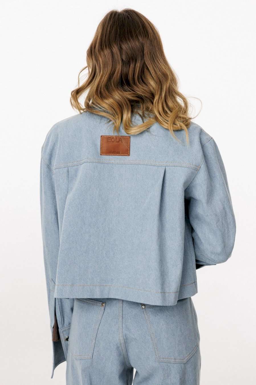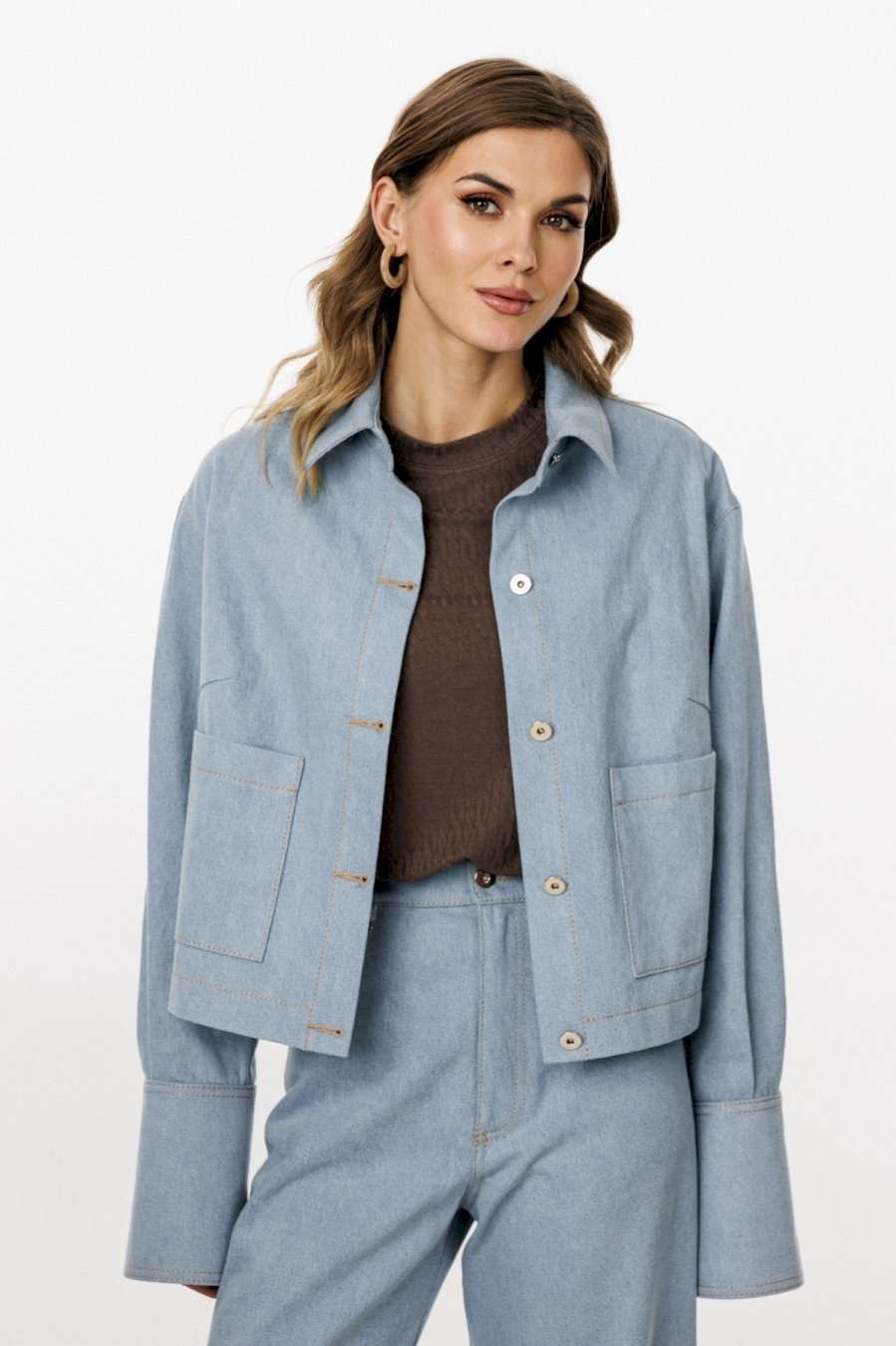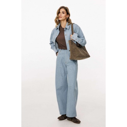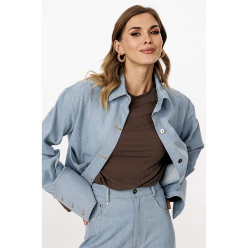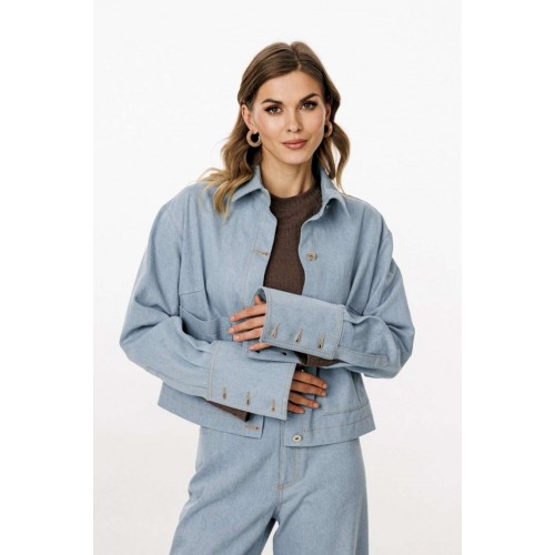 Блузка выполнена из плотного джинса. Блузка прямого силуэта, длиной ниже линии талии. Спереди накладные карманы и центральная застежка с планкой на пробивные пуговицы. На спинке кокетка и две складки. Воротник стояче-отложной с отрезной стойкой. Плечевой шов удлинен. Рукав рубашечного покроя, одношовный. Низ рукава на притачной манжете с застежкой на пробивные пуговицы. Рукав удлинен. Блузка декорирована по кокетке спинки нашивкой из натуральной кожи. Длина куртки: р. 44-48 - 49 см, р. 50-54 - 50.5 см. Длина рукава от горловины: р. 44-48 - 80 см, р. 50-54 - 81 см. БЛУЗКА м. 3042 44 46 48 50 52 54 Длина по центру спинки 49 49 49 50,5 50,5 50,5 Длина рукава от горловины 80 80 80 81 81 81 Объем по груди 116 120 124 128 132 136 Объем по талии 122 126 130 134 138 140 Объем по низу 124 128 132 136 140 144 Объем рукава вверху 37,5 39,5 41,5 41,5 43,5 45,5 Объем рукава внизу 25 25 25 27 27 27