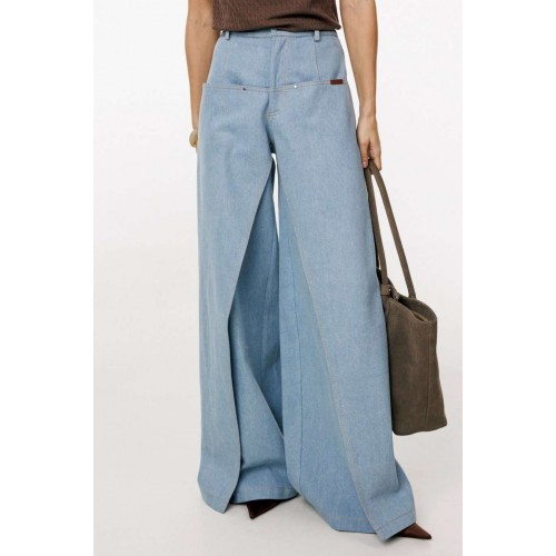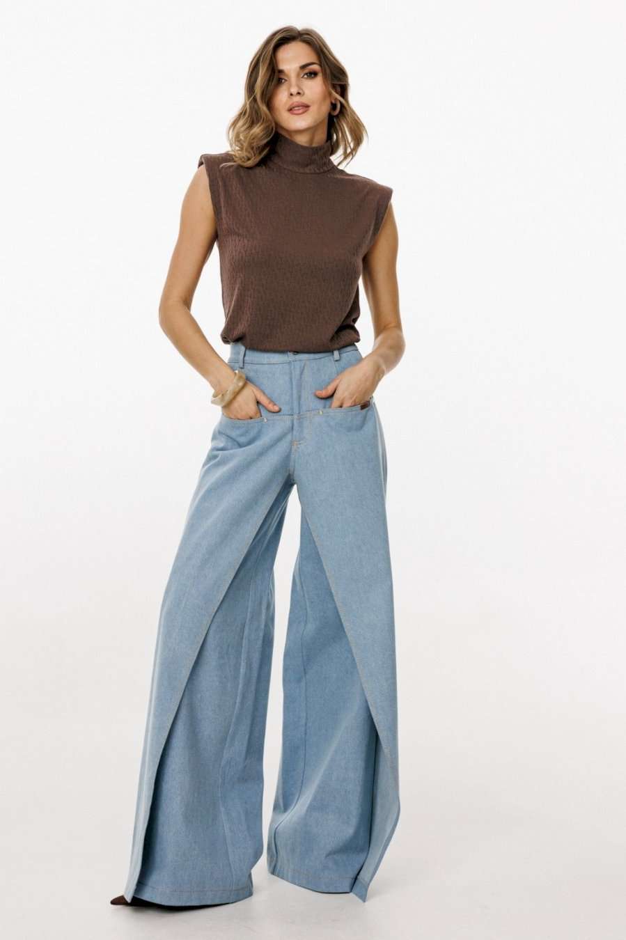 Джинсы-клеш выполнены из плотного джинса. Брюки на притачном поясе, длиной до пола, расширенные к низу. Спереди верхние отлетные части, боковые карманы с фигурным входом. Застежка на пуговицу и молнию с гульфиком. На задних частях кокетки и накладные карманы. По переду брюки декорированы брендированной нашивкой из натуральной кожи. Длина брюк: р.44-48 - 102 см, р. 50-54 - 103,5 см БРЮКИ м. 3044 44 46 48 50 52 54 Длина сбоку с поясом 110 110 110 111,5 111,5 111,5 Объем по талии 64-78 68/82 72/86 76/90 80/94 84/98 Объем по бедрам 106 110 114 118 122 126 Ширина пояса 4 4 4 4 4 4